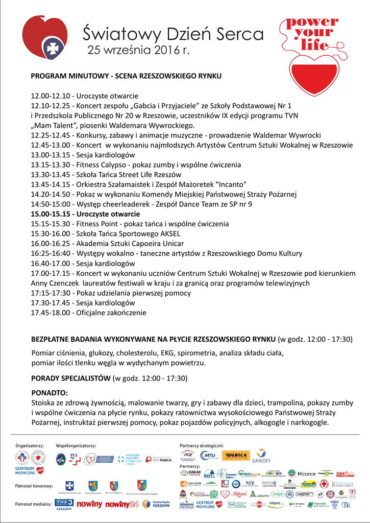 Światowy Dzień Serca 25 września 2016 r. PROGRAM MINUTOWY - SCENA RZESZOWSKIEGO RYNKU 12.00-12.10 - Uroczyste otwarcie 12.10-12.25 - Koncert zespołu „Gabcia i Przyjaciele” ze Szkoły Podstawowej Nr 1 i Przedszkola Publicznego Nr 20 w Rzeszowie, uczestników IX edycji programu TVN „Mam Talent”, piosenki Waldemara Wywrockiego. 12.25-12.45 - Konkursy, zabawy i animacje muzyczne - prowadzenie Waldemar Wywrocki 12.45-13.00 - Koncert w wykonaniu najmłodszych Artystów Centrum Sztuki Wokalnej w Rzeszowie 13.00-13.15 - Sesja kardiologów 13.15-13.30 - Fitness Calypso - pokaz zumby i wspólne ćwiczenia 13.30-13.45 - Szkoła Tańca Street Life Rzeszów 13.45-14.15 - Orkiestra Szałamaistek i Zespół Mażoretek "Incanto" 14.20-14.50 - Pokaz w wykonaniu Komendy Miejskiej Państwowej Straży Pożarnej 14:50-15:00 - Występ cheerleaderek - Zespół Dance Team ze SP nr 9 15.00-15.15 - Uroczyste otwarcie 15.15-15.30 - Fitness Point - pokaz tańca i wspólne ćwiczenia 15.30-16.00 - Szkoła Tańca Sportowego AKSEL 16.00-16.25 - Akademia Sztuki Capoeira Unicar 16:25-16:40 - Występy wokalno - taneczne artystów z Rzeszowskiego Domu Kultury 16.40-17.00 - Sesja kardiologów 17.00-17.15 - Koncert w wykonaniu uczniów Centrum Sztuki Wokalnej w Rzeszowie pod kierunkiem Anny Czenczek laureatów festiwali w kraju i za granicą oraz programów telewizyjnych 17:15-17:30 - Pokaz udzielania pierwszej pomocy 17.30-17.45 - Sesja kardiologów 17.45-18.00 - Oficjalne zakończenie BEZPŁATNE BADANIA WYKONYWANE NA PŁYCIE RZESZOWSKIEGO RYNKU (w godz. 12:00 - 17:30) Pomiar ciśnienia, glukozy, cholesterolu, EKG, spirometria, analiza składu ciała, pomiar ilości tlenku węgla w wydychanym powietrzu. PORADY SPECJALISTÓW (w godz. 12:00 - 17:30) PONADTO: Stoiska ze zdrową żywnością, malowanie twarzy, gry i zabawy dla dzieci, trampolina, pokazy zumby i wspólne ćwiczenia na płycie rynku, pokazy ratownictwa wysokościowego Państwowej Straży Pożarnej, instruktaż pierwszej pomocy, pokaz pojazdów policyjnych, alkogogle i narkogogle.
