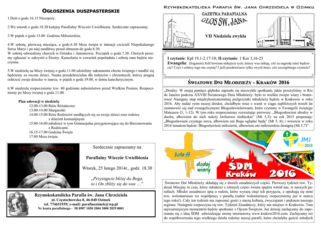 OGŁOSZENIA DUSZPASTERSKIE 1.Dziś o godz.16.15 Nieszpory. 2.We wtorek o godz.18.30 kolejny Parafialny Wieczór Uwielbienia. Serdecznie zapraszamy. VII Niedziela zwykła 3.W piątek o godz.15.00 Godzina Miłosierdzia. 4.W sobotę, pierwszą miesiąca, o godz.6.30 Msza święta w intencji czcicieli Niepokalanego Serca Maryi i po niej modlitwy przed obrazem do godz.8.30. W sobotę odwiedziny chorych w Ozimku i Antoniowie. Początek o godz.7.30. Chorych prosimy zgłaszać w zakrystii u Siostry. Kancelaria w czwartek popołudniu i sobotę rano będzie nieczynna. 5.W niedzielę na Mszy świętej o godz.11.00 udzielimy sakramentu chrztu świętego i modlić się będziemy za roczne dzieci. Nauka przedchrzcielna dla rodziców i chrzestnych, którzy pragną ochrzcić swoje dziecko w marcu, w piątek o godz.19.00, w domu katechetycznym. 6.W niedzielę rozpoczniemy tzw. 40 godzinne nabożeństwo przed Wielkim Postem. Rozpoczniemy po Mszy świętej o godz.11.00. Plan adoracji w niedzielę: 12.00-13.00 Róże Różańcowe 13.00-14.00 Margaretki 14.00-15.00 Róże Rodziców modlących się za swoje dzieci oraz rodzice z dziećmi komunijnymi 15.00-16.00 młodzież w tym Gimnazjalna przygotowująca się do Bierzmowania z Rodzicami. 16.15-17.00 Godzina Święta 17.00 Msza święta. I czytanie: Kpł 19,1-2.17-18; II czytanie: 1 Kor 3,16-23 Ewangelia: (fragment) Jeśli bowiem miłujecie tych, którzy was miłują, cóż za nagrodę mieć będziecie? Czyż i celnicy tego nie czynią? I jeśli pozdrawiacie tylko swych braci, cóż szczególnego czynicie? ŚWIATOWE DNI MŁODZIEŻY - KRAKÓW 2016 „Drodzy. W mojej pamięci głęboko zapisało się niezwykłe spotkanie, jakie przeżyliśmy w Rio de Janeiro podczas XXVIII Światowego Dnia Młodzieży: było to wielkie święto wiary i braterstwa! Następny etap międzykontynentalnej pielgrzymki młodzieży będzie w Krakowie w roku 2016. Aby nadać rytm naszej drodze, chciałbym wraz z wami w ciągu najbliższych trzech lat zastanowić się nad ewangelicznymi Błogosławieństwami, które czytamy w Ewangelii świętego Mateusza (5, 1-12). W tym roku rozpoczniemy rozważając pierwsze: „Błogosławieni ubodzy w duchu, albowiem do nich należy królestwo niebieskie” (Mt 5,3); na rok 2015 proponuję: „Błogosławieni czystego serca, albowiem oni Boga oglądać będą” (Mt 5, 8); i wreszcie w roku 2016 tematem będzie: Błogosławieni miłosierni, albowiem oni miłosierdzia dostąpią (Mt 5,7)”. Serdecznie zapraszamy na Parafialny Wieczór Uwielbienia Wtorek, 25 lutego 2014r., godz. 18.30 „Przystąpcie bliżej do Boga, to i On zbliży się do was …” Rzymskokatolicka Parafia św. Jana Chrzciciela ul. Częstochowska 8, 46-040 Ozimek tel. 774651939; e-mail: [email protected] Nr konta parafialnego - 58 8907 1050 2004 3000 2829 0001 Światowe Dni Młodzieży składają się z dwóch zasadniczych części. Pierwszy tydzień tzw. Tydzień Misyjny to czas, który młodzież z różnych części świata spędza wśród nas, w naszych parafiach. Młodzi zasadniczo śpią u rodzin, które wyrażą chęć ich przyjęcia, a opiekują się nimi tzw. wolontariusze we współpracy z parafią (nabór wolontariuszy rozpoczniemy już w marcu tego roku!). Cały ten tydzień ma zapoznać gości z naszą kulturą, zwyczajami i pięknem naszego regionu. Następnie rozpoczyna się tzw. Tydzień Zasadniczy, który ma miejsce w Krakowie. Tam najważniejszym momentem będzie spotkanie z Ojcem Świętym. Już dzisiaj zachęcamy do zapoznania się z ideą ŚDM odwiedzając stronę internetową www.krakow2016.com. Zachęcamy też do współtworzenia tego wielkiego dzieła rodziny naszej parafii, które chciałyby gościć młodych PORZĄDEK NABOŻEŃSTW NIEDZIELA 23.02 – VII ZWYKŁA 6.45 - Do Bożej Opatrzności z okazji 35 r. ślubu Jagody i Wojciecha Bańkowskich 8.00 - Z podziękowaniem za otrzymane łaski, z prośbą o dalsze Boże Błogosławieństwo w 25 r. ślubu Kornelii i Jacka Dobrowolskich - Za ++ rodziców Stanisławę i Józefa Popów w r. śm. ojca 9.30 - SUMA - Do Bożej Opatrzności z podziękowaniem za otrzymane łaski, z prośbą o Boże Błogosławieństwo i zdrowie dla Urszuli Erber ok. 70 r. urodzin - Za ++ rodziców Genowefę i Władysława Kowalczyk, Ludwikę i Stanisława Janik i ++ z pokrewieństwa z obu stron 11.00 - Za + męża i ojca Jana Waligórskiego w r. śm., za synową Grażynę i rodziców z obu stron - Za + ojca Franciszka w r. śm., ojca Józefa, brata Mariana, Pawła, teścia, szwagrów, dziadków z obu stron 15.00 - Szpital - W intencji pracowników Radia Maryja o Boże Błogosławieństwo dla całej Rodziny Radia Maryja 16.15 - NIESZPORY 17.00 - Za ++ rodziców Józefa i Helenę Adamski, + męża Alfreda oraz za ++ z pokrewieństwa PONIEDZIAŁEK 24.02 6.30 - Za + Lucjana Mularczyka ( od brata Kazimierza z rodziną ) 17.00 - O zdrowie i Boże Błogosławieństwo w 4 r. urodzin Pawła i w dniu urodzin za + męża, ojca i dziadka Alfonsa Bacik WTOREK 25.02 6.30 - Za ++ rodziców Janinę i Władysława w r. śm., i wszystkich ++ z rodzin Radosz i Wiśniewski 18.00 - Za + matkę Marię Feliks w 1 r. śm. ŚRODA 26.02 6.30 - Za + męża Lucjana Drozd, rodziców Gertrudę i Jana Zimniok, teściów Cecylię i Pawła Drozd, brata Norberta, bratowe Erykę i Łucję, Dariusza i Annę, szwagrów Pawła i Stefana oraz ++ z rodzin Rajman i Bernhard 18.00 - 30 dzień : Arseniusz Lalic, Bogumił Kościarz, Lucjan Mularczyk, Elfryda Jagusz, Anna Tarnowska, Barbara Machnik, Herbert Lepsy CZWARTEK 27.02 6.30 - Za + Mariannę Król w 10 r. śm., za + ojca i brata Tadeusza, za ++ z pokrewieństwa Widera i Król i d. cz. 18.00 - Za + Mirosława Dota w dniu imienin - Za ++ rodziców z obu stron Stanisławę i Romana Wojda, Franciszkę i Antoniego Pawłowski, brata Mariana, 2 bratowe Bogusławę i Janinę, szwagierki Stanisławę, Sabinę, Zofię, szwagra Franciszka, + siostrzeńca Mariusza Stelmaszczyk oraz d. cz. PIĄTEK 28.02 6.30 - Za + brata Ryszarda Gór
