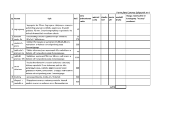 Formularz Cenowy Załącznik nr 4 Lp. Nazwa 1 Opis Segregator A4 75mm. Segregator oklejony na zewnątrz poliolefiną,wewnątrz wyklejka papierowa. Grubośd segregatory grzbietu: 75 mm. Z wymienną etykietą na grzbiecie. Na dolnych krawędziach metalowe okucia. Ilość 45 2 koszulki 3 papier A4 15 150 4 500 5 Koszulka krystaliczna U (pakowana po 100 sztuk) 80 g/m2, 500 arkuszy Ulotka informacyjna o wymiarach 14,80x 21,00 cm z ulotki inf.nadrukiem w kolorze o treści podanej przez prom Zamawiającego tablice inf.- Tablica informacyjna o wymiarach A3 z nadrukiem w promocyjne kolorze o treści podanej przez Zamawiającego naklejki Naklejka o wymiarach 90mm x 54mm z nadrukiem w 6 promoc - UE kolorze o treści podanej przez Zamawiającego 40 1000 7 składane Teczka skrzydłowa A4 z rzepem wykonana z twardej tektury o grubości 2 mm kolorowa, pokryta folią polipropylenową, wyklejka papierowa szerokośd grzbietu do 40mm, zamykana na 2 rzepy z nadrukiem w kolorze o treści podanej przez Zamawiającego 600 8 bruliony oprawa półtwarda, kratka, A5, 96 kartek 600 Długopis wykonany z matowego metalu. Nadruk zgodnie z wzorem podanym przez Zamawiającego 600 teczki długopis z 9 nadrukiem cena wartość stawka kwota wartość jednostkowa netto VAT VAT brutto netto suma Uwagi, ewentualnie nr katalogowy / nazwa/ producent