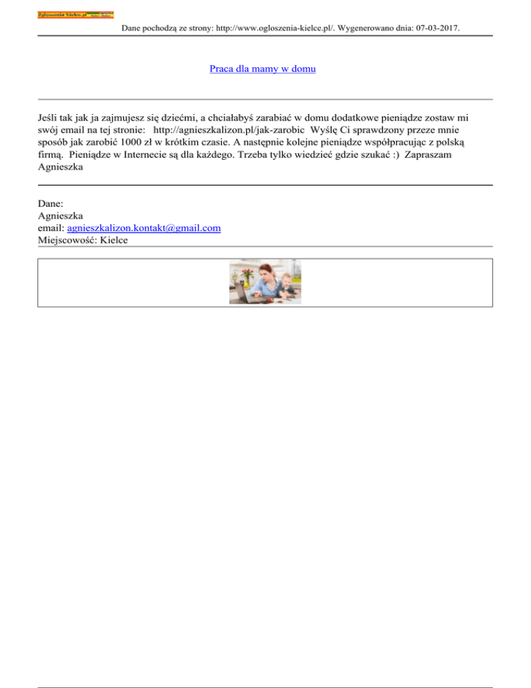 Dane pochodzą ze strony: http://www.ogloszenia-kielce.pl/. Wygenerowano dnia: 07-03-2017. Praca dla mamy w domu Jeśli tak jak ja zajmujesz się dziećmi, a chciałabyś zarabiać w domu dodatkowe pieniądze zostaw mi swój email na tej stronie: http://agnieszkalizon.pl/jak-zarobic Wyślę Ci sprawdzony przeze mnie sposób jak zarobić 1000 zł w krótkim czasie. A następnie kolejne pieniądze współpracując z polską firmą. Pieniądze w Internecie są dla każdego. Trzeba tylko wiedzieć gdzie szukać :) Zapraszam Agnieszka Dane: Agnieszka email: [email protected] Miejscowość: Kielce