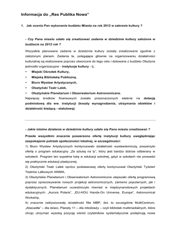 Informacja do „Res Publika Nowa” 1. Jak ocenia Pan wykonanie budżetu Miasta na rok 2012 w zakresie kultury ? - Czy Pana miastu udało się zrealizować zadania w dziedzinie kultury założone w budżecie na 2012 rok ? Wszystkie planowane zadania w dziedzinie kultury zostały zrealizowane zgodnie z założonym planem. Zadania te, polegające głównie na organizowaniu działalności kulturalnej są realizowane poprzez utworzone do tego celu i dotowane z budżetu Olsztyna jednostki organizacyjne - instytucje kultury - tj.: • Miejski Ośrodek Kultury, • Miejską Bibliotekę Publiczną, • Biuro Wystaw Artystycznych, • Olsztyński Teatr Lalek, • Olsztyńskie Planetarium i Obserwatorium Astronomiczne. Najwięcej środków finansowych zostało przeznaczonych właśnie na dotację podmiotową dla ww. instytucji (koszty wynagrodzenia, utrzymania obiektów i działalność bieżącą - statutową). - Jakie istotne działania w dziedzinie kultury udało się Pana miastu zrealizować ? Przede wszystkim znacznie poszerzono ofertę instytucji kultury uwzględniając zaspokajanie potrzeb społeczności lokalnej, w szczególności: 1) Biuro Wystaw Artystycznych kontynuowało działalność wystawienniczą, poszerzyło ofertę o program edukacyjny „Ze sztuką na ty”, który jest bardzo dobrze odbierany w szkołach. Program ten wypełnia lukę w edukacji szkolnej, gdyż w szkołach nie prowadzi się praktycznie edukacji plastycznej. 2) Olsztyński Teatr Lalek oprócz podstawowej oferty kontynuował Olsztyński Tydzień Teatrów Lalkowych ANIMA, 3) Olsztyńskie Planetarium i Obserwatorium Astronomiczne ulepszało ofertę programową poprzez opracowywanie nowych projekcji astronomicznych, zarówno popularnych, jak i dydaktycznych. Planetarium uczestniczyło również w międzynarodowych projektach edukacyjnych: „Aurora Polaris”, „EU-HOU Hands-On Universe, Europe”, Astronomical Workship, 4) znacznie zaktywizowały działalność filie MBP, dot. to szczególnie MultiCentrum, „Abecadła” – dla dzieci, Planety 11 – dla młodzieży – czyli bibliotek multimedialnych, które chcąc utrzymać wysoką pozycję wśród czytelników systematycznie podejmują nowe inicjatywy i uczestniczą w nowych programach, np. w ramach wolontariatu europejskiego, finansowanego z programu „Młodzież w działaniu”, Światowych Dniach Bajki, Dniach Literatury Dziecięcej, Festiwalu Filmów Amatorskich SOFFA, 5) Miejski Ośrodek Kultury - znacznie poszerzył działalność m.in. o edukację kulturalną mieszkańców, tj. regionalną i obywatelską, plastyczną, muzyczną, teatralną, taneczną, literacką, medialną, filmową, szczególnie w oparciu o współpracę z organizacjami pożytku publicznego. MOK był koordynatorem specjalnej oferty kulturalno-wydarzeniowej na czas EURO 2012 realizowanej przez różne jednostki pod wspólnym hasłem „OLSZTYN-MIASTO WOLNE OD FUTBOLU”. Akcentem wiodącym było odwołanie do hasła promocyjnego „Olsztyn. O!gród z natury”. W tym duchu na czas Euro (8 czerwca-1 lipca) zmienił się wygląd olsztyńskiej starówki. Liczne atrakcje zapewniły ogrody tematyczne na starówce – specjalnie zaaranżowane przestrzenie miejskie. Były zatem ogrody literatury, uliczki sztuki, ogród dla najmłodszych i inne. Wszystkie wypełnione ofertą kulturalną, warsztatami, happeningami, imprezami kulinarnymi. W tym czasie trwało także „Olsztyńskie Lato Artystyczne”. To przegląd rozmaitych form twórczości – od poezji, poprzez występy ulicznych teatrów, po niemal wszystkie gatunki muzyczne, dzięki któremu latem olsztyńska starówka tętni życiem praktycznie bez przerwy. W czasie Euro 2012 miasto oferowało także pakiet „Olsztyn. Aktywnie!”. To aż 20 ogólnodostępnych dyscyplin rekreacyjnych – kajakarstwo, rajdy rowerowe krótkie i długie, kolarstwo grawitacyjne, nordic walking, marszobiegi, spacery z przewodnikiem, smocze łodzie, „spacery podwodne” czyli nurkowanie, golf, parki linowe, joga& pilates, tai chi, kolarstwo górskie, pływanie, żeglarstwo, strzelectwo, jeździectwo, boks i spinning. Urząd Miasta i Miejska Biblioteka Publiczna realizowały projekt „Antologia Warmińska” – kreacja i promocja nowej marki regionu. W ramach projektu ukazał się m.in. audiobook Antologia Warmińska. Warmia w baśniach, podaniach i legendach, który wzbogaca wiedzę mieszkańców (tych najmłodszych) województwa warmińsko- mazurskiego o dziedzictwie kulturowym Warmii, - współorganizowano imprezy, podczas których promowane były osiągnięcia nauki i sztuki, np. Olsztyńskie Dni Nauki i Sztuki, - realizowano cykl przedsięwzięć mających na celu upowszechnianie historii Olsztyna i osoby Mikołaja Kopernika np. Urodziny Miasta, Urodziny Kopernika,„Czwartki z Kopernikiem”, Noc w Muzeum, Niedziele w Muzeum itp. - promowano lokalną twórczość i debiuty artystycznye poprzez pomoc finansową w wydawaniu dorobku rodzimych twórców, czy to poprzez kolejne tomiki wierszy, czy kolejnych numerów pisma „Borussia. Kultura-Historia-Literatura”, płyt CD, - wspierano finansowo organizację wystaw i sztukę współczesnej: np. wystaw ZPAP, wystaw Stowarzyszenia „Sąsiedzi”, ogólnopolskiego projektu „Znaki czasu” – tworzenie kolekcji sztuki współczesnej w regionie warmińsko-mazurskim przez WarmińskoMazurskie Towarzystwo Zachęty Sztuk Pięknych, - dofinansowano udział w prestiżowych międzynarodowych konkursach, przeglądach zespołów chóralnych – Olsztyński Chór Kameralny „Collegium Musicum”, Chór ProForma, Festiwal „O Warmio moja miła” im. Feliksa Nowowiejskiego; - prowadzono i wspierano finansowo edukację kulturalną mieszkańców poprzez: organizację warsztatów i konkursów kultury żywego słowa pt. „Olsztyn miastem sztuki słowa”, prowadzenie szkolnych galerii sztuki i wydawanie publikacji; - organizowano happeningi, np. „EuroBaba” nawiązujące do historii Olsztyna z czasów staroprusk