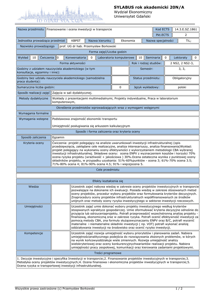 SYLABUS rok akademicki 20N/A Wydział Ekonomiczny Uniwersytet Gdański Nazwa przedmiotu Finansowanie i ocena inwestycji w transporcie Jednostka prowadząca przedmiot Nazwisko prowadzącego KBPST Nazwa kierunku Ekonomia Kod ECTS 14.3.E.SZ.1861 Pkt.ECTS 2 Nazwa specjalności TiL; prof. UG dr hab. Przemysław Borkowski Forma zajęć/Liczba godzin Wykład 10 Ćwiczenia 0 Konwersatoria 0 Laboratoria komputerowe Forma aktywności 10 Sumaryczna liczba godzin: 0 0 Lektoraty Rok i rodzaj studiów: 2 NS2, 2 NS2-3, Semestr: 3, 3, Status przedmiotu: Obligatoryjny Język wykładowy: polski Godziny z udziałem nauczyciela akademickiego (w tym konsultacje, egzaminy i inne): Godziny bez udziału nauczyciela akademickiego (samodzielna praca studenta): Seminaria 0 Sposób realizacji zajęć Zajęcia w sali dydaktycznej. Metody dydaktyczne Wykłady z prezentacjami multimedialnymi, Projekty indywidualne, Praca w laboratorium komputerowym, Określenie przedmiotów wprowadzających wraz z wymogami wstępnymi Wymagania formalne Wymagania wstepne Podstawowa znajomość ekonomiki transportu Umiejętność posługiwania się arkuszem kalkulacyjnym Sposób i forma zaliczenia oraz kryteria oceny Sposób zaliczenia Kryteria oceny Egzamin Ćwiczenia: projekt polegający na analizie uwarunkowań inwestycji infrastrukturalnej (opis przedsięwzięcia, zakłądane cele realizacyjne, analiza interesariuszy, analiza finansowania)Wykład: projekt polegający na wykonaniu oceny efektywności z wykorzystaniem metodologii CBA wybranej inwestycji infrastrukturalnej. Składowe oceny: ocena ENPV z wyznaczeniem kosztów i korzyści 70% ocena ryzyka projektu (wrażliwość + jakościowa ) 30%.Ocena ostateczna wynika z punktowej oceny składników projektu, w przypadku uzyskania: 51%-60%punktów - ocena 3; 61%-70% ocena 3.5; 71%-80% ocena 4; 81%-90% ocena 4.5; 91% i więcejocena 5. Cele przedmiotu Efekty kształcenia się Wiedza Uczestnik zajeć nabywa wiedzę w zakresie oceny projektów inwestycyjnych w transporcie pozwalające na dokonanie ich ewaluacji. Posiada wiedzę w zakresie stosowanych metod oceny projektów, procedur wyboru projektów oraz formułowania kryteriów decyzyjnych. Znaprocedury oceny projektów infrastrukturalnych współfinansowanych ze środków unijnych oraz metody oceny ryzyka inwestycyjnego w sektorze inwestycji rzeczowych. Umiejętności Uczestnik zajęć umie dokonać wyboru projektu inwestycyjnego według kryteriów stospwanych wpraktyce gospodarczej. Umie sformułować kryteria decyzyjne odnośnie do przyjęcia lub odrzuceniaprojektu. Potrafi przeprowadzić wszechstronną analizę projektu finansową, ekonomiczną oraz w zakresie ryzyka. Potrafi ocenić efektywność inwestycji za pomocą metody CBA, zna formuły służącewyznaczaniu ENPV oraz B/C, potrafi wycenić materialne i niematerialne składniki inwestycji ( np. VOT) potrafi wykonać analizę oddziaływania inwestycji na środowisko oraz ocenić ryzyko inwestycji. Kompetencje Uczestnik zajęć rozwija umiejętność wyboru priorytetów i planowania zadań. Nabiera umiejętnościanalitycznego podejścia do rozwiązywania złożonych problemów, w kórych na wynik końcowyoddziałuje wiele zmiennych. Rozwija umiejętność analizy wielokryteriowej oraz oceny konkurencyjnychwariantów realizacji projektu. Nabiera umiejętności pracy zespołowej, komunikacji oraz kierowania zadaniami projektowymi. Treści programowe 1. Decyzje inwestycyjne i specyfika Inwestycji w transporcie;2. Finansowanie projektów inwestycyjnych w transporcie;3. Metodyka oceny projektów inwestycyjnych;4. Ocena finansowa i ekonomiczna projektów inwestycyjnych w transporcie;5. Ocena ryzyka w transportowej inwestycji infrastrukturalnej. Wszystkie prawa zastrzeżone (c) Przemysław Borkowski 1/2 SYLABUS rok akademicki 20N/A Wydział Ekonomiczny Uniwersytet Gdański Wykaz literatury podstawowej i uzupełniającej 1. P.Borkowski, Metody obiektywizacji oceny ryzyka w inwestycjach infrastrukturalnych w transporcie, WUG , Gdańsk 2013. 2. Instrukcja oceny efektywności ekonomicznej przedsięwzięć drogowych i mostowych dla dróg wojewódzkich, IBDiM,Warszawa 2008. Uzupełniająca: 1. P.Borkowski Zagrożenia i ryzyko związane z realizacją projektów inwestycyjnych, w: Podręcznik zarządzania projektem infrastrukturalnym w ramach Programu Operacyjnego Infrastruktura i Środowisko, Ministerstwo Środowiska, Warszawa 2010. 2. K. Dziworska, Decyzje inwestycyjne przedsiębiorstw, WUG, Gdańsk 2000. 3. K.van der Berg, Podręcznik przygotowania studium wykonalności dla małych projektów infrastrukturalnych w zakresie lokalnej infrastruktury transportowej, Haga 2001. 4. Formy i metody finansowania infrastruktury transportu w Polsce. Problemy optymalizacji systemu finansowania infrastrukturytransportu. Monografia pod red. A.S. Grzelakowskiego. Wydawnictwo Akademii Morskiej w Gdyni, Gdynia 2005.5. P.Borkowski, Ryzyko w działalnosci przedsiebiorstw, WUG, Gdansk 2008W. Rogowski: Rachunek efektywności przedsięwzięć inwestycyjnych. Oficyna Ekonomiczna, Kraków 20046. L. Czechowski, K. Dziworska, T.Gostowska- Drzewicka, A. Gorczyńska, E. Ostrowska, Projekty inwestycyjne - finansowanie, metody i procedury oceny. ODDK, Gdańsk 1999.7. Źródła internetowe:Komisja Europejska: http://europa.eu.int/comm/transport/index_en.html ;DG TREN UE http://ec.europa.eu/dgs/energy_transport; EUROSTAT: http://ec.europa.eu/eurostat;Ministerstwo Infrastruktury: http://www.mi.gov.pl/; GDDKiA: http://www.gddkia.gov.pl/; Ministerstwo Finansów:http://www.mofnet.gov.pl/ ; Fundusze Strukturalne: http://www.funduszestrukturalne.gov.pl/ EBI:http://www.eib.org/ ;EBOR: http://www.ebrd.com/; Bank Światowy: http://www.worldbank.org Kontakt [email protected], Wszystkie prawa zastrzeżone (c) Przemysław Borkowski 2/2