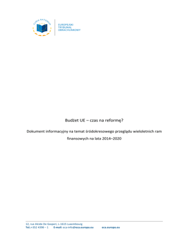 Budżet UE – czas na reformę? Dokument informacyjny na temat śródokresowego przeglądu wieloletnich ram finansowych na lata 2014–2020 12, rue Alcide De Gasperi, L-1615 Luxembourg Tel.:+352 4398 – 1 E-mail: [email protected] eca.europa.eu 2 SPIS TREŚCI Punkt Wstęp 1-6 Dokument informacyjny Trybunału 1-2 Szansa na zreformowanie budżetu UE 3-6 Dokonany przez Komisję śródokresowy przegląd wieloletnich ram finansowych na lata 2014–2020 7-51 Stan wdrożenia bieżących WRF i nowe wyzwania 7-18 Potrzeba więcej dowodów, by przeprowadzić debatę na temat reformy 7-9 Ryzyko, że historia może się powtórzyć 10-14 Należy dokonać kompleksowego przeglądu wydatków unijnych, zanim przyjęty zostanie nowy budżet długoterminowy 15-18 Uwagi na temat głównych wniosków przedstawionych w przeglądzie śródokresowym Komisji 19-33 Dalsze ukierunkowanie na priorytety i nowe wyzwania? 20-26 Poprawa elastyczności i sprawności w zakresie uruchamiania i dostarczania środków? 27-30 Prostsze przepisy i większe zorientowanie na wyniki? 31-33 W kierunku następnych wieloletnich ram finansowych 34-51 Kwestie podniesione przez Komisję 35-47 Ogólne mechanizmy finansowania 48-51 Wnioski i propozycje 52-57 Propozycja 1 – Należy ponownie rozważyć harmonogram prac nad kolejnymi WRF 54 Propozycja 2 – Należy dokonać kompleksowego przeglądu wydatków UE 55 Propozycja 3 – Należy opracować jaśniejsze, prostsze i spójniejsze mechanizmy finansowania 56 Propozycja 4 – Unijne priorytety budżetowe należy poddać pod dyskusję na wysokim szczeblu 57 CLV087241PL04-16PP-DEC103-16FIN-mid-term_review_MFF-TR.docx 18.11.2016 3 WSTĘP Dokument informacyjny Trybunału 1. Niniejszy dokument został sporządzony w odpowiedzi na komunikat Komisji w sprawie śródokresowego przeglądu/rewizji wieloletnich ram finansowych na lata 2014-2020 (WRF), jak również na wnioski o zmianę rozporządzenia w sprawie WRF, porozumienia międzyinstytucjonalnego i decyzji w sprawie uruchomienia marginesu na nieprzewidziane wydatki 1. Trybunał ustosunkuje się w odpowiednim czasie do pozostałych wniosków ustawodawczych wchodzących w skład pakietu przedstawionego w przeglądzie śródokresowym 2. 2. Trybunał koncentruje się na budżetowych aspektach funkcjonowania WRF objętych śródokresowym przeglądem/rewizją i zachęca unijne organy polityczne, ustawodawcze i budżetowe do skorzystania z okazji w tej kadencji, by zapoczątkować długofalową reformę budżetu UE. Uwagi Trybunału dotyczą poszczególnych głównych sekcji komunikatu, tj. stanu wdrożenia WRF na lata 2014-2020, wniosków ustawodawczych z pakietu objętego przeglądem śródokresowym oraz kwestii, jakie należy uwzględnić we wniosku w sprawie kolejnych WRF. Szansa na zreformowanie budżetu UE 3. Śródokresowy przegląd/rewizja WRF na lata 2014-2020 stanowi okazję do rozważenia, w jaki sposób ulepszyć zarządzanie finansami i rozliczalność oraz stworzyć system budżetowy UE w takim kształcie, by odzyskać zaufanie obywateli. 4. Opierając się na swych doświadczeniach z prac kontrolnych, których wyniki prezentowane są w sprawozdaniach rocznych i sprawozdaniach specjalnych, Trybunał jest przekonany, że nadszedł czas, by wypracować nowe podejście do wydatkowania 1 COM(2016) 603 final, COM(2016) 606 final i COM(2016) 607 final. 2 Obecnie trwają prace nad opiniami w sprawie wniosków o zmianę rozporządzenia finansowego (nr 966/2012) oraz wniosku o zmianę rozporządzenia EFIS (nr 2015/1017). CLV087241PL04-16PP-DEC103-16FIN-mid-term_review_MFF-TR.docx 18.11.2016 4 i inwestowania środków UE. Celem takiej reformy powinno być ulepszenie systemu budżetowego UE, tak by: - umożliwiał ukierunkowanie środków unijnych w szybki i elastyczny sposób na obszary, w których mogą one wnieść największą wartość dodaną dla UE i jej obywateli; - zapewniał środki finansowe i rezultaty w sposób wydajny, bez nadmiernego ryzyka; - za jego pośrednictwem można było wykazać, w jaki sposób UE finansuje poszczególne obszary polityki i przyczynia się do osiągania rezultatów. 5. W bieżących WRF realizacja tych celów nie jest łatwa. Na obecnym etapie możliwości Komisji, by zaproponować zmianę priorytetów wydatkowania środków UE i zmodyfikować przepisy finansowe, są znacznie ograniczone z uwagi na fakt, że: - obecne wieloletnie ramy finansowe odzwierciedlają unijne priorytety finansowania, jakie obowiązywały w momencie przyjmowania tych ram; - rozporządzenie w sprawie WRF ogranicza możliwości dokonywania zmian w trakcie okresu ich obowiązywania 3; - w wyniku znacznych opóźnień dopiero co przystąpiono do realizacji siedmioletnich programów wydatkowania na lata 2014-2020; - budżet UE balansuje na granicy maksymalnych wydatków. 6. W tym kontekście Komisja przedstawia wnioski mające na celu przeznaczenie większej ilości zasobów na bieżące priorytety, uelastycznienie zarządzania budżetem oraz uproszczenie pewnych aspektów przepisów finansowych. 3 Art. 2 rozporządzenia Rady nr 1311/2013 określającego wieloletnie ramy finansowe na lata 2014–2020. CLV087241PL04-16PP-DEC103-16FIN-mid-term_review_MFF-TR.docx 18.11.2016 5 DOKONANY PRZEZ KOMISJĘ ŚRÓDOKRESOWY PRZEGLĄD WIELOLETNICH RAM FINANSOWYCH NA LATA 2014–2020 Stan wdrożenia bieżących WRF i nowe wyzwania Potrzeba więcej dowodów, by przeprowadzić debatę na temat reformy 7. Przedstawione przez Komisję informacje dotyczące „stanu wdrożenia” bieżących WRF skupiają się głównie na prawdopodobnym wykorzystaniu pułapów środków na zobowiązania i płatności oraz odnośnych marginesów do końca 2020 r. Komisja nie przedstawia wystarczających informacji na temat: - sytuacji gospodarczej mającej wpływ na wydatkowanie unijnych środków budżetowych w poszczególnych państwach członkowskich 4, w tym ryzyka, że środki UE: a) nie zostaną w pełni wykorzystane przez państwa członkowskie 5; b) będą wyp