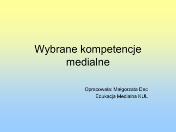 Wybrane kompetencje medialne Opracowała: Małgorzata Dec Edukacja Medialna KUL Etap edukacyjny: Szkoła Podstawowa: klasy 1-3 Spis treści 1. Język mediów 2. Kreatywne korzystanie z mediów 3. Literatura 4. Zakończenie Język mediów a)Językowa natura mediów b)Funkcje komunikatów medialnych c)Kultura komunikacji medialnych Językowa natura mediów Kompetencje medialne: Uczeń: wie, że przekazy audiowizualne nawet prezentujące realnie istniejące postacie różnią się od spotkania w rzeczywistym świecie umie rozróżniać pomiędzy potocznym językiem, a słowami płynącymi z telewizji Językowa natura mediów Kompetencje medialne: Uczeń: zna różne formy przekazów audialnych i audiowizualnych, potrafi wskazywać na różnice między nimi oraz sposobem ich odbioru zna różnice pomiędzy przekazem tekstowym, dźwiękowym i wideo, potrafi wskazać na korzyści i ograniczenia w odbiorze tych przekazów Językowa natura mediów Propozycje kształtowania kompetencji: wykorzystanie podczas zajęć różnego rodzaju przekazów medialnych, np. słuchowisk radiowych, programów telewizyjnych – tematyczna audiowizualna biblioteczka spotkania z aktorami, wywiady z nimi (na żywo i za pośrednictwem telewizji, radia) Funkcje komunikatów medialnych Kompetencje medialne: Uczeń: zna pojęcie reklamy i umie zidentyfikować przekazy reklamowe, które go otaczają: na ulicy, w prasie, telewizji, Internecie umie rozróżnić pomiędzy przekazami medialnymi, które wywołują różne emocje np. strach, smutek radość Funkcje komunikatów medialnych Propozycje kształtowania kompetencji: wykorzystanie podczas zajęć (lekcja wychowawcza, wychowanie komunikacyjne, plastyka, wychowanie prozdrowotne) przekazów reklamowych np. akcji społecznych przy omawianiu filmu zwrócić uwagę na emocje, jakie on wywołał Kultura komunikacji medialnych Kompetencje medialne: Uczeń: umie ocenić dany przekaz medialny w kategoriach estetycznych, uzasadniając swoją opinię umie posługiwać się emotikonami w komunikacji SMSowej i internetowej Zna i rozumie różnice pomiędzy komunikowaniem się pomocą słów i gestów Kultura komunikacji medialnych Propozycje kształtowania kompetencji: Wykorzystanie elementów komunikacji niewerbalnej podczas zajęć z dziećmi np. OK Wykorzystanie emotikonów (szablonów) do komunikowania nastrojów na początek dnia lub po zajęciach Kreatywne korzystanie z mediów a) Tworzenie b) Przetwarzanie c) Prezentowanie Tworzenie Kompetencje medialne: Uczeń: umie przygotować z zastosowaniem prostego sprzętu: zdjęcie, nagranie własnego głosu lub dźwięków otoczenia, nagranie krótkiego filmu wideo, narysować prosty obraz przy użyciu odpowiedniego oprogramowania, napisać krótki tekst w edytorze tekstu Tworzenie Kompetencje medialne: Uczeń: umie, wspólnie z innymi uczniami przygotować prostą opowieść z wykorzystaniem komunikatów medialnych jednego typu; np. serii zdjęć, serii rysunków lub ujęć wideo Przetwarzanie Kompetencje medialne: Uczeń: umie przetwarzać w podstawowym zakresie dostępne treści medialne (zdjęcia, grafikę, filmy wideo, dźwięk) przy użyciu prostego oprogramowania do obróbki treści Wie, że treści analogowe można przekształcić na formę cyfrową, odtwarzaną za pomocą cyfrowych urządzeń Prezentowanie Kompetencje medialne: Uczeń: umie zaprezentować, z wykorzystaniem sprzętu multimedialnego (komputer z rzutnikiem multimedialnym), przygotowane indywidualne lub w grupie treści medialne Kreatywne korzystanie z mediów Propozycje kształtowania kompetencji: na zajęcia z edukacji przyrodniczej wykonanie zdjęć swojej okolicy np. jesienią organizacja szkolnego konkursu fotograficznego: „Jesień w moim mieście” zorganizowanie we współpracy z Radą Rodziców wystawy najciekawszych zdjęć lub wydanie kalendarza Kreatywne korzystanie z mediów Propozycje kształtowania kompetencji: • Program rozrywkowy: Duże dzieci odc. 62: „Po czym można poznać, że film jest dobry?” http://goo.gl/XdbA3m Duże dzieci odc. 69: „Czy radio ma przewagę nad telewizją?” http://goo.gl/TIbrDB Kreatywne korzystanie z mediów Propozycje kształtowania kompetencji: • Program rozrywkowy: Duże dzieci odc. 63 „Jak powinna wyglądać dobra telewizja?” http://goo.gl/M2peMY Duże dzieci odc. 35 „Reklama - kto jest najbardziej podatny? http://goo.gl/OekFb4 Duże dzieci odc. Dodatki: „Dla kogo są seriale? http://goo.gl/8ogChU Duże dzieci odc. 62 „Po co ludzie chodzą do kina?” http://goo.gl/XdbA3m Duże dzieci odc. 21 „Mowa ciała” http://goo.gl/2N9lfW Duże dzieci odc. 45 „Mowa ciała” http://goo.gl/nccE2M Literatura • Cyfrowa przyszłość. Katalog kompetencji medialnych i informacyjnych http://goo.gl/uJCE4l Dostęp 13.01.2015 godz.20.30 Zakończenie • Opracowanie katalogu kompetencji pozwoli na budowę całościowego, spójnego zestawu materiałów dydaktycznych, ale w związku ze stałym rozwojem rzeczywistości i konwergencją mediów kompetencje należy stale uaktualniać i rozwijać • Kompetencje medialne winny być kształtowane szczególnie podczas zajęć z edukacji medialnej, a to wymaga nakładów finansowych i kształcenia nauczycieli, a także mobilizacji i współpracy różnych środowisk odpowiedzialnych za edukację medialną w Polsce