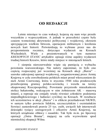 OD REDAKCJI Letnie miesiące to czas wakacji, kojarzą się nam więc przede wszystkim z wypoczynkiem. A jednak w przeszłości często były czasem wzmożonej aktywności politycznej i wojskowej, okresem sprzyjającym wielkim bitwom, operacjom militarnym i kreślenia nowych kart historii. Potwierdzają to wybrane przez nas do przypomnienia rocznice, dotyczące wydarzeń na Kresach Wschodnich. Wiele z prezentowanych w tym numerze KRESOWYCH STANIC artykułów opisuje różne aspekty wydarzeń trudnej historii Kresów, które miały miejsce w miesiącach letnich. 1 sierpnia nierozerwalnie wiąże się pamięcią o wybuchu powstania warszawskiego. Nie należy zapominać, że było ono częścią rozpoczętej już wcześniej na Kresach akcji „Burza” – szeroko zakrojonej operacji wojskowej, zorganizowanej przez Armię Krajową w celu oswobodzenia polskich miast przed wkroczeniem do nich Armii Czerwonej, która w styczniu 1944 roku przekroczyła przedwojenną granicę polsko-sowiecką i weszła na tereny okupowanej Rzeczpospolitej. Powstanie przyniosło mieszkańcom stolicy hekatombę, walczącym w nim żołnierzom AK – masową śmierć, a represje nie omijały wtedy również członków podziemia niepodległościowego i ludności cywilnej na Kresach. W rezultacie ich uczestnictwa w akcji „Burza” i w efekcie prześladowań NKWD, w samym tylko powiecie lidzkim, szczuczyńskim i oszmiańskim Sowieci zamordowali prawie 25 tys. osób, uwięzili lub internowali dziesiątki tysięcy szeregowych i oficerów Armii Krajowej, na których urządzano obławy i zasadzki. Tak było m.in. po lipcowej operacji „Ostra Brama”, mającej na celu wyzwolenie spod niemieckiej okupacji Wilna. KRESOWE STANICE 5 14 sierpnia 1942 roku w Krzemieńcu na Wołyniu z rąk Niemców i Ukraińców zginęło 1,5 tys. Żydów. Dwa i sześć dni później zamordowano ponad drugie tyle ludzi. Wszystkich zabito podczas likwidacji miejscowego getta. Wpisywało się to w szereg zbrodni, jakie w trakcie Holokaustu miały miejsce na Kresach Południowo-Wschodnich. 17 sierpnia 1932 roku otwarto port lotniczy Wilno-Porubanek. Przed wojną obsługiwało on połączenia lotnicze do Warszawy, Rygi oraz Kowna. W 1938 roku przy lotnisku został zorganizowany III Dywizjon Myśliwski 5 Pułku Lotniczego. 23 sierpnia 1919 roku rozpoczęło się, trwające pięć dni powstanie sejneńskie. Zostało ono zorganizowane przez Polską Organizację Wojskową, wydała ona zbrojną walkę Litwinom, którzy korzystając z okazji jaką było wycofanie się z tych terenów oddziałów niemieckich, pozostających tam jeszcze po działaniach z okresu I wojny światowej, próbowali wcielić do swojego państwa Sejneńszczyznę. Powstanie stanowiło preludium do polskiej rozprawy z żądaniami terytorialnymi, głoszonymi przez ówczesny litewski rząd Mykolasa Sleževičiusa. 27 sierpnia 1920 roku, podczas wojny polsko-bolszewickiej, wycofujący się przed Wojskiem Polskim Sowieci przekazali Wilno we władanie Litwinom. Było to wbrew politycznym rozstrzygnięciom popieranym przez Francję i Wielką Brytanię, które forsowały rozwiązania oparte na tzw. linii Focha, pozostawiającej Wilno, a także Nową Wilejkę, Landwarów i Troki w granicach Polski. Pięć dni później wojska litewskie napadły na Suwałki, Sejny i Augustów, zaogniając konflikt z Polakami. Krótkotrwałe, niespełna półtoramiesięczne rządy Litwinów na Wileńszczyźnie zakończył tzw. bunt Żeligowskiego, w wyniku którego formacje polskie zajęły miasto i jego rejon, by po dwóch latach wcielić sporne ziemie do Rzeczpospolitej. 29 sierpnia 1931 roku zamordowany został Tadeusz Hołówko, orędownik porozumienia polsko-ukraińskiego, w podsycanym przez działaczy Organizacji Nacjonalistów Ukraińskich (OUN) konflikcie 6 KRESOWE STANICE narodowościowym. Zginął zamordowany w Truskawcu na Kresach, w znanym w całej Europie uzdrowisku, gdzie odbywał kurację. Jego zabójcami okazali się związani z OUN terroryści, dążącej do destabilizacji państwa polskiego. Na tragiczną śmierć posła BBWR, bliskiego współpracownika Józefa Piłsudskiego, szybko zareagowały gazety, publikujące że Hołówko „najlepsze swoje lata poświęcił walce o unormowanie współżycia z mniejszościami narodowymi w Polsce w sposób niewątpliwie tolerancyjny i liberalny […] kto jak kto, ale Hołówko nigdy nie był symbolem ucisku w stosunku do mniejszości ukraińskiej […] żadną miarą na tak tragiczne przekreślenie swoich szczerze wyznawanych ideałów nie zasłużył”. 1 września 1939 roku rozpoczęła się II wojna światowa. Tego dnia pierwsze niemieckie bomby spadły na miejscowości polskie na Kresach Wschodnich. Samoloty Luftwaffe naprowadzały na cele radiostacje sowieckie, bowiem ZSRS, jako lojalny sojusznik, współdziałał wówczas z III Rzeszą. Oba totalitarne państwa miały wkrótce podzielić między siebie terytoria Rzeczpospolitej. 14 września 1930 roku rozpoczęła się pacyfikacja Małopolski Wschodniej. Wskutek decyzji ówczesnego premiera Józefa Piłsudskiego, wobec wywołanych ukraińskimi działaniami antypaństwowymi akcji sabotażowych w województwie tarnopolskim, lwowskim i stanisławowskim, podjęto starania mające na celu wygaszenie aktów terroru. Aresztowania, rewizje i publiczne chłosty były błahostką wobec zagrożenia ze strony OUN i Ukraińskiej Organizacji Wojskowej (UWO), ale obie te organizacje wykorzystały sytuację dla eskalacji napięć i antagonizmów pomiędzy Polakami a Ukraińcami i podniesienia antypolskiej kampanii za granicą, zwłaszcza w Niemczech. Rzecz obiła się nawet o Ligę Narodów, która stwierdziła jednak, że „Polska nie prowadzi przeciwko Ukraińcom polityki prześladowań i gwałtów”. 17 września 1939 roku Armia Czerwona wkroczyła na Kresy Wschodnie. Jeszcze tej samej doby zajęła m.in. Tarnopol, w następnej Łuck i Kołomyję, a 19 – Stanisławów, Wołkowysk i Szczuczyn. Wtedy te