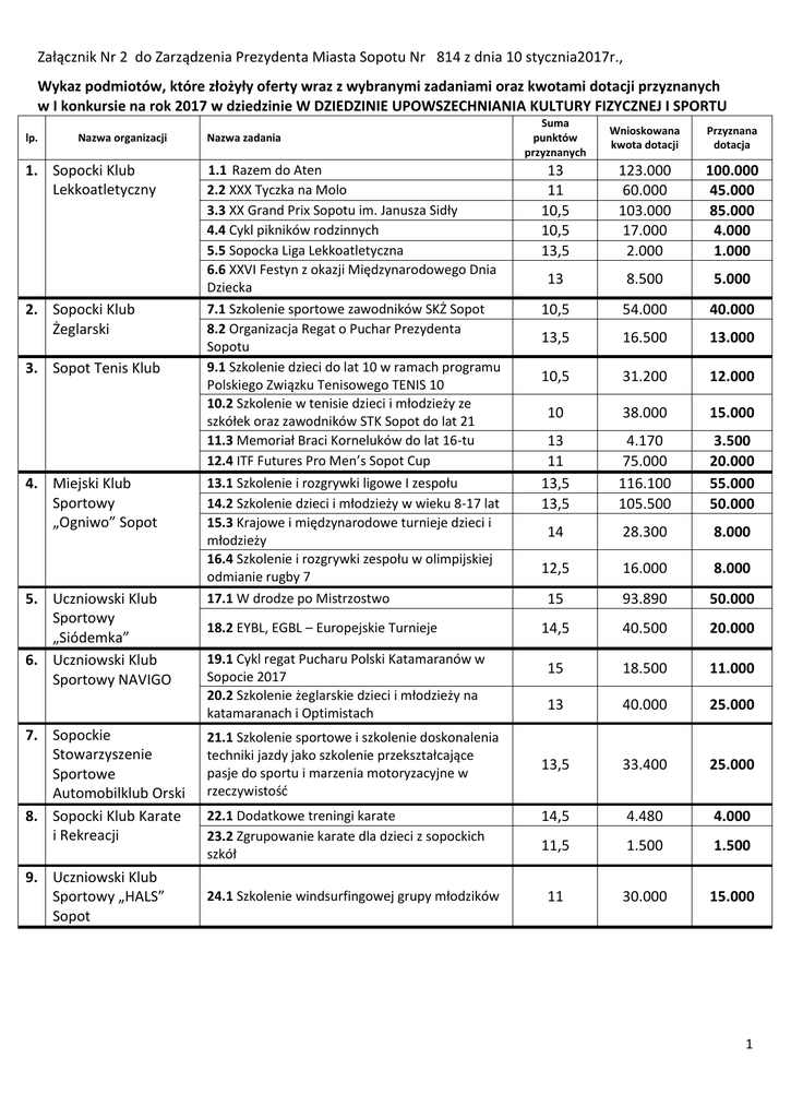 Załącznik Nr 2 do Zarządzenia Prezydenta Miasta Sopotu Nr 814 z dnia 10 stycznia2017r., Wykaz podmiotów, które złożyły oferty wraz z wybranymi zadaniami oraz kwotami dotacji przyznanych w I konkursie na rok 2017 w dziedzinie W DZIEDZINIE UPOWSZECHNIANIA KULTURY FIZYCZNEJ I SPORTU lp. Nazwa organizacji 1. Sopocki Klub Lekkoatletyczny 2. Sopocki Klub Żeglarski 3. Sopot Tenis Klub 4. Miejski Klub Sportowy „Ogniwo” Sopot 5. Uczniowski Klub Sportowy „Siódemka” 6. Uczniowski Klub Sportowy NAVIGO 7. Sopockie Stowarzyszenie Sportowe Automobilklub Orski 8. Sopocki Klub Karate i Rekreacji 9. Uczniowski Klub Sportowy „HALS” Sopot Nazwa zadania 1.1 Razem do Aten 2.2 XXX Tyczka na Molo 3.3 XX Grand Prix Sopotu im. Janusza Sidły 4.4 Cykl pikników rodzinnych 5.5 Sopocka Liga Lekkoatletyczna 6.6 XXVI Festyn z okazji Międzynarodowego Dnia Dziecka 7.1 Szkolenie sportowe zawodników SKŻ Sopot 8.2 Organizacja Regat o Puchar Prezydenta Sopotu 9.1 Szkolenie dzieci do lat 10 w ramach programu Polskiego Związku Tenisowego TENIS 10 10.2 Szkolenie w tenisie dzieci i młodzieży ze szkółek oraz zawodników STK Sopot do lat 21 11.3 Memoriał Braci Korneluków do lat 16-tu 12.4 ITF Futures Pro Men’s Sopot Cup 13.1 Szkolenie i rozgrywki ligowe I zespołu 14.2 Szkolenie dzieci i młodzieży w wieku 8-17 lat 15.3 Krajowe i międzynarodowe turnieje dzieci i młodzieży 16.4 Szkolenie i rozgrywki zespołu w olimpijskiej odmianie rugby 7 17.1 W drodze po Mistrzostwo 18.2 EYBL, EGBL – Europejskie Turnieje 19.1 Cykl regat Pucharu Polski Katamaranów w Sopocie 2017 20.2 Szkolenie żeglarskie dzieci i młodzieży na katamaranach i Optimistach 21.1 Szkolenie sportowe i szkolenie doskonalenia techniki jazdy jako szkolenie przekształcające pasje do sportu i marzenia motoryzacyjne w rzeczywistość 22.1 Dodatkowe treningi karate 23.2 Zgrupowanie karate dla dzieci z sopockich szkół 24.1 Szkolenie windsurfingowej grupy młodzików Suma punktów przyznanych Wnioskowana kwota dotacji Przyznana dotacja 13 11 10,5 10,5 13,5 123.000 60.000 103.000 17.000 2.000 100.000 45.000 85.000 4.000 1.000 13 8.500 5.000 10,5 54.000 40.000 13,5 16.500 13.000 10,5 31.200 12.000 10 38.000 15.000 13 11 13,5 13,5 4.170 75.000 116.100 105.500 3.500 20.000 55.000 50.000 14 28.300 8.000 12,5 16.000 8.000 15 93.890 50.000 14,5 40.500 20.000 15 18.500 11.000 13 40.000 25.000 13,5 33.400 25.000 14,5 4.480 4.000 11,5 1.500 1.500 11 30.000 15.000 1 10. Fundacja Rozwoju Edukacji „Trefl” 11. Sopockie Stowarzyszenie Kulturystyki i Rekreacji 12. Sopocki Klub Sportowy „Atlas” 13. Fundacja im. Andrzeja Grubby 14. Fundacja Sportu i Rekreacji Edwarda Hodury 15. Uczniowski Klub Sportowy „SKOCZEK” 16. Stowarzyszenie „Trivium – Edukacja, Wychowanie, Profilaktyka” 17. Młodzieżowe Towarzystwo Sportowe „Junior” 18. Stowarzyszenie na Drodze Ekspresji 19. Towarzystwo Sportowe Sopocki Potok Kamionka 25.1 Od szkoły Mistrzostwa Sportowego przy V LO Sopocie do Polskiej Ligi Koszykówki i reprezentacji Polski. Rozgrywki juniorów U-18 26.2 Organizacja zimowego obozu dochodzeniowego dla podopiecznych Fundacji Rozwoju Trefl 27.3 Od szkoły Mistrzostwa Sportowego przy V LO w Sopocie do Polskiej Ligi Koszykówki i reprezentacji Polski. Rozgrywki juniorów starszych U-20 28.1 Organizowanie i prowadzenie zajęć sportowo-szkoleniowych w klubach sportowych dla dzieci i młodzieży sopockiej, organizowanych przez Sopockie Stowarzyszenie Kulturystyki i Rekreacji 29.2 Organizacja imprez sportowo-rekreacyjnych na terenie Miasta Sopotu – w sopockich szkołach podstawowych 30.3 Starty w zawodach w kulturystyce, fitness sylwetkowym i gimnastycznym 31.4 Zawody na Molo oraz weekend sportowy 32.1 Koszty prowadzenia szkolenia, zgrupowania i wyposażenia w sprzęt sekcji sportowej taekwondo WTF 15 45.900 22.000 15 10.000 6.000 15 48.500 25.000 12 54.400 13.000 13,5 5.508 1.800 11,5 16.800 1.000 13 8.410 1.000 13,5 15.000 10.000 33.1 XI Memoriał Andrzeja Grubby 13,5 16.300 11.000 34.1 XXV Jubileuszowy Memoriał Edwarda Hodury 13,5 67.100 15.000 35.1 Szkolenie sportowe dzieci i młodzieży w tenisie stołowym, udział w zawodach sportowych rangi wojewódzkiej, strefowe i ogólnopolskiej 13,5 32.400 15.000 36.1 Program Rekreacyjno – Sportowy Skierowany Do Sopockiej Młodzieży Moduł Na Rok 2017 „Agon” 13,5 29.840 20.000 14 36.000 13.000 14 24.000 11.000 39.1 XIII Integracyjny Turniej Tenisa Stołowego o Puchar Prezydenta Sopotu 14 7.700 3.500 40.1 Szkolenie dzieci i młodzieży w piłce siatkowej 13 40.500 13.000 37.1 „Sopockie Lekkoatletyczne Talenty Olimpijskie” 38.2 Przygotowanie i start w MP w LA w kategoriach młodzieżowych 2 41.1 Szkolenie piłkarskie oraz reprezentacja 20. Pomorska Drużyna Piłkarska „Karlikowo” Miasta Sopot przez 5 drużyn juniorskich w rozgrywkach pod patronatem Pomorskiego Sopot 15 42.732 5.000 15 16.000 5.000 43.1 Piłka nożna – rozwój sprawności fizycznej dzieci 13 42.362,80 0 44.1 Zgrupowania sportowe curlingu dla dzieci i młodzieży 14 14.000 4.000 Związku Piłki Nożnej 42.2 Piłkarski obóz szkoleniowy w Przodkowie dla sopockich dzieci 21. Klub Sportowy Unia Sopot 22. Sopot Curling Club Wa ku’ta 23. Sopocki Klub Jeździecki 45.1 Międzynarodowe Zawody CSIO***** 46.2 Międzynarodowe Zawody w WKKW 47.3 Finał Pucharu Jump OFF Hipodrom 48.4 Wsparcie finansowe organizowanych zajęć sportowo-szkoleniowych OFERTY ZŁOŻONE PO TERMINIE!! SUMA: 811.300 Jacek Karnowski Prezydent Miasta Sopotu 3