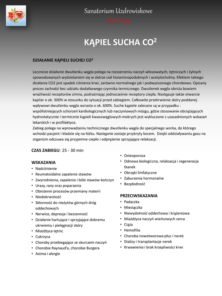Sanatorium Uzdrowiskowe MALWA KĄPIEL SUCHA CO2 DZIAŁANIE KĄPIELI SUCHEJ CO2 Lecznicze działanie dwutlenku węgla polega na rozszerzeniu naczyń włosowatych, tętniczych i żylnych spowodowanych wydzielaniem się w skórze ciał histaminopodobnych i acetylocholiny. Efektem takiego działania CO2 jest spadek ciśnienia krwi, zarówno normalnego jak i podwyższonego chorobowo. Opisany proces zachodzi bez udziału dodatkowego czynnika termicznego. Dwutlenek węgla obniża bowiem wrażliwość receptorów zimna, podrażniając jednocześnie receptory ciepła. Następuje także otwarcie kapilar o ok. 300% w stosunku do sytuacji przed zabiegiem. Całkowite przekrwienie skóry poddanej wpływowi dwutlenku węgla wzrasta o ok. 600%. Suche kąpiele zalecane są w przypadku : współistniejących schorzeń kardiologicznych lub naczyniowych mózgu, gdzie stosowanie obciążających hydrostatycznie i termicznie kąpieli kwasowęglowych mokrych jest wykluczone z uzasadnionych wskazań lekarskich i w profilaktyce. Zabieg polega na wprowadzeniu technicznego dwutlenku węgla do specjalnego worka, do którego wchodzi pacjent i kładzie się na łóżku. Następnie zostaje przykryty kocem. Dzięki oddziaływaniu gazu na organizm odczuwa się przyjemne ciepło i odprężenie sprzyjające relaksacji. CZAS ZABIEGU: 25 - 30 min WSKAZANIA • • • • • • • • • • • • • • Nadciśnienie Reumatoidalne zapalenie stawów Zwyrodnienia, zapalenia i bóle stawów kończyn Urazy, rany oraz poparzenia Obniżenie procesów przemiany materii Niedokrwistość Skłonność do nieżytów górnych dróg oddechowych Nerwice, depresja i bezsenność Działanie hartujące i sprzyjające dobremu ukrwieniu i pielęgnacji skóry Miażdżyca tętnic Cukrzyca Choroby przebiegające ze skurczem naczyń Chorobie Raynaud’a, chorobie Burgera Astma i alergie • Osteoporoza • Odnowa biologiczna, relaksacja i regeneracja tkanek • Obrzęki limfatyczne • Zaburzenia hormonalne • Bezpłodność PRZECIWSKAZANIA • • • • • • • • • Padaczka Miesiączka Niewydolność oddechowa i krążeniowa Miażdżyca naczyń wieńcowych serca Ciąża Hemofilia Choroba nowotworowa płuc i nerek Dializy i transplantacje nerek Krwawienia i brak krzepliwości krwi