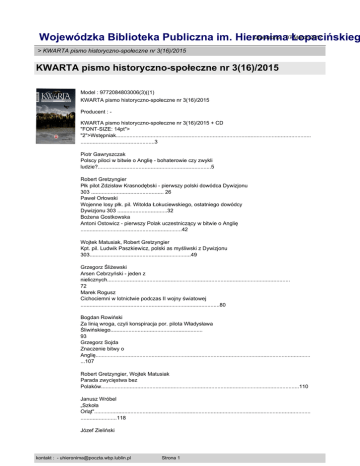 Utworzono : 07Łopacińskieg March 2017 Wojewódzka Biblioteka Publiczna im. Hieronima > KWARTA pismo historyczno-społeczne nr 3(16)/2015 KWARTA pismo historyczno-społeczne nr 3(16)/2015 Model : 9772084803006(3)((1) KWARTA pismo historyczno-społeczne nr 3(16)/2015 Producent : KWARTA pismo historyczno-społeczne nr 3(16)/2015 + CD "FONT-SIZE: 14pt"> "2">Wstępniak................................................................................................................................. .................................................3 Piotr Gawryszczak Polscy piloci w bitwie o Anglię - bohaterowie czy zwykli ludzie?...........................................................................5 Robert Gretzyngier Płk pilot Zdzisław Krasnodębski - pierwszy polski dowódca Dywizjonu 303 ................................................ 26 Paweł Orłowski Wojenne losy płk. pil. Witolda Łokuciewskiego, ostatniego dowódcy Dywizjonu 303 .................................32 Bożena Gostkowska Antoni Ostowicz - pierwszy Polak uczestniczący w bitwie o Anglię ...................................................................42 Wojtek Matusiak, Robert Gretzyngier Kpt. pil. Ludwik Paszkiewicz, polski as myśliwski z Dywizjonu 303...................................................................49 Grzegorz Śliżewski Arsen Cebrzyński - jeden z nielicznych......................................................................................................................... 72 Marek Rogusz Cichociemni w lotnictwie podczas II wojny światowej ............................................................................................80 Bogdan Rowiński Za linią wroga, czyli konspiracja por. pilota Władysława Śliwińskiego............................................................. 93 Grzegorz Sojda Znaczenie bitwy o Anglię.............................................................................................................................................. ...107 Robert Gretzyngier, Wojtek Matusiak Parada zwycięstwa bez Polaków...................................................................................................................................110 Janusz Wróbel „Szkoła Orląt"............................................................................................................................................... ........................118 Józef Zieliński kontakt : - [email protected] Strona 1 Utworzono : 07Łopacińskieg March 2017 Wojewódzka Biblioteka Publiczna im. Hieronima > KWARTA pismo historyczno-społeczne nr 3(16)/2015 KWARTA pismo historyczno-społeczne nr 3(16)/2015 Samoloty RWD................................................................................................................................................ .....................129 Andrzej Wasiak Cena : 10,00 zł Brutto ( 9,52 zł Netto) Dostępność: Produkt dostępny w naszym sklepie od 01 October 2015 kontakt : - [email protected] Strona 2