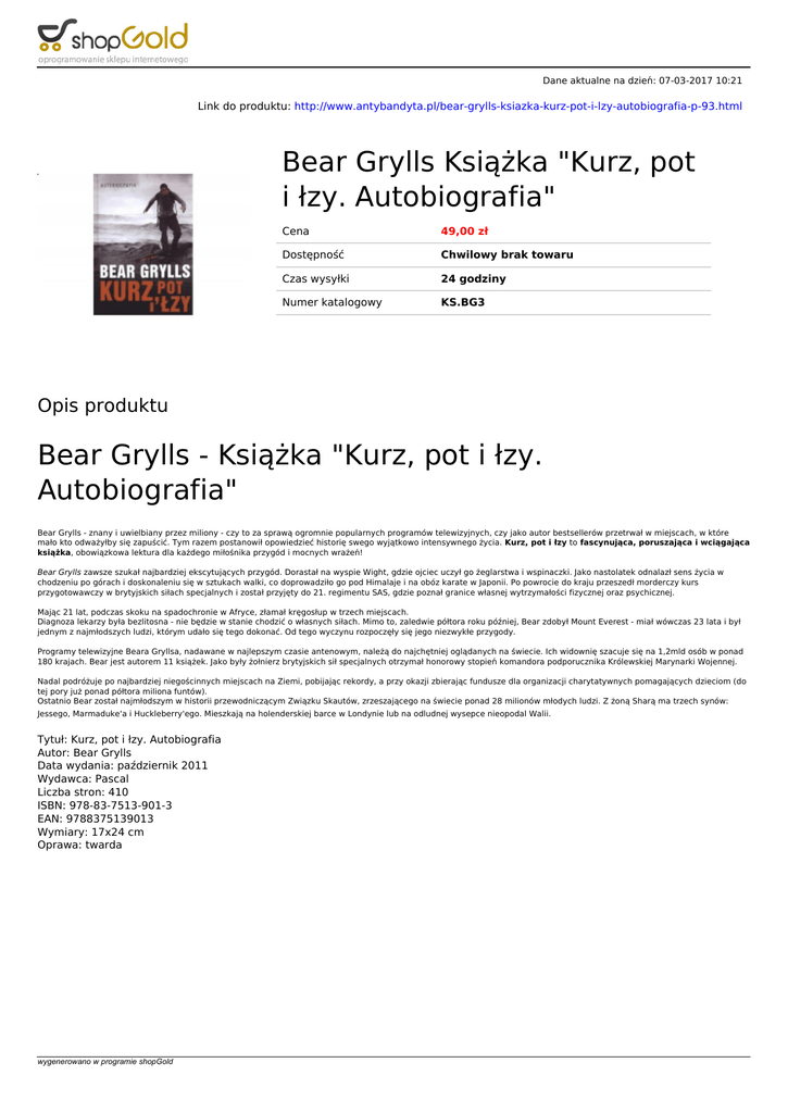 Dane aktualne na dzień: 07-03-2017 10:21 Link do produktu: http://www.antybandyta.pl/bear-grylls-ksiazka-kurz-pot-i-lzy-autobiografia-p-93.html Bear Grylls Książka "Kurz, pot i łzy. Autobiografia" Cena 49,00 zł Dostępność Chwilowy brak towaru Czas wysyłki 24 godziny Numer katalogowy KS.BG3 Opis produktu Bear Grylls - Książka "Kurz, pot i łzy. Autobiografia" Bear Grylls - znany i uwielbiany przez miliony - czy to za sprawą ogromnie popularnych programów telewizyjnych, czy jako autor bestsellerów przetrwał w miejscach, w które mało kto odważyłby się zapuścić. Tym razem postanowił opowiedzieć historię swego wyjątkowo intensywnego życia. Kurz, pot i łzy to fascynująca, poruszająca i wciągająca książka, obowiązkowa lektura dla każdego miłośnika przygód i mocnych wrażeń! Bear Grylls zawsze szukał najbardziej ekscytujących przygód. Dorastał na wyspie Wight, gdzie ojciec uczył go żeglarstwa i wspinaczki. Jako nastolatek odnalazł sens życia w chodzeniu po górach i doskonaleniu się w sztukach walki, co doprowadziło go pod Himalaje i na obóz karate w Japonii. Po powrocie do kraju przeszedł morderczy kurs przygotowawczy w brytyjskich siłach specjalnych i został przyjęty do 21. regimentu SAS, gdzie poznał granice własnej wytrzymałości fizycznej oraz psychicznej. Mając 21 lat, podczas skoku na spadochronie w Afryce, złamał kręgosłup w trzech miejscach. Diagnoza lekarzy była bezlitosna - nie będzie w stanie chodzić o własnych siłach. Mimo to, zaledwie półtora roku później, Bear zdobył Mount Everest - miał wówczas 23 lata i był jednym z najmłodszych ludzi, którym udało się tego dokonać. Od tego wyczynu rozpoczęły się jego niezwykłe przygody. Programy telewizyjne Beara Gryllsa, nadawane w najlepszym czasie antenowym, należą do najchętniej oglądanych na świecie. Ich widownię szacuje się na 1,2mld osób w ponad 180 krajach. Bear jest autorem 11 książek. Jako były żołnierz brytyjskich sił specjalnych otrzymał honorowy stopień komandora podporucznika Królewskiej Marynarki Wojennej. Nadal podróżuje po najbardziej niegościnnych miejscach na Ziemi, pobijając rekordy, a przy okazji zbierając fundusze dla organizacji charytatywnych pomagających dzieciom (do tej pory już ponad półtora miliona funtów). Ostatnio Bear został najmłodszym w historii przewodniczącym Związku Skautów, zrzeszającego na świecie ponad 28 milionów młodych ludzi. Z żoną Sharą ma trzech synów: Jessego, Marmaduke'a i Huckleberry'ego. Mieszkają na holenderskiej barce w Londynie lub na odludnej wysepce nieopodal Walii. Tytuł: Kurz, pot i łzy. Autobiografia Autor: Bear Grylls Data wydania: październik 2011 Wydawca: Pascal Liczba stron: 410 ISBN: 978-83-7513-901-3 EAN: 9788375139013 Wymiary: 17x24 cm Oprawa: twarda wygenerowano w programie shopGold Powered by TCPDF (www.tcpdf.org)