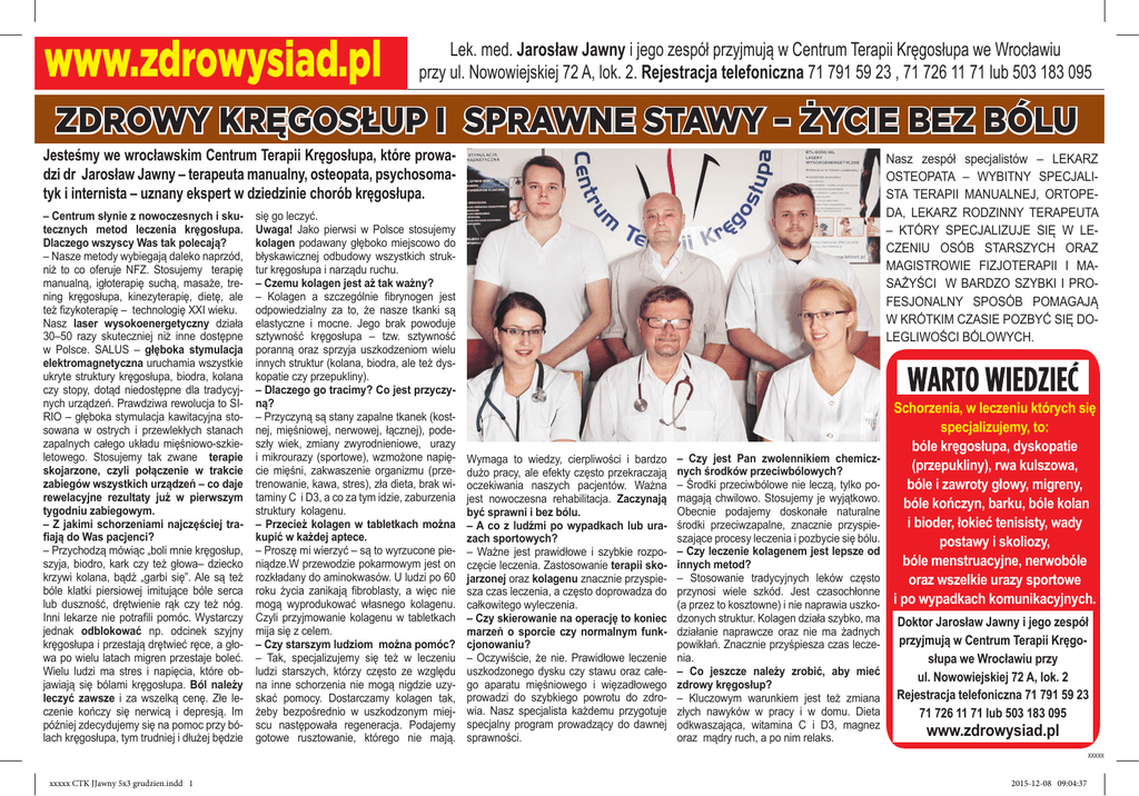 www.zdrowysiad.pl Lek. med. Jarosław Jawny i jego zespół przyjmują w Centrum Terapii Kręgosłupa we Wrocławiu przy ul. Nowowiejskiej 72 A, lok. 2. Rejestracja telefoniczna 71 791 59 23 , 71 726 11 71 lub 503 183 095 ZDROWY KRĘGOSŁUP I SPRAWNE STAWY – ŻYCIE BEZ BÓLU Jesteśmy we wrocławskim Centrum Terapii Kręgosłupa, które prowadzi dr Jarosław Jawny – terapeuta manualny, osteopata, psychosomatyk i internista – uznany ekspert w dziedzinie chorób kręgosłupa. – Centrum słynie z nowoczesnych i skutecznych metod leczenia kręgosłupa. Dlaczego wszyscy Was tak polecają? – Nasze metody wybiegają daleko naprzód, niż to co oferuje NFZ. Stosujemy terapię manualną, igłoterapię suchą, masaże, trening kręgosłupa, kinezyterapię, dietę, ale też fizykoterapię – technologię XXI wieku. Nasz laser wysokoenergetyczny działa 30–50 razy skuteczniej niż inne dostępne w Polsce. SALUS – głęboka stymulacja elektromagnetyczna uruchamia wszystkie ukryte struktury kręgosłupa, biodra, kolana czy stopy, dotąd niedostępne dla tradycyjnych urządzeń. Prawdziwa rewolucja to SIRIO – głęboka stymulacja kawitacyjna stosowana w ostrych i przewlekłych stanach zapalnych całego układu mięśniowo-szkieletowego. Stosujemy tak zwane terapie skojarzone, czyli połączenie w trakcie zabiegów wszystkich urządzeń – co daje rewelacyjne rezultaty już w pierwszym tygodniu zabiegowym. – Z jakimi schorzeniami najczęściej trafiają do Was pacjenci? – Przychodzą mówiąc „boli mnie kręgosłup, szyja, biodro, kark czy też głowa– dziecko krzywi kolana, bądź „garbi się”. Ale są też bóle klatki piersiowej imitujące bóle serca lub duszność, drętwienie rąk czy też nóg. Inni lekarze nie potrafili pomóc. Wystarczy jednak odblokować np. odcinek szyjny kręgosłupa i przestają drętwieć ręce, a głowa po wielu latach migren przestaje boleć. Wielu ludzi ma stres i napięcia, które objawiają się bólami kręgosłupa. Ból należy leczyć zawsze i za wszelką cenę. Złe leczenie kończy się nerwicą i depresją. Im później zdecydujemy się na pomoc przy bólach kręgosłupa, tym trudniej i dłużej będzie się go leczyć. Uwaga! Jako pierwsi w Polsce stosujemy kolagen podawany głęboko miejscowo do błyskawicznej odbudowy wszystkich struktur kręgosłupa i narządu ruchu. – Czemu kolagen jest aż tak ważny? – Kolagen a szczególnie fibrynogen jest odpowiedzialny za to, że nasze tkanki są elastyczne i mocne. Jego brak powoduje sztywność kręgosłupa – tzw. sztywność poranną oraz sprzyja uszkodzeniom wielu innych struktur (kolana, biodra, ale też dyskopatie czy przepukliny). – Dlaczego go tracimy? Co jest przyczyną? – Przyczyną są stany zapalne tkanek (kostnej, mięśniowej, nerwowej, łącznej), podeszły wiek, zmiany zwyrodnieniowe, urazy i mikrourazy (sportowe), wzmożone napięcie mięśni, zakwaszenie organizmu (przetrenowanie, kawa, stres), zła dieta, brak witaminy C i D3, a co za tym idzie, zaburzenia struktury kolagenu. – Przecież kolagen w tabletkach można kupić w każdej aptece. – Proszę mi wierzyć – są to wyrzucone pieniądze.W przewodzie pokarmowym jest on rozkładany do aminokwasów. U ludzi po 60 roku życia zanikają fibroblasty, a więc nie mogą wyprodukować własnego kolagenu. Czyli przyjmowanie kolagenu w tabletkach mija się z celem. – Czy starszym ludziom można pomóc? – Tak, specjalizujemy się też w leczeniu ludzi starszych, którzy często ze względu na inne schorzenia nie mogą nigdzie uzyskać pomocy. Dostarczamy kolagen tak, żeby bezpośrednio w uszkodzonym miejscu następowała regeneracja. Podajemy gotowe rusztowanie, którego nie mają. Nasz zespół specjalistów – LEKARZ OSTEOPATA – WYBITNY SPECJALISTA TERAPII MANUALNEJ, ORTOPEDA, LEKARZ RODZINNY TERAPEUTA – KTÓRY SPECJALIZUJE SIĘ W LECZENIU OSÓB STARSZYCH ORAZ MAGISTROWIE FIZJOTERAPII I MASAŻYŚCI W BARDZO SZYBKI I PROFESJONALNY SPOSÓB POMAGAJĄ W KRÓTKIM CZASIE POZBYĆ SIĘ DOLEGLIWOŚCI BÓLOWYCH. Wymaga to wiedzy, cierpliwości i bardzo dużo pracy, ale efekty często przekraczają oczekiwania naszych pacjentów. Ważna jest nowoczesna rehabilitacja. Zaczynają być sprawni i bez bólu. – A co z ludźmi po wypadkach lub urazach sportowych? – Ważne jest prawidłowe i szybkie rozpoczęcie leczenia. Zastosowanie terapii skojarzonej oraz kolagenu znacznie przyspiesza czas leczenia, a często doprowadza do całkowitego wyleczenia. – Czy skierowanie na operację to koniec marzeń o sporcie czy normalnym funkcjonowaniu? – Oczywiście, że nie. Prawidłowe leczenie uszkodzonego dysku czy stawu oraz całego aparatu mięśniowego i więzadłowego prowadzi do szybkiego powrotu do zdrowia. Nasz specjalista każdemu przygotuje specjalny program prowadzący do dawnej sprawności. – Czy jest Pan zwolennikiem chemicznych środków przeciwbólowych? – Środki przeciwbólowe nie leczą, tylko pomagają chwilowo. Stosujemy je wyjątkowo. Obecnie podajemy doskonałe naturalne środki przeciwzapalne, znacznie przyspieszające procesy leczenia i pozbycie się bólu. – Czy leczenie kolagenem jest lepsze od innych metod? – Stosowanie tradycyjnych leków często przynosi wiele szkód. Jest czasochłonne (a przez to kosztowne) i nie naprawia uszkodzonych struktur. Kolagen działa szybko, ma działanie naprawcze oraz nie ma żadnych powikłań. Znacznie przyśpiesza czas leczenia. – Co jeszcze należy zrobić, aby mieć zdrowy kręgosłup? – Kluczowym warunkiem jest też zmiana złych nawyków w pracy i w domu. Dieta odkwaszająca, witamina C i D3, magnez oraz mądry ruch, a po nim relaks. Schorzenia, w leczeniu których się specjalizujemy, to: bóle kręgosłupa, dyskopatie (przepukliny), rwa kulszowa, bóle i zawroty głowy, migreny, bóle kończyn, barku, bóle kolan i bioder, łokieć tenisisty, wady postawy i skoliozy, bóle menstruacyjne, nerwobóle oraz wszelkie urazy sportowe i po wypadkach k