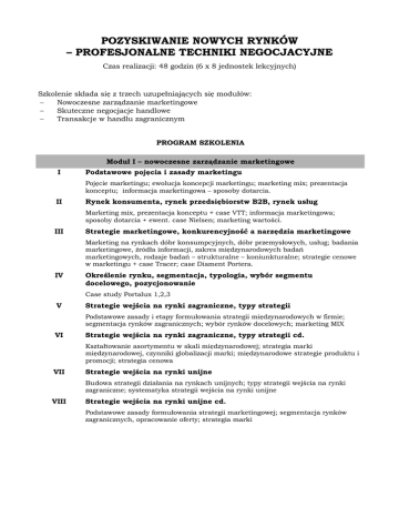 POZYSKIWANIE NOWYCH RYNKÓW – PROFESJONALNE TECHNIKI NEGOCJACYJNE Czas realizacji: 48 godzin (6 x 8 jednostek lekcyjnych) Szkolenie składa się z trzech uzupełniających się modułów: − Nowoczesne zarządzanie marketingowe − Skuteczne negocjacje handlowe − Transakcje w handlu zagranicznym PROGRAM SZKOLENIA Moduł I – nowoczesne zarządzanie marketingowe I Podstawowe pojęcia i zasady marketingu Pojęcie marketingu; ewolucja koncepcji marketingu; marketing mix; prezentacja konceptu; informacja marketingowa – sposoby dotarcia. II Rynek konsumenta, rynek przedsiębiorstw B2B, rynek usług Marketing mix, prezentacja konceptu + case VTT; informacja marketingowa; sposoby dotarcia + ewent. case Nielsen; marketing wartości. III Strategie marketingowe, konkurencyjność a narzędzia marketingowe Marketing na rynkach dóbr konsumpcyjnych, dóbr przemysłowych, usług; badania marketingowe, źródła informacji, zakres międzynarodowych badań marketingowych, rodzaje badań – strukturalne – koniunkturalne; strategie cenowe w marketingu + case Tracer; case Diament Portera. IV Określenie rynku, segmentacja, typologia, wybór segmentu docelowego, pozycjonowanie Case study Portalux 1,2,3 V Strategie wejścia na rynki zagraniczne, typy strategii Podstawowe zasady i etapy formułowania strategii międzynarodowych w firmie; segmentacja rynków zagranicznych; wybór rynków docelowych; marketing MIX VI Strategie wejścia na rynki zagraniczne, typy strategii cd. Kształtowanie asortymentu w skali międzynarodowej; strategia marki międzynarodowej, czynniki globalizacji marki; międzynarodowe strategie produktu i promocji; strategia cenowa VII Strategie wejścia na rynki unijne Budowa strategii działania na rynkach unijnych; typy strategii wejścia na rynki zagraniczne; systematyka strategii wejścia na rynki unijne VIII Strategie wejścia na rynki unijne cd. Podstawowe zasady formułowania strategii marketingowej; segmentacja rynków zagranicznych, opracowanie oferty; strategia marki Moduł II – Skuteczne negocjacje handlowe I Komunikacja międzyludzka (interpersonalna) jako podstawowe narzędzie w procesie negocjacyjnym. Przedstawienie wykładowcy – trenera, przedstawienie celów i tematów zajęć, metod realizacji; krótkie przedstawienie się uczestników (wstęp do komunikacji werbalnej i niewerbalnej); bariery w komunikacji, sposoby ich redukowania; rodzaje komunikacji interpersonalnej: werbalna, niewerbalna, płaszczyzny porozumienia. II Praktyczne zasady negocjacji Negocjacje i ich aspekty: klimat, przygotowanie; strategie; przebieg negocjacji III Praktyczne zasady negocjacji cd. Zasady racjonalnej negacji; taktyki negocjacyjne; style zachowań (język kolorów, typy negocjatorów) IV Zasady i etapy negocjacji handlowej (negocjacje na ścieżce sprzedaży) Psychologia i techniki sprzedaży; etapy rozmowy handlowej; identyfikacja potrzeb i zdobywanie informacji; prezentacja oferty i pokonywanie zastrzeżeń. V Budowanie konstruktywnych relacji z uczestnikami negocjacji Techniki budowania efektywnych relacji; zasady negocjacji: zwycięstwo – zwycięstwo; neutralizowanie podstawowych barier współpracy; istota strategii „przełamywania” w negocjacjach, sposoby zmiany układu odniesienia w grze negocjacyjnej; budowanie „złotych mostów”, czyli stwarzanie drugiej stronie szansy na zmianę stanowiska bez utraty przez nią twarzy. VI Rozwiązywanie konfliktów i zaradzanie konfliktami Definicja konfliktu, konflikt naturalny, grupowanie konfliktów; konflikty negocjowane i nie negocjowane; sposoby rozwiązywania konfliktów VII Negocjacje w kontekście wielokulturowym firm (różnice, ryzyko) Model kultury Schain’a; określenie problemów pojawiających się w kontaktach międzyludzkich; rozpatrywanie różnic kulturowych z uwrażliwieniem na to, co jest cechą indywidualna a co wynika z kultury VIII Negocjacje w kontekście wielokulturowym cd. Model i poziomu kultury w kontaktach biznesowych i ich znaczenie w praktyce zawodowej; analiza specyfiki rodzimej kultury uczestników i specyfiki; rozwój kompetencji kulturowej; podsumowanie. Moduł III – Transakcje w handlu zagranicznym – podstawowe pojęcia I Warunki zawierania transakcji handlu zagranicznego. Charakterystyka transakcji handlu zagranicznego i podstawowe dokumenty handlowe. Charakterystyka i interpretacja międzynarodowych formuł handlowych Incoterms (podział kosztów i ryzyka); charakterystyka i przesłanki wyboru formy płatności w handlu zagranicznym; pojęcie transakcji handlu zagranicznego; rodzaje umów tworzących transakcje i jej przebieg; rodzaje i struktura kontaktu. Metodologia Wykład, przykłady firm z rynków unijnych, amerykańskich, japońskich, case study oraz mini case study po większości bloków tematycznych, ćwiczenia i gry symulacyjne, testy.