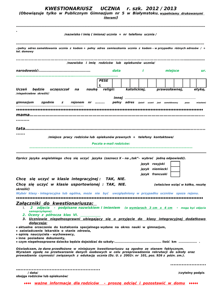 KWESTIONARIUSZ UCZNIA r. szk. 2012 / 2013 (Obowiązuje tylko w Publicznym Gimnazjum nr 5 w Białymstoku, wypełniamy literami) drukowanymi ................................................................................................................................................................................ . /nazwisko i imię ( imiona) ucznia + nr telefonu ucznia / .............................................................................................................................................................. ./pełny adres zameldowania ucznia z kodem + pełny adres zamieszkania ucznia z kodem – w przypadku różnych adresów / + tel. domowy ……………………………………………………………………………………………………….................. /nazwisko i imię rodziców narodowość:.......................................... lub opiekunów ucznia/ data i miejsce ur. ……………………………………………….................................... PESE L Uczeń będzie uczęszczał na naukę religii: katolickiej, prawosławnej, etykę, /niepotrzebne skreślić/ innej ………………………………………………………… gimnazjum zgodnie z rejonem nr ………. pełny adres (jeżeli uczeń jest zameldowany poza miastem) ………………………………………………………………………………………………….. ♦♦♦♦♦♦♦♦♦♦♦♦♦♦♦♦♦♦♦♦♦♦♦♦♦♦♦♦♦♦♦♦♦♦♦♦♦♦♦♦♦♦♦♦♦♦♦♦♦♦♦♦♦♦♦♦♦♦♦♦♦♦♦♦♦♦♦♦♦♦♦♦♦♦♦♦♦♦♦♦♦♦♦♦♦♦♦♦♦♦♦♦♦♦♦♦♦♦♦♦♦♦♦♦♦♦♦♦♦♦♦♦♦♦ mama………………………………………………………………………………………………………………….... ......... tata……………………………………………………………………………………………………………….......... ...... /miejsce pracy rodziców lub opiekunów prawnych + telefony kontaktowe/ Poczta e-mail rodziców: ……………………………………………………………………………………………………………………………………………………… Oprócz języka angielskiego chcę się uczyć Chcę języka (zaznacz X – na „tak”- wybrać się uczyć w klasie integracyjnej : jedną odpowiedź). język rosyjski język niemiecki język francuski TAK, NIE. Chcę się uczyć w klasie usportowionej : TAK, NIE. (właściwe wziąć w kółko, resztę skreślić) Wybór klasy - integracyjna lub ogólna, może nie być uwzględniony w przypadku uczniów spoza rejonu. ♦♦♦♦♦♦♦♦♦♦♦♦♦♦♦♦♦♦♦♦♦♦♦♦♦♦♦♦♦♦♦♦♦♦♦♦♦♦♦♦♦♦♦♦♦♦♦♦♦♦♦♦♦♦♦♦♦♦♦♦♦♦♦♦♦♦♦♦♦♦♦♦♦♦♦♦♦♦♦♦♦♦♦♦♦♦♦♦♦♦♦♦♦♦♦♦♦♦♦♦♦♦♦♦♦♦♦♦♦♦♦♦♦♦ Załączniki do kwestionariusza: 1. 2 zdjęcia - podpisane nazwiskiem i imieniem (o wymiarach 3 cm x 4 cm - mogą być zdjęcia samoprzylepne). 2. Oceny z półrocza klas VI. 3. Uczniowie niepełnosprawni ubiegający się o przyjęcie do dołączają: ♦ ♦ ♦ ♦ ♦ klasy integracyjnej dodatkowo aktualne orzeczenie do kształcenia specjalnego wydane na okres nauki w gimnazjum, zaświadczenie lekarskie o stanie zdrowia, opinię nauczyciela – wychowawcy, inne posiadane dokumenty, czym niepełnosprawne dziecko będzie dojeżdżać do szkoły-........................................... ilość km ................. . Oświadczam, że dane przedłożone w niniejszym kwestionariuszu są zgodne ze stanem faktycznym. Wyrażam zgodę na przetwarzanie danych osobowych w celu przeprowadzenia rekrutacji do szkoły oraz prowadzenia czynności związanych z edukacją ucznia (Dz. U. z 2002r. nr 101, poz. 926 z póżn. zm.). ...................... …................................................. / data/ obojga rodziców lub opiekunów/ ♦♦♦♦ ważne informacje dla rodziców /czytelny podpis - proszę odciąć i pozostawić w domu ♦♦♦♦♦ 1. Składanie dokumentów od 21.03.2012 do 20.04.2012 do godz. 15.00. 2. Świadectwo ukończenia klasy VI oraz zaświadczenie z egzaminów należy dostarczyć do 04.07.2012 do godz. 15.00. 3. Rekrutacja od 05.07.2012 do 06.07.2012 do godz. 15.00. 4. Ogłoszenie list przyjętych 09.07.2012 o godz. 15.00. W gimnazjum obowiązuje: a. b. c. d. e. zmiana obuwia na tenisówki na białej podeszwie, ubiór zgodny ze Statutem Szkoły, strój gimnastyczny (biała koszulka, czarne lub granatowe szorty), zakaz makijażu i noszenia biżuterii, zakaz używania telefonów komórkowych na terenie szkoły. Rodzice nie ingerują w decyzję Dyrektora szkoły o podziale klas. W razie zmiany adresu stałego zameldowania prosimy o niezwłoczne powiadomienie sekretariatu szkoły.