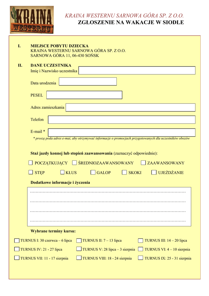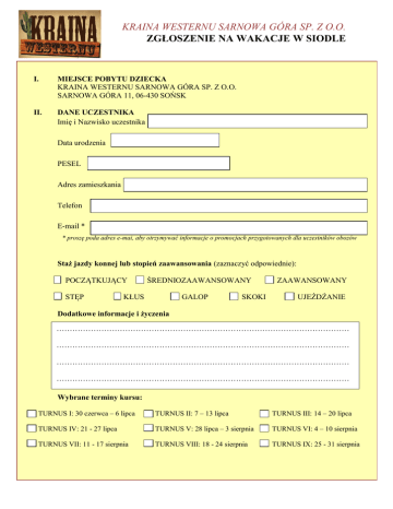 KRAINA WESTERNU SARNOWA GÓRA SP. Z O.O. ZGŁOSZENIE NA WAKACJE W SIODLE I. MIEJSCE POBYTU DZIECKA KRAINA WESTERNU SARNOWA GÓRA SP. Z O.O. SARNOWA GÓRA 11, 06-430 SOŃSK II. DANE UCZESTNIKA Imię i Nazwisko uczestnika Data urodzenia PESEL Adres zamieszkania Telefon E-mail * * proszę poda adres e-mai, aby otrzymywać informacje o promocjach przygotowanych dla uczestników obozów Staż jazdy konnej lub stopień zaawansowania (zaznaczyć odpowiednie): POCZĄTKUJĄCY STĘP ŚREDNIOZAAWANSOWANY KŁUS GALOP SKOKI ZAAWANSOWANY UJEŻDŻANIE Dodatkowe informacje i życzenia ………………………………………………………………………………………………… ………………………………………………………………………………………………… ………………………………………………………………………………………………… ………………………………………………………………………………………………… ………………………………………………………………………………………………… Wybrane terminy kursu: TURNUS I: 30 czerwca – 6 lipca TURNUS II: 7 – 13 lipca TURNUS III: 14 – 20 lipca TURNUS IV: 21 - 27 lipca TURNUS V: 28 lipca – 3 sierpnia TURNUS VI: 4 – 10 sierpnia TURNUS VII: 11 - 17 sierpnia TURNUS VIII: 18 - 24 sierpnia TURNUS IX: 25 - 31 sierpnia KRAINA WESTERNU SARNOWA GÓRA SP. Z O.O. ZGŁOSZENIE NA WAKACJE W SIODLE III. Oświadczenia rodziców Wyrażam zgodę na pobyt mojego dziecka, obsługę koni oraz jazdę konną w Krainie Westernu w Sarnowej Górze 11, 06-430 Sońsk ………………………………………. ..……………………………………… Miejscowość i data Podpis rodziców IV. Informacja rodziców o stanie zdrowia dziecka Dolegliwości i objawy które mogą wystąpić u dziecka: omdlenia, drgawki, częste bóle głowy, zaburzenia równowagi , częste wymioty, krwotoki z nosa, ataki duszności, szybkie męczenie się, częste bóle brzuch, bóle stawów, lęki nocne, moczenie nocne , inne:.............................................................................................................................................. Czy dziecko jest uczulone, czy przyjmuje stale leki i w jakich dawkach …….…………………………………………………………………………………………....... ....................................................................................................................................................... Na jakie pokarmy i leki dziecko jest uczulone:............................................................................ Czy dziecko otrzymało surowicę ( jaką , kiedy ):......................................................................... OŚWIADCZAM, ŻE PODAŁEM WSZYSTKIE ZNANE MI INFORMACJE O DZIECKU, KTÓRE MOGĄ POMÓC W ZAPEWNIENIU WŁAŚCIWEJ OPIEKI PODCZAS POBYTU W KRAINIE WESTERNU W SARNOWEJ GÓRZE 11 W razie zagrożenia życia lub zdrowia dziecka zgadzam się na jego leczenie szpitalne oraz niezbędne zabiegi diagnostyczne, operacje. …………………………… Data …………………………………………….. Podpis rodziców Rezerwacji dokonujemy telefonicznie, lub e-mailowo po ustaleniu terminu należy przesłać kartę zgłoszeniową na adres [email protected] oraz wpłacić 300 zł przedpłaty na konto z tytułem ( pobyt w Krainie Westernu - ferie letnie ). Pozostałą część należności uczestnik wpłaca najpóźniej w dniu rozpoczęcia obozu. Wypełnioną i podpisaną kartę zgłoszeniowa prosimy dostarczyć najpóźniej w dniu przyjazdu z resztą dokumentów. UWAGA!!! TYLKO WPŁATA ZALICZKI JEST GWARANCJĄ REZERWACJI MIEJSCA NA TURNUSIE. Alior Bank 53 2490 0005 0000 4520 6367 6558