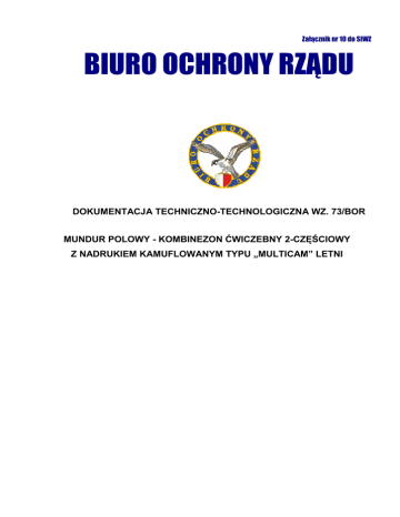 Załącznik nr 10 do SIWZ BIURO OCHRONY RZĄDU DOKUMENTACJA TECHNICZNO-TECHNOLOGICZNA WZ. 73/BOR MUNDUR POLOWY - KOMBINEZON ĆWICZEBNY 2-CZĘŚCIOWY Z NADRUKIEM KAMUFLOWANYM TYPU „MULTICAM” LETNI Spis treści 1. Rysunek modelowy. 3-4 2. Opis ogólny wyrobu. 5-6 3. Wymagania techniczne. 6 3.1 Wykaz materiałów zasadniczych i dodatków. 6-7 3.2 Rodzaje szwów i ściegów maszynowych. 7 3.3 Dopuszczalne sztukowanie elementów. 7 3.4 Tabela klasyfikacji wielkości. 8 3.5 Wymagania techniczne tkaniny zasadniczej. 9-10 4. Zestawienie elementów składowych. 11-12 5. Rysunki techniczne, tabele wymiarów stałych i pomocniczych. 13-20 6. Cechowanie, składanie i pakowanie. 20 6.1 Rozmieszczenie cech dostawcy. 20-21 6.2 Składanie. 21 6.3 Pakowanie. 21 6.4 Gwarancja. 21 7. Arkusz ewidencji wprowadzonych zmian. 22 2 1. RYSUNEK MODELOWY. Rysunek nr 1 - bluza kombinezonu ćwiczebnego 2- częściowego nadrukiem kamuflowanym „MULTICAM” letnia 3 Rysunek nr 2 - spodnie kombinezonu ćwiczebnego 2-częściowego z nadrukiem kamuflowanym „MULTICAM” letnie 4 2. OPIS OGÓLNY WYROBU. Bluza zapinana pośrodku jednorzędowo, na zamek błyskawiczny w krytym zapięciu. Elementem osłaniający szyję - stójka dwuwarstwowa w przodzie zapinana na taśmę samosczepną. Na przodach bluzy, na wysokości klatki piersiowej naszyte kieszenie nakładane z zamkami błyskawicznymi od strony boków. Kieszenie umiejscowione pod skosem w celu ułatwienia dostępu. Nad kieszeniami umieszczone patki przypinane na dwa duże guziki. Przy lewej kieszeni przodu umieszczona kieszonka na długopis. Na wysokości klatki piersiowej wykonane kieszenie wewnętrzne zapinane na zamek błyskawiczny wszyty pionowo. Rękawy dwuczęściowe, a doły rękawów wyprofilowane, wykończone odszyciem. Dół rękawa posiada patkę służącą do regulacji obwodu. Na wierzchnich częściach rękawów u góry, naszyte po skosem kieszenie nakładane. Dodatkowym elementem w kieszeni na prawym rękawie jest zamek od strony przodu oraz kieszonka na światło chemiczne. Nad kieszeniami umieszczone patki zapinane na duże guziki. Na środku widocznej części kieszeni i patki naszyty element z pętelkowej taśmy samosczepnej przeznaczony do zamocowania oznaki rozpoznawczej. Na rękawach, na wysokości łokcia naszyte wzmocnienia z tkaniny. Tył bluzy jednoczęściowy. Pod pachami na rękawie, przodzie oraz dolnych częściach kieszeni wykonane okrągłe dziurki. Dół bluzy podwinięty dwukrotnie od wewnątrz i przestębnowany. Ogólny widok bluzy przedstawiony jest na rysunku numer 1. Spodnie długie uszyte tak by nie krępowały ruchów użytkownika. Pośrodku przodu, u góry wykonany rozporek z listewkami zapinanymi na zamek błyskawiczny. Nogawki przednie, u góry od strony boków odcięte po skosie. W cięciu tym wykonane kieszenie boczne wpuszczone do wewnątrz. Na tylnych nogawkach, u góry wykonane zaszewki przełożone w kierunku boków. Tylne części nogawek na odcinku szwu środkowego tyłu i wewnętrznego wzmocnione tkaniną wodoodporną, naszytą od strony zewnętrznej. W tylnej części nogawek, u góry wykonane kieszenie cięte, przykrywane patkami, zapinane na dwa duże guziki. Góra spodni od wewnątrz obszyta tkaniną zasadniczą tworzącą imitację paska. W przedniej części nogawki lewej, poniżej imitacji pasa a kieszenią wewnętrzną wykonana kieszeń z wypustką zapinaną na zamek błyskawiczny. Spodnie u góry zapinane na jeden duży guzik i dziurkę. Na imitacji paska rozmieszczonych siedem podtrzymywaczy z taśmy nośnej oraz dwa dwuczęściowe ściągacze spięte klamerkami. Na bokach nogawek poniżej otworów kieszeniowych naszyte dwie kieszenie nakładane. Patki kieszeni nakładanych zapinane na dwa duże guziki. 5 Poniżej kieszeni udowych na bokach naszyte kieszenie nakładane, przykrywane patkami, zapinane na taśmy samosczepne. Przednie części nogawek obejmujące kolano wzmocnione tkaniną naszytą na wierzchu nogawek. Dół nogawek wykończony tunelem i odcinkiem taśmy elastycznej wprowadzonym przez dwie okrągłe dziurki wykonane w przedniej części nogawki. Ogólny widok spodni przedstawiony jest na rysunku numer 2. 3. WYMAGANIA TECHNICZNE. 3.1. WYKAZ MATERIAŁÓW ZASADNICZYCH I DODATKÓW. Wykaz materiałów zasadniczych i dodatków przedstawiono w tabeli nr 1. Tabela nr 1 Lp. Nazwa materiału Typ, rodzaj, charakterystyka materiału 1 2 3 Tkanina zasadnicza 1 kamuflażu zbliżonym O do wzoru w tabeli nr 3. Wymaganiach technicznych przedstawionych „MULTICAM”. Bawełnopodobne z włókien poliestrowych 3 Nici odzieżowe. 4 Nici odzieżowe. 5 Taśma samoczepna. W kolorze beżowym szerokości 2,5 cm. 6 Taśma samoczepna. W kolorze beżowym szerokości 3,5 cm. 7 Taśma samoczepna. W kolorze beżowym o szerokości 10,0 cm. 8 Zamek błyskawiczny. Tworzywowy, średniospiralny, w kolorze beżowym. 9 Zamek błyskawiczny. Metalowy taśma w kolorze beżowym. 10 Wkład odzieżowy. Tkany wkład odzieżowy z klejem. 11 Wkład piankowy. W kolorze szarym. 12 Taśma do lamowania. Taśma o szerokości 2,5 cm w kolorze beżowym. o masie liniowej 200 dtex x 2 w kolorze beżowym. Rdzeniowe poliestrowe o masie liniowej 220 dtex x 3 w kolorze beżowym. 6 Lp. Nazwa materiału Typ, rodzaj, charakterystyka materiału 1 2 3 13 Taśma. Taśma rypsowa szer.10mm w kolorze beżowym. 14 Taśma nośna. Taśma o szerokości 20mm w kolorze beżowym. 15 Guma elastyczna. Guma elastyczna o średnicy 3 mm kolorze beżowym. 16 Koralik. W kolorze beżowym. 17 Stoper. Dwukomorowy w kolorze beżowym. 18 Guziki odzieżowe. W kolorze beżowym. 19 Klamerka. Klamerka metalowa. 20 Wszywka. Firmowo-rozmiarowa. Etykieta. Jednostkowa. 21 Zbiorcza. 3.2. RODZAJE SZWÓW I ŚCIEGÓW MASZYNOWYCH. Oznaczenie szwów i ściegów wg: PN-83/P-84501 Wyroby konfekcyjne. Szwy klasyfikacja i oznaczenia; PN-83/P-84502 Wyroby konfekcyjne. Ściegi klasyfikacja i oznaczenia. 3.3. DOPUSZCZALNE SZTUKOWANIE ELEMENTÓW. W wyrobie nie dopuszcza się sztukowania elementów. 7