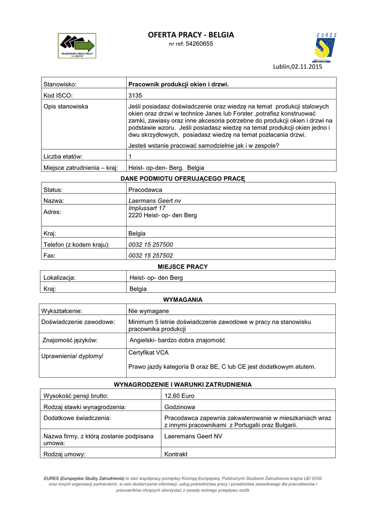 OFERTA PRACY - BELGIA nr ref: 54260655 Lublin,02.11.2015 Stanowisko: Pracownik produkcji okien i drzwi. Kod ISCO: 3135 Opis stanowiska Jeśli posiadasz doświadczenie oraz wiedzę na temat produkcji stalowych okien oraz drzwi w technice Janes lub Forster ,potrafisz konstruować zamki, zawiasy oraz inne akcesoria potrzebne do produkcji okien i drzwi na podstawie wzoru. Jeśli posiadasz wiedzę na temat produkcji okien jedno i dwu skrzydłowych, posiadasz wiedzę na temat pozłacania drzwi. Jesteś wstanie pracować samodzielnie jak i w zespole? Liczba etatów: 1 Miejsce zatrudnienia – kraj: Heist- op-den- Berg. Belgia DANE PODMIOTU OFERUJĄCEGO PRACĘ Status: Pracodawca Nazwa: Laermans Geert nv Implussart 17 2220 Heist- op- den Berg Adres: Kraj: Belgia Telefon (z kodem kraju): 0032 15 257500 Fax: 0032 15 257502 MIEJSCE PRACY Lokalizacja: Heist- op- den Berg Kraj: Belgia WYMAGANIA Wykształcenie: Nie wymagane Doświadczenie zawodowe: Minimum 5 letnie doświadczenie zawodowe w pracy na stanowisku pracownika produkcji Znajomość języków: Angielski- bardzo dobra znajomość Certyfikat VCA Uprawnienia/ dyplomy/ Prawo jazdy kategoria B oraz BE, C lub CE jest dodatkowym atutem. WYNAGRODZENIE I WARUNKI ZATRUDNIENIA Wysokość pensji brutto: 12,60 Euro Rodzaj stawki wynagrodzenia: Godzinowa Dodatkowe świadczenia: Pracodawca zapewnia zakwaterowanie w mieszkaniach wraz z innymi pracownikami z Portugalii oraz Bułgarii. Nazwa firmy, z którą zostanie podpisana umowa: Laeremans Geert NV Rodzaj umowy: Kontrakt EURES (Europejskie Służby Zatrudnienia) to sieć współpracy pomiędzy Komisją Europejską, Publicznymi Służbami Zatrudnienia krajów UE/ EOG oraz innych organizacji partnerskich, w celu dostarczania informacji, usług pośrednictwa pracy i poradnictwa zawodowego dla pracodawców i pracowników chcących skorzystać z zasady wolnego przepływu osób Wymiar czasu pracy Pełny etat Czas trwania umowy: 6 miesięcy z możliwością przedłużenia o kolejne 6 Liczba godzin tygodniowo: 40 Zmiany i praca w dni wolne: 5 dni w tygodniu SPOSÓB SKŁADANIA WNIOSKU Wymagane dokumenty: CV Język, w którym muszą być sporządzone przedkładane dokumenty: Angielski Do kogo należy wysłać dokumenty: [email protected] oraz do wiadomości [email protected] Gdzie należy wysłać dokumenty: Dane teleadresowe doradcy EURES lub przedstawiciela pracodawcy: Annelies Thomas Doradca Eures VDAB Serwis Eures Koning Albert I-laam 1.2. 8200 Brugia Belgia e-mail : [email protected] tel: + 32 (0) 50 44 04 97 fax: + 32 (0) 50 44 04 81 www.workinflander.be WAŻNOŚĆ Termin przedkładania podań o pracę Do odwołania UWAGA: 1. Umowa z zagranicznym pracodawcą zostanie zawarta zgodnie z prawem kraju zatrudnienia. Oznacza to, że wszystkie roszczenia odnośnie do warunków, które obejmuje umowa, można kierować wyłącznie do odpowiedniego sądu w kraju zatrudnienia. Publiczne służby zatrudnienia (EURES) nie mogą pośredniczyć ani reprezentować pracownika w sądzie kraju zatrudnienia w przypadku sporu z pracodawcą. 2. Publiczne służby zatrudnienia (EURES) dokładają wszelkich starań, aby zapewnić rzetelność i wiarygodność ofert pracy zgłoszonych w lokalnym urzędzie pracy. Należy wyjaśnić, że oferta pracy została zgłoszona przez stronę trzecią i EURES nie odpowiada za ewentualne rozbieżności między warunkami pracy określonymi w ofercie pracy i warunkami oferowanymi przez potencjalnego pracodawcę. 3. Publiczne służby zatrudnienia (EURES) informują, że będą zbierać, przetwarzać i przekazywać potencjalnym pracodawcom zgodnie z przepisami dotyczącymi ochrony danych osobowych wszystkie dane osobowe dostarczone przez osoby poszukujące pracy. EURES (Europejskie Służby Zatrudnienia) to sieć współpracy pomiędzy Komisją Europejską, Publicznymi Służbami Zatrudnienia krajów UE/ EOG oraz innych organizacji partnerskich, w celu dostarczania informacji, usług pośrednictwa pracy i poradnictwa zawodowego dla pracodawców i pracowników chcących skorzystać z zasady wolnego przepływu osób