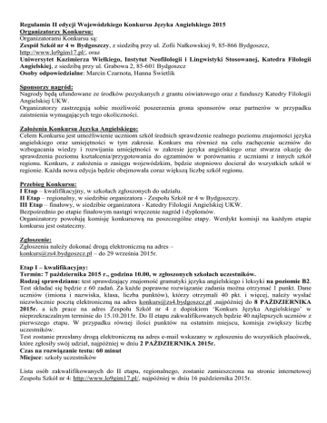 Regulamin II edycji Wojewódzkiego Konkursu Języka Angielskiego 2015 Organizatorzy Konkursu: Organizatorami Konkursu są: Zespół Szkół nr 4 w Bydgoszczy, z siedzibą przy ul. Zofii Nałkowskiej 9, 85-866 Bydgoszcz, http://www.lo9gim17.pl/, oraz Uniwersytet Kazimierza Wielkiego, Instytut Neofilologii i Lingwistyki Stosowanej, Katedra Filologii Angielskiej, z siedzibą przy ul. Grabowa 2, 85-601 Bydgoszcz Osoby odpowiedzialne: Marcin Czarnota, Hanna Świetlik Sponsorzy nagród: Nagrody będą ufundowane ze środków pozyskanych z grantu oświatowego oraz z funduszy Katedry Filologii Angielskiej UKW. Organizatorzy zastrzegają sobie możliwość poszerzenia grona sponsorów oraz partnerów w przypadku zaistnienia wymagających tego okoliczności. Założenia Konkursu Języka Angielskiego: Celem Konkursu jest umożliwienie uczniom szkół średnich sprawdzenie realnego poziomu znajomości języka angielskiego oraz umiejętności w tym zakresie. Konkurs ma również na celu zachęcenie uczniów do wzbogacania wiedzy i rozwijania umiejętności w zakresie języka angielskiego oraz stwarza okazję do sprawdzenia poziomu kształcenia/przygotowania do egzaminów w porównaniu z uczniami z innych szkół regionu. Konkurs, z założenia o zasięgu wojewódzkim, będzie stopniowo docierał do wszystkich szkół w regionie. Każda nowa edycja będzie obejmowała coraz większą liczbę szkół regionu. Przebieg Konkursu: I Etap – kwalifikacyjny, w szkołach zgłoszonych do udziału. II Etap – regionalny, w siedzibie organizatora - Zespołu Szkół nr 4 w Bydgoszczy. III Etap – finałowy, w siedzibie organizatora - Katedry Filologii Angielskiej UKW. Bezpośrednio po etapie finałowym nastąpi wręczenie nagród i dyplomów. Organizatorzy powołują komisję konkursową na poszczególne etapy. Werdykt komisji na każdym etapie konkursu jest ostateczny. Zgłoszenie: Zgłoszenia należy dokonać drogą elektroniczną na adres – [email protected] – do 29 września 2015r. Etap I – kwalifikacyjny: Termin: 7 października 2015 r., godzina 10.00, w zgłoszonych szkołach uczestników. Rodzaj sprawdzianu: test sprawdzający znajomość gramatyki języka angielskiego i leksyki na poziomie B2. Test składać się będzie z 60 zadań. Za każde poprawne rozwiązanie zadania można otrzymać 1 punkt. Dane uczniów (imiona i nazwiska, klasa, liczba punktów), którzy otrzymali 40 pkt. i więcej, należy wysłać niezwłocznie pocztą elektroniczną na adres [email protected] ,najpóźniej do 8 PAŹDZIERNIKA 2015r. a ich prace na adres Zespołu Szkół nr 4 z dopiskiem ‘Konkurs Języka Angielskiego’ w nieprzekraczalnym terminie do 15.10.2015r. Do II etapu zakwalifikowanych będzie 40 najlepszych uczniów z pierwszego etapu. W przypadku równej ilości punktów na ostatnim miejscu, komisja zwiększy liczbę uczestników. Test zostanie przesłany drogą elektroniczną na adres e-mail wskazany w zgłoszeniu do wszystkich placówek, które zgłosiły swój udział, najpóźniej w dniu 2 PAŹDZIERNIKA 2015r. Czas na rozwiązanie testu: 60 minut Miejsce: szkoły uczestników Lista osób zakwalifikowanych do II etapu, regionalnego, zostanie zamieszczona na stronie internetowej Zespołu Szkół nr 4: http://www.lo9gim17.pl/, najpóźniej w dniu 16 października 2015r. Etap II - regionalny: Termin: 4 listopada 2015 r., godzina 10.00 Rodzaj sprawdzianu: test sprawdzający znajomość gramatyki języka angielskiego i leksyki na poziomie C1. Test składać się będzie z 70 zadań, przy czym za każde poprawnie rozwiązane zadanie będzie można otrzymać 1 punkt. Do III etapu przechodzi maksymalnie 10 uczestników etapu regionalnego, którzy uzyskali najwyższe wyniki. W przypadku tej samej ilości punktów na ostatnim miejscu decyzja o zakwalifikowaniu ucznia do etapu finałowego nastąpi w oparciu o wynik pierwszego etapu. Czas trwania: 60 minut Miejsce: Zespół Szkół nr 4, Bydgoszcz. Organizator nie zapewnia zakwaterowania, wyżywienia, ani zwrotu kosztów dojazdu uczestników oraz ich opiekunów. Wyniki: Lista osób zakwalifikowanych do III etapu, wojewódzkiego, zostanie zamieszczona na stronie internetowej Zespołu Szkół nr 4 dnia 13 listopada 2015r. Etap III – finałowy: Termin: pierwszy tydzień grudnia 2015 r. Rodzaj sprawdzianu: przygotowanie i przedstawienie prezentacji przez uczestnika oraz rozmowa z komisją konkursową. Czas prezentacji: do 5 minut, po której następuje 5 minutowa rozmowa z komisją. Lista ogólnych tematów do przygotowania będzie podana 13 listopada 2015r. Miejsce: Uniwersytet Kazimierza Wielkiego, Instytut Neofilologii i Lingwistyki Stosowanej, Katedra Filologii Angielskiej, z siedzibą przy ul. Grabowa 2, 85-601 Bydgoszcz Organizator nie zapewnia zakwaterowania, wyżywienia, ani zwrotu kosztów dojazdu uczestników oraz ich opiekunów. Organizator zastrzega sobie prawo zmiany lokalizacji oraz terminu etapu finałowego w przypadku zaistnienia wymagających tego okoliczności. Nagrody Przewidziano nagrody dla wszystkich uczestników etapu finałowego. Ponadto, uczestnicy etapu regionalnego i finałowego otrzymają certyfikaty poświadczające udział w Konkursie. Postanowienia końcowe Organizatorzy zastrzegają sobie prawo zmiany lub uzupełnienia zapisów Regulaminu Konkursu z wymogiem każdorazowego powiadomienia o ewentualnych zmianach/uzupełnieniach szkół zgłoszonych do Konkursu. Wszelkie pytania dotyczące powyższego Regulaminu należy kierować na adres: [email protected] Kontakt i koordynatorzy projektu [email protected] Olgierd Rogoziński – sekretarz konkursu Koordynatorzy Projektu: Marcin Czarnota Paweł Szmańda
