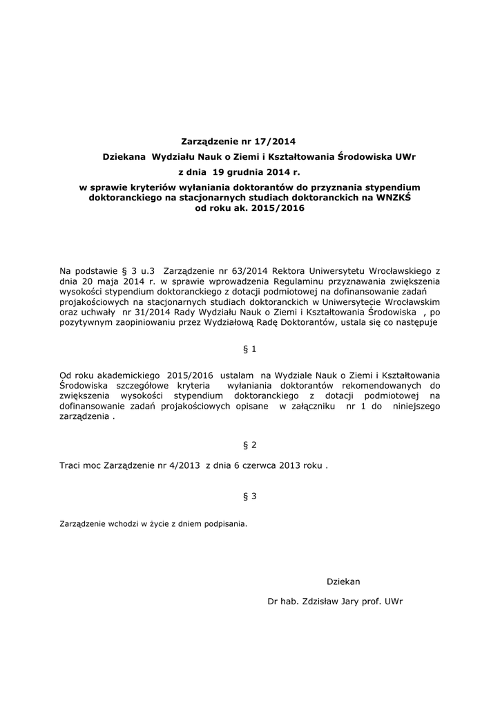 Zarządzenie nr 17/2014 Dziekana Wydziału Nauk o Ziemi i Kształtowania Środowiska UWr z dnia 19 grudnia 2014 r. w sprawie kryteriów wyłaniania doktorantów do przyznania stypendium doktoranckiego na stacjonarnych studiach doktoranckich na WNZKŚ od roku ak. 2015/2016 Na podstawie § 3 u.3 Zarządzenie nr 63/2014 Rektora Uniwersytetu Wrocławskiego z dnia 20 maja 2014 r. w sprawie wprowadzenia Regulaminu przyznawania zwiększenia wysokości stypendium doktoranckiego z dotacji podmiotowej na dofinansowanie zadań projakościowych na stacjonarnych studiach doktoranckich w Uniwersytecie Wrocławskim oraz uchwały nr 31/2014 Rady Wydziału Nauk o Ziemi i Kształtowania Środowiska , po pozytywnym zaopiniowaniu przez Wydziałową Radę Doktorantów, ustala się co następuje §1 Od roku akademickiego 2015/2016 ustalam na Wydziale Nauk o Ziemi i Kształtowania Środowiska szczegółowe kryteria wyłaniania doktorantów rekomendowanych do zwiększenia wysokości stypendium doktoranckiego z dotacji podmiotowej na dofinansowanie zadań projakościowych opisane w załączniku nr 1 do niniejszego zarządzenia . §2 Traci moc Zarządzenie nr 4/2013 z dnia 6 czerwca 2013 roku . §3 Zarządzenie wchodzi w życie z dniem podpisania. Dziekan Dr hab. Zdzisław Jary prof. UWr Załącznik nr 1 do uchwały nr 31/2014 z dnia 21 listopada 2014 r. i zarządzenia nr 17/2014 z dnia 19 grudnia 2014 r. SZCZEGÓŁOWE KRYTERIA WYŁANIANIA GRUPY 30% NAJLEPSZYCH DOKTORANTÓW na drugim i kolejnych latach studiów doktoranckich na WNZKS rekomendowanych do przyznania zwiększenia stypendium doktoranckiego z dotacji podmiotowej na dofinansowanie zadań projakościowych w Uniwersytecie Wrocławskim § 1 1. Stypendium doktoranckie z dotacji podmiotowej na dofinansowanie zadań projakościowych w Uniwersytecie Wrocławskim na Wydziale Nauk o Ziemi i Kształtowania Środowiska przyznaje Rektor na podstawie propozycji Dziekana sporządzonych w oparciu o listy rankingowe. Dziekan sporządza listy rankingowe po zasięgnięciu opinii komisji w składzie: • Prodziekan ds. studenckich, • Kierownik Studiów Doktoranckich Geografii, • Kierownik Studiów Doktoranckich Geologii, • Kierownik Studiów Doktoranckich Ochrony Środowiska, • Przedstawiciel Wydziału Nauk Biologicznych • Przedstawiciel doktorantów Geografii, • Przedstawiciel doktorantów Geologii, • Przedstawiciel doktorantów Ochrony Środowiska. 2. Doktorant ubiegający się o przyznanie zwiększenia stypendium doktoranckiego składa Wniosek do kierownika studiów doktoranckich, przedkładając także Kartę osiągnięć doktoranta, do dnia 30 września każdego roku. 3. Wzór Karty osiągnięć doktoranta stanowi Załącznik A do „ Szczegółowych kryteriów” § 2 Zwiększenie stypendium doktoranckiego z dotacji podmiotowej na II i kolejnych latach studiów może być przyznane doktorantowi, który w roku akademickim poprzedzającym przyznanie stypendium, spełnił łącznie wszystkie wymienione poniżej warunki: wyróżnił się osiągnięciami w pracy naukowej i dydaktycznej w poprzednim roku studiów, posiada minimum jedną publikację naukową z listy MNiSW (pod uwagę są brane także publikacje, które ukazały się na zasadzie „online first”), zaliczył bezwarunkowo poprzedni rok studiów doktoranckich w terminie do 30 września (decyduje data złożenia indeksu w dziekanacie), uzyskał bardzo dobre lub dobre wyniki egzaminów objętych programem studiów doktoranckich – średnia ocen z zaliczeń i egzaminów objętych programem studiów doktoranckich nie jest niższa niż 4,5; • uzyskał pozytywną opinię promotora lub opiekuna naukowego, nie był karany dyscyplinarnie w roku akademickim, za który nabywa prawo do stypendium. § 3 Oceniany jest dorobek uzyskany w trakcie poprzedniego roku studiów w trzech aspektach: publikacje naukowe, dydaktyka, inne osiągnięcia; odpowiednio w następującej proporcji: • Publikacje naukowe 70% • Dydaktyka 20% • Inne 10% § 4 1. W zakresie publikacji naukowych stosuje się punktację według aktualnych w danym roku zasad punktacji publikacji naukowych przyjętych przez MNiSW. W przypadku udziału w pracy zbiorowej obowiązuje następująca zasada: jedyny lub pierwszy autor – 100% punktów współautor – 50% punktów, przy czym suma punktów za jedną publikację w składanych wnioskach nie może przekroczyć 100%. W pozostałych przypadkach współautorzy są zobowiązani do określenia swojego udziału procentowego w taki sposób, aby suma punktów wynosiła 100%. Przy obliczaniu sumy punktów są uwzględniane prace, które ukazały się na zasadzie „online first”, z tym że wówczas nie mogą być one przedstawione w kolejnym roku lub po formalnym opublikowaniu. Komisja może przyznać punkty za publikacje w czasopismach nie znajdujących się na aktualnych listach MNiSW, przy czym liczba punktów za pojedynczą publikację nie może przekroczyć 5. Liczba punktów za monografie i/lub rozdziały w monografiach oraz artykuły w czasopismach spoza list czasopism MNiSW nie może być większa niż liczba punktów za publikacje w czasopismach z list A, B i C MNiSW. a. Ocena całkowita – osoba z najwyższą liczbą punktów za publikacje w danej grupie (roczniku studiów doktoranckich) uzyskuje udział procentowy w ocenie końcowej 70 %; kolejne osoby uzyskują udział procentowy do oceny końcowej proporcjonalnie do własnego dorobku, gdzie odniesieniem jest liczba punktów uzyskana przez pierwszą osobę na liście. 2. W zakresie osiągnięć dydaktycznych uwzględnia się w szczególności: a. liczbę przeprowadzonych godzin dydaktycznych w poprzednim roku studiów doktoranckich (dotyczy zajęć samodzielnie przeprowadzonych), przy minimalnej liczbie 10 godzin ‐ jako obowiązkowe minimum – 0 punktów, po 1 punkcie za każde kolejne 5 zrealizowanych godzin zajęć dydaktycznych; tym samym maksymalnie można uzyskać 16 punktów (za 90 zrealizowanych godzin), b. prowadzenie za