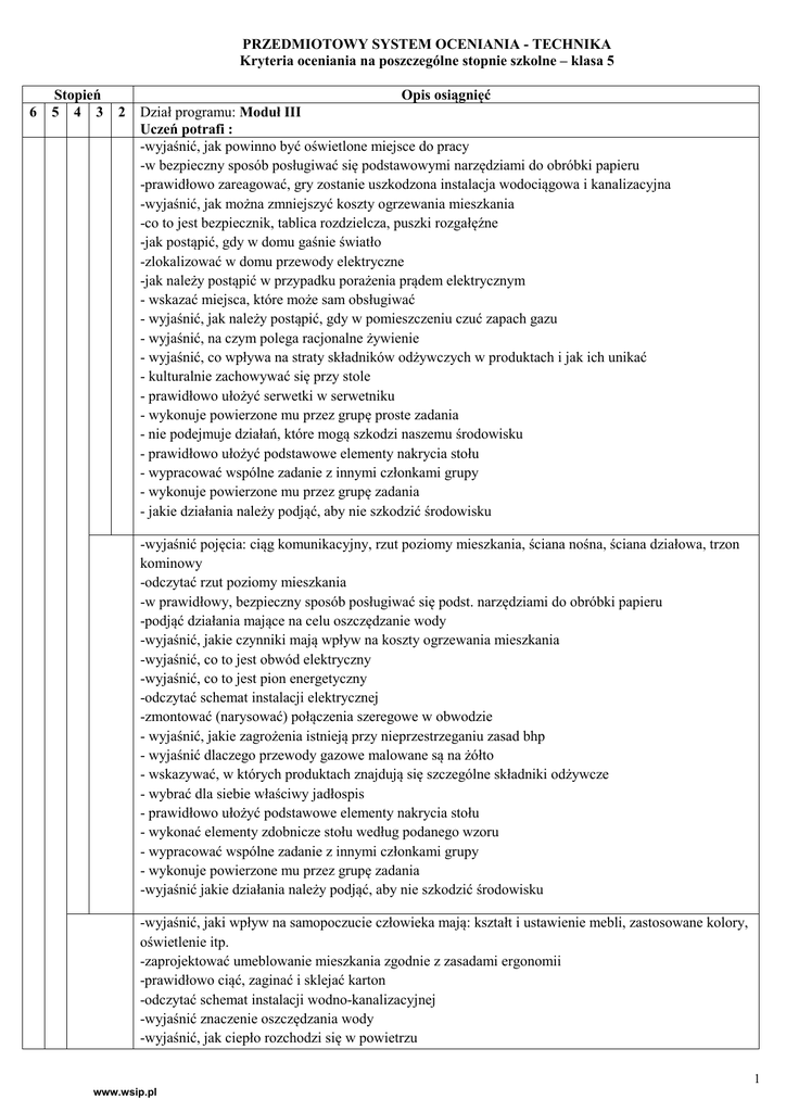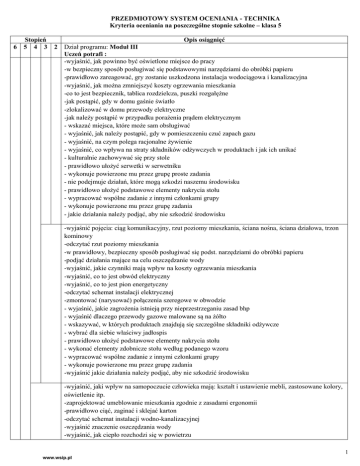 PRZEDMIOTOWY SYSTEM OCENIANIA - TECHNIKA Kryteria oceniania na poszczególne stopnie szkolne – klasa 5 6 Stopień 5 4 3 Opis osiągnięć 2 Dział programu: Moduł III Uczeń potrafi : -wyjaśnić, jak powinno być oświetlone miejsce do pracy -w bezpieczny sposób posługiwać się podstawowymi narzędziami do obróbki papieru -prawidłowo zareagować, gry zostanie uszkodzona instalacja wodociągowa i kanalizacyjna -wyjaśnić, jak można zmniejszyć koszty ogrzewania mieszkania -co to jest bezpiecznik, tablica rozdzielcza, puszki rozgałęźne -jak postąpić, gdy w domu gaśnie światło -zlokalizować w domu przewody elektryczne -jak należy postąpić w przypadku porażenia prądem elektrycznym - wskazać miejsca, które może sam obsługiwać - wyjaśnić, jak należy postąpić, gdy w pomieszczeniu czuć zapach gazu - wyjaśnić, na czym polega racjonalne żywienie - wyjaśnić, co wpływa na straty składników odżywczych w produktach i jak ich unikać - kulturalnie zachowywać się przy stole - prawidłowo ułożyć serwetki w serwetniku - wykonuje powierzone mu przez grupę proste zadania - nie podejmuje działań, które mogą szkodzi naszemu środowisku - prawidłowo ułożyć podstawowe elementy nakrycia stołu - wypracować wspólne zadanie z innymi członkami grupy - wykonuje powierzone mu przez grupę zadania - jakie działania należy podjąć, aby nie szkodzić środowisku -wyjaśnić pojęcia: ciąg komunikacyjny, rzut poziomy mieszkania, ściana nośna, ściana działowa, trzon kominowy -odczytać rzut poziomy mieszkania -w prawidłowy, bezpieczny sposób posługiwać się podst. narzędziami do obróbki papieru -podjąć działania mające na celu oszczędzanie wody -wyjaśnić, jakie czynniki mają wpływ na koszty ogrzewania mieszkania -wyjaśnić, co to jest obwód elektryczny -wyjaśnić, co to jest pion energetyczny -odczytać schemat instalacji elektrycznej -zmontować (narysować) połączenia szeregowe w obwodzie - wyjaśnić, jakie zagrożenia istnieją przy nieprzestrzeganiu zasad bhp - wyjaśnić dlaczego przewody gazowe malowane są na żółto - wskazywać, w których produktach znajdują się szczególne składniki odżywcze - wybrać dla siebie właściwy jadłospis - prawidłowo ułożyć podstawowe elementy nakrycia stołu - wykonać elementy zdobnicze stołu według podanego wzoru - wypracować wspólne zadanie z innymi członkami grupy - wykonuje powierzone mu przez grupę zadania -wyjaśnić jakie działania należy podjąć, aby nie szkodzić środowisku -wyjaśnić, jaki wpływ na samopoczucie człowieka mają: kształt i ustawienie mebli, zastosowane kolory, oświetlenie itp. -zaprojektować umeblowanie mieszkania zgodnie z zasadami ergonomii -prawidłowo ciąć, zaginać i sklejać karton -odczytać schemat instalacji wodno-kanalizacyjnej -wyjaśnić znaczenie oszczędzania wody -wyjaśnić, jak ciepło rozchodzi się w powietrzu 1 www.wsip.pl -narysować spiralę za pomocą cyrkla -ciąć papier po okręgu -przeprowadzać proste doświadczenia -wyjaśnić co to jest prąd elektryczny -wyjaśnić co to jest natężenie prądu i natężenie źródła prądu - zmontować (narysować) połączenia równoległe -wyjaśnić, jaka jest różnica między połączeniami szeregowymi i równoległymi - wyszukiwać potrzebne informacje z tabeli zapotrzebowania energetycznego i tabeli wartości energetycznej produktów - ułożyć dzienny jadłospis - odczytać schemat instalacji gazowej - wyjaśnić, jakie działania należy podjąć w celu oszczędności gazu - prawidłowo nakryć do stołu - potrafi współpracować z innymi grupami -terminowo wykonuje swoja pracę - jak środki czystości wpływają na stan naszego środowiska -zaplanować kolorystykę wyposażenia mieszkania -racjonalnie zaplanować rozmieszczenie pomieszczeń -skutki marnotrawstwa wody -wyjaśnić co to jest moc urządzeń elektrycznych -wyjaśnić, od czego zależy ilość zużytej energii elektrycznej -wyjaśnić w jaki sposób można oszczędzać energię elektryczną - wyjaśnić, jakie skutki niesie ze sobą marnotrawienie gazu - ułożyć dla siebie trzydniowy jadłospis - wyjaśnić zagrożenia wynikające z bulimii i anoreksji - dzieli się swoimi pomysłami z innymi członkami grupy - czuwa nad właściwym przebiegiem prac - obsłużyć biesiadników zgodnie z zasadami dobrego wychowania -wyciągać prawidłowe wnioski przeprowadzonych doświadczeń -zdiagnozować, dlaczego obwodzie nie płynie prąd elektryczny - zaprojektować wystrój stołu w zależności od okoliczności - reaguje na zauważone zjawiska zniszczenia naszego środowiska 6 Stopień 5 4 3 2 Opis osiągnięć Dział programu: Moduł IV UCZEŃ: potrafi - wymienić dokumenty , w których należy szukać potrzebnych informacji, dotyczących obsługi urządzeń - prawidłowo przygotować produkty do przechowywania w chłodziarce - wyjaśnić jakie zmiany nastąpiły w budowie urządzeń w ostatnich latach (np:. pralki) - zasady bezpiecznego korzystania z odkurzacza i suszarki do włosów -odczytać piktogramy na wszywkach odzieży -przygotować odzież do prania (posegregować, pozapinać, dokładnie opróżnić kieszenie) -dobrać program prania zgodny z zaleceniami na wszywkach -odczytać informacje zawarte na fakturach 2 www.wsip.pl - wyszukiwać potrzebne informacje na temat obsługi urządzenia w instrukcji - wyjaśnić, co to jest ciąg roboczy i przy pomocy nauczyciela zaprojektować w swojej kuchni - prawidłowo rozmieścić produkty żywnościowe w chłodziarce - odczytać z opakowania produktu spożywczego informacje na temat jego prawidłowego przechowywania - wyjaśnić, jakie zmiany w technice mają związek ze zwiększeniem bezpieczeństwa użytkowania - wyjaśnić, w jaki sposób można w czasie prania oszczędzać wodę i energię elektryczną -obliczyć całkowitą wysokość opłat domowych - korzystać z informacji na temat obsługi i konserwacji urządzenia, zawartych w instrukcji i karci