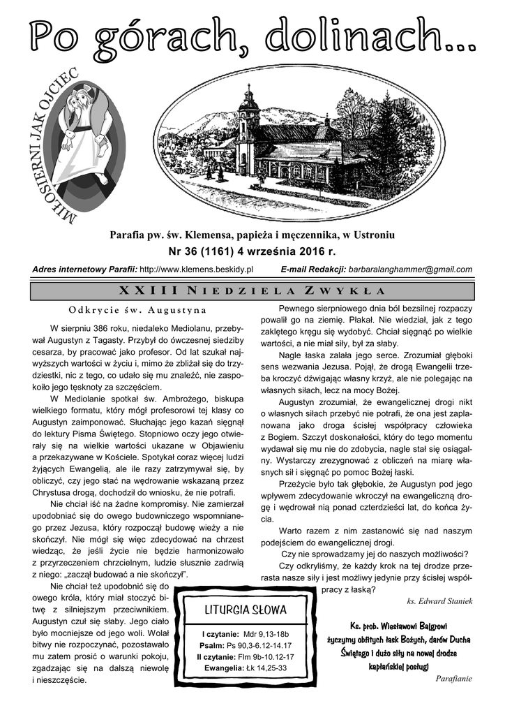 Parafia pw. św. Klemensa, papieża i męczennika, w Ustroniu Nr 36 (1161) 4 września 2016 r. Adres internetowy Parafii: http://www.klemens.beskidy.pl X X I I I N E-mail Redakcji: [email protected] I E D Z I E L A Odkrycie św. Augustyna Z W Y K Ł A Pewnego sierpniowego dnia ból bezsilnej rozpaczy powalił go na ziemię. Płakał. Nie wiedział, jak z tego zaklętego kręgu się wydobyć. Chciał sięgnąć po wielkie wartości, a nie miał siły, był za słaby. Nagle łaska zalała jego serce. Zrozumiał głęboki sens wezwania Jezusa. Pojął, że drogą Ewangelii trzeba kroczyć dźwigając własny krzyż, ale nie polegając na własnych siłach, lecz na mocy Bożej. Augustyn zrozumiał, że ewangelicznej drogi nikt o własnych siłach przebyć nie potrafi, że ona jest zaplanowana jako droga ścisłej współpracy człowieka z Bogiem. Szczyt doskonałości, który do tego momentu wydawał się mu nie do zdobycia, nagle stał się osiągalny. Wystarczy zrezygnować z obliczeń na miarę własnych sił i sięgnąć po pomoc Bożej łaski. Przeżycie było tak głębokie, że Augustyn pod jego wpływem zdecydowanie wkroczył na ewangeliczną drogę i wędrował nią ponad czterdzieści lat, do końca życia. Warto razem z nim zastanowić się nad naszym podejściem do ewangelicznej drogi. Czy nie sprowadzamy jej do naszych możliwości? Czy odkryliśmy, że każdy krok na tej drodze przerasta nasze siły i jest możliwy jedynie przy ścisłej współpracy z łaską? ks. Edward Staniek W sierpniu 386 roku, niedaleko Mediolanu, przebywał Augustyn z Tagasty. Przybył do ówczesnej siedziby cesarza, by pracować jako profesor. Od lat szukał najwyższych wartości w życiu i, mimo że zbliżał się do trzydziestki, nic z tego, co udało się mu znaleźć, nie zaspokoiło jego tęsknoty za szczęściem. W Mediolanie spotkał św. Ambrożego, biskupa wielkiego formatu, który mógł profesorowi tej klasy co Augustyn zaimponować. Słuchając jego kazań sięgnął do lektury Pisma Świętego. Stopniowo oczy jego otwierały się na wielkie wartości ukazane w Objawieniu a przekazywane w Kościele. Spotykał coraz więcej ludzi żyjących Ewangelią, ale ile razy zatrzymywał się, by obliczyć, czy jego stać na wędrowanie wskazaną przez Chrystusa drogą, dochodził do wniosku, że nie potrafi. Nie chciał iść na żadne kompromisy. Nie zamierzał upodobniać się do owego budowniczego wspomnianego przez Jezusa, który rozpoczął budowę wieży a nie skończył. Nie mógł się więc zdecydować na chrzest wiedząc, że jeśli życie nie będzie harmonizowało z przyrzeczeniem chrzcielnym, ludzie słusznie zadrwią z niego: „zaczął budować a nie skończył”. Nie chciał też upodobnić się do owego króla, który miał stoczyć bitwę z silniejszym przeciwnikiem. LITURGIA SŁOWA Augustyn czuł się słaby. Jego ciało było mocniejsze od jego woli. Wolał I czytanie: Mdr 9,13-18b bitwy nie rozpoczynać, pozostawało Psalm: Ps 90,3-6.12-14.17 mu zatem prosić o warunki pokoju, II czytanie: Flm 9b-10.12-17 Ewangelia: Łk 14,25-33 zgadzając się na dalszą niewolę 4i nieszczęście. września 2016 r. Ks. prob. Wiesławowi Bajgrowi życzymy obfitych łask Bożych, darów Ducha Świętego i dużo siły na nowej drodze kapłańskiej posługi PO GÓRACH, DOLINACH... Parafianie 1 Naucz nas liczyć dni nasze, byśmy zdobyli mądrość serca. (Ps 90) Wielkie tłumy szły z Jezusem. On zwrócił się i rzekł do nich: Jeśli kto przychodzi do Mnie, a nie ma w nienawiści swego ojca i matki, żony i dzieci, braci i sióstr, nadto siebie samego, nie może być moim uczniem. Kto nie nosi swego krzyża, a idzie za Mną, ten nie może być moim uczniem. Bo któż z was, chcąc zbudować wieżę, nie usiądzie wpierw i nie oblicza wydatków, czy ma na wykończenie? Inaczej, gdyby założył fundament, a nie zdołałby wykończyć, wszyscy, patrząc na to, zaczęliby drwić z niego: Ten człowiek zaczął budować, a nie zdołał wykończyć. Albo który król, mając wyruszyć, aby stoczyć bitwę z drugim królem, nie usiądzie wpierw i nie rozważy, czy w dziesięć tysięcy ludzi może stawić czoło temu, który z dwudziestoma tysiącami nadciąga przeciw niemu? Jeśli nie, wyprawia poselstwo, gdy tamten jest jeszcze daleko, i prosi o warunki pokoju. Tak więc nikt z was, kto nie wyrzeka się wszystkiego, co posiada, nie może być moim uczniem. (Łk 14, 2533). Za Jezusem idą wielkie tłumy. Większość z nich to ludzie, którzy chcą stać się uczniami Chrystusa. Każdy z nich ma swoje własne wyobrażenie o warunkach o warunkach “uczęszczania do szkoły” Nauczyciela z Nazaretu. Aby tych ludzi nie oszukiwać i nie dawać im złudnych nadziei, Jezus jasno określa kryteria naśladowania Go. Pierwszym z warunków jest wybór Jego osoby i Jego zasad ponad miłość do najbliższych. Słowa Chrystusa o nienawiści wobec członków rodziny i siebie samego mogą szokować. Trzeba jednak wziąć pod uwagę cechy języka, którym Jezus się posługuje. Było to na przykład używanie ostrych kontrastów dla uwydatnienia określonej prawdy. Ten język nie uznawał stanów pośrednich np. jeżeli coś nie było białe, to musiało być czarne (odcienie kolorów nie wchodziły w grę). W tym sensie Zbawiciel podkreśla, że ten, kto chce być Jego uczniem, w sytuacjach konfliktowych musi być gotowy postawić Jego osobę i wolę przed pragnieniami najbliższej rodziny. Na zewnątrz będzie to przypominało nienawiść, ale tak naprawdę nie będzie. Warto w tym kontekście przypomnieć historię świętego Franciszka z Asyżu. Ojciec Franciszka chciał, aby jego syn odziedziczył po nim firmę handlową. Młodzieniec jednak oddał ojcu wszystko, co od niego otrzymał, włącznie z ubraniem, i odszedł z domu, aby realizować to, co rozeznał jako wolę Bożą dla siebie. Dla osób postronnych wyglądało to jak nienawiść wobec ojca, ale tak naprawdę to Franciszek po prostu wybrał wię