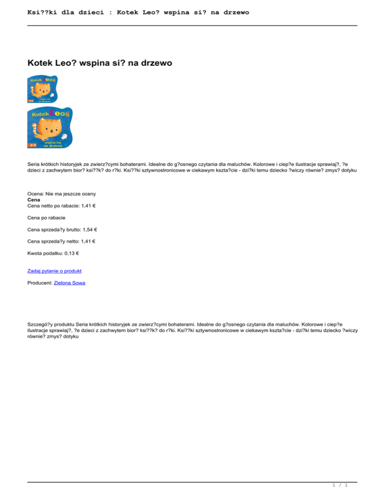 Ksi??ki dla dzieci : Kotek Leo? wspina si? na drzewo Kotek Leo? wspina si? na drzewo Seria krótkich historyjek ze zwierz?cymi bohaterami. Idealne do g?osnego czytania dla maluchów. Kolorowe i ciep?e ilustracje sprawiaj?, ?e dzieci z zachwytem bior? ksi??k? do r?ki. Ksi??ki sztywnostronicowe w ciekawym kszta?cie - dzi?ki temu dziecko ?wiczy równie? zmys? dotyku Ocena: Nie ma jeszcze oceny Cena Cena netto po rabacie: 1,41 € Cena po rabacie Cena sprzeda?y brutto: 1,54 € Cena sprzeda?y netto: 1,41 € Kwota podatku: 0,13 € Zadaj pytanie o produkt Producent: Zielona Sowa Szczegó?y produktu Seria krótkich historyjek ze zwierz?cymi bohaterami. Idealne do g?osnego czytania dla maluchów. Kolorowe i ciep?e ilustracje sprawiaj?, ?e dzieci z zachwytem bior? ksi??k? do r?ki. Ksi??ki sztywnostronicowe w ciekawym kszta?cie - dzi?ki temu dziecko ?wiczy równie? zmys? dotyku 1 / 1 Powered by TCPDF (www.tcpdf.org)