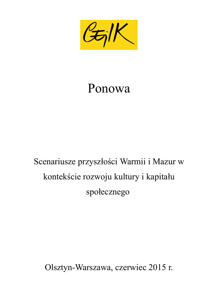 -1- Ponowa Scenariusze przyszłości Warmii i Mazur w kontekście rozwoju kultury i kapitału społecznego Olsztyn-Warszawa, czerwiec 2015 r. -2Streszczenie Raport „Ponowa” podsumowuje projekt badawczy realizowany jako segment większego programu „Dynamiczna diagnoza kultury Warmii i Mazur”. Celem „Ponowy” było wypracowanie scenariuszy rozwoju Warmii i Mazur w oparciu o syntezę istniejących opracowań analityczno-strategicznych oraz pracę zespołów ekspertów z wykorzystaniem metodyki foresight oraz sformułowanie wstępnych rekomendacji odnośnie polityk rozwojowych szczebla regionalnego i lokalnego, ze szczególnym uwzględnieniem działań w przestrzeni kultury. Punktem wyjścia do „Ponowy” stało się pytanie nasuwające się po lekturze wniosków z badania „Kultura pod pochmurnym niebem – dynamiczna diagnoza kultury Warmii i Mazur” w kontekście lektury innych opracowań analitycznych badających kondycję społeczną-ekonomiczną regionu: jak będzie wyglądał region, życie mieszkańców konkretnych gmin, miast i miasteczek w 2030 r.? Jakie zasoby zdecydują o modelu społeczno-gospodarczym i czy będzie miał on trwały, rozwojowy potencjał? Czy kultura będzie czynnikiem wspomagającym czy też hamującym rozwój regionu? Autorzy projektu pytają o kulturę w kontekście współczesnych teorii i koncepcji rozwoju zwracających uwagę na istotną rolę kultury w mobilizowaniu zasobów o kluczowym znaczeniu dla kreowania wartości o charakterze gospodarczym i społecznym. Projekt „Ponowa” realizowany był w I półroczu 2015 r. -3Przyszłość jako wyzwanie i jako zasób Przyszłość jest wyzwaniem – stwierdzenie to brzmi jak banalna oczywistość. Całe przyszłe życie jednostek i społeczeństw rozegra się w przyszłości, która jednak z przyczyn fundamentalnych jest nieprzewidywalna. Na tę cechę rzeczywistości zwracał uwagę jeden z najwybitniejszych filozofów XX w., Karl Rajmund Popper. Nie jesteśmy w stanie przewidywać tego, co się stanie z zasadniczego powodu – człowiek jest istotą twórczą, innowacyjną, zdolną do tworzenia nowości: wynalazków, odkryć naukowych, dzieł sztuki. Te nowości mogą stać się podstawą innowacji technicznych, kulturowych, społecznych, politycznych zmieniających całkowicie dotychczasowy bieg życia. To właśnie te innowacje umożliwiają rozwój rozumiany jako możliwość zaspokajania potrzeb indywidualnych i społecznych poprzez efektywne wykorzystanie dostępnych zasobów. Innowacje powodują, że to, co dziś traktowane jest jako nieużyteczny odpad jutro może stać się podstawą działania gospodarki. Ropa naftowa przez długi czas traktowana była jako wydzielina ziemi zatruwająca wody, zanim Jan Zech i Ignacy Łukasiewicz zamienili ją w procesie destylacji w użyteczne paliwo. Tym samym dali sygnał do nowej rewolucji przemysłowej i budowy cywilizacji opartej na „czarnym złocie”. Dziś nowym złotem są wielkomiejskie odpady komunalne, ważne źródło wielu deficytowych surowców. Nieprzewidywalna przyszłość jest więc wyzwaniem, z którym zmagamy się poprzez rozwijanie różnych metod oceny i zarządzania ryzykiem. Ale też przyszłość, z powodów przedstawionych w poprzednim akapicie jest także najważniejszym zasobem rozwojowym. To w niej wydarzą się wszystkie innowacje, jakie umożliwią rozwój. Nie jesteśmy w stanie ich przewidzieć, możemy jednak tak zarządzać tym zasobem, by w jak największym stopniu uprawdopodobnić pojawienie się nowych rozwiązań i idei, które zdecydują o tym, jak ludzie będą żyć za dekadę, dwie i więcej. Efektywne zarządzanie przyszłością jako zasobem rozwojowym wymaga jednak zarówno znajomości kontekstu kulturowego tworzącego pole symboliczne dla wspólnych wyobrażeń o tym co możliwe i co pożądane, co warte wyrzeczeń, co godne inwestycji czasu, intelektu, kreatywności; jak i odpowiednich technik, za pomocą których wspomnianym wyżej reprezentacjom symbolicznym nadać można operacyjną strukturę w postaci ukonkretnionych wizji, możliwych scenariuszy, propozycji organizacyjnych. -4Myślenie o przyszłości między futurofilią i futurofobią1: 1. Świat znajduje się w swoistym kryzysie przyszłości zidentyfikowanym m.in. przez Krzysztofa Pomiana w 1980 r. w głośnej publikacji w „Le Debat”i. Kryzys ten przejawia się paradoksalną erozją zaufania do dwóch kluczowych gwarantów przyszłości w epoce nowoczesnej: systemu nauki i techniki oraz państwa. Począwszy od publikacji takich, jak „Cicha Wiosnaii” i „Granice wzrostuiii” z 1972 r. zaczyna upowszechniać się świadomość, że postęp nie ma charakteru liniowego, że nauka i technika są nie tylko źródłem rozwiązań, lecz także zagrożeń. Równolegle od początku lat 70. trwa krytyka państwa w ramach dyskursu neoliberalnego – państwo zostaje zidentyfikowane jako źródło problemów, a nie rozwiązań. Oba dyskursy mają charakter paradoksalny, bo jednocześnie trwa wielka cyfrowa rewolucja technologiczna zmieniająca podstawy funkcjonowania współczesnych społeczeństw. Rewolucja ta jest daleka od zakończenia, raczej można mówić, że wkracza w decydującą fazę. Jednocześnie nasila się dyskusja o granicach wzrostu i postępu, włączają się do niej coraz bardziej prominentne nazwiska świata nauk społecznych, ekonomii, nauki i technologiiiv. 2. Polska przeżywa kryzys przyszłości na swój sposób – po futurofilii politycznej jakiej wyrazem był PRL ze swą wiarą w możliwość planowania postępu oraz futurofilii krytycznej, jakiej genialnym wyrazicielem był Stanisław Lem wkroczyliśmy po 1989 r. w okres futurofobii. Jej dobrym wyrazem jest wypowiedź Andrzeja Stasiuka w Fadov: Nigdy nie myślałem o przyszłości jako o jakimś rozwiązaniu. Przyszłość jest zawsze ucieczką głupców. Nadchodzi, a oni muszą ją usprawiedliwiać, że nie nadeszła taka, jak trzeba, albo udowadniać, że jest w