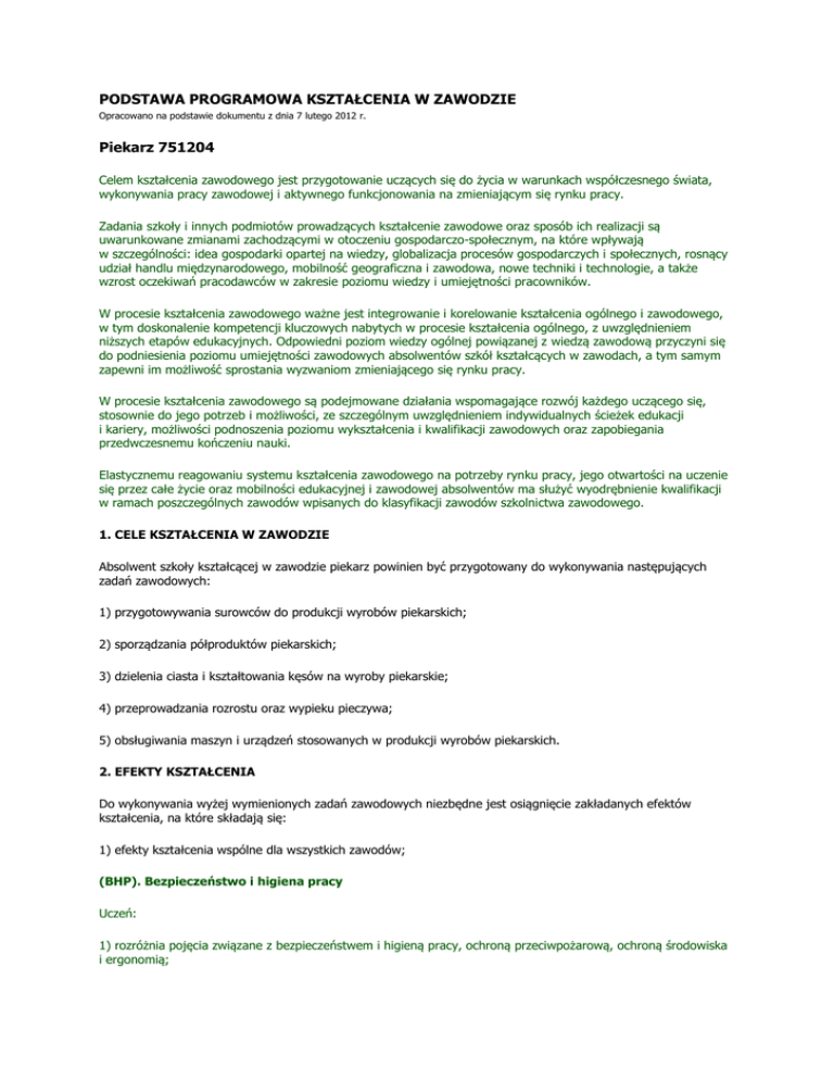 PODSTAWA PROGRAMOWA KSZTAŁCENIA W ZAWODZIE Opracowano na podstawie dokumentu z dnia 7 lutego 2012 r. Piekarz 751204 Celem kształcenia zawodowego jest przygotowanie uczących się do życia w warunkach współczesnego świata, wykonywania pracy zawodowej i aktywnego funkcjonowania na zmieniającym się rynku pracy. Zadania szkoły i innych podmiotów prowadzących kształcenie zawodowe oraz sposób ich realizacji są uwarunkowane zmianami zachodzącymi w otoczeniu gospodarczo-społecznym, na które wpływają w szczególności: idea gospodarki opartej na wiedzy, globalizacja procesów gospodarczych i społecznych, rosnący udział handlu międzynarodowego, mobilność geograficzna i zawodowa, nowe techniki i technologie, a także wzrost oczekiwań pracodawców w zakresie poziomu wiedzy i umiejętności pracowników. W procesie kształcenia zawodowego ważne jest integrowanie i korelowanie kształcenia ogólnego i zawodowego, w tym doskonalenie kompetencji kluczowych nabytych w procesie kształcenia ogólnego, z uwzględnieniem niższych etapów edukacyjnych. Odpowiedni poziom wiedzy ogólnej powiązanej z wiedzą zawodową przyczyni się do podniesienia poziomu umiejętności zawodowych absolwentów szkół kształcących w zawodach, a tym samym zapewni im możliwość sprostania wyzwaniom zmieniającego się rynku pracy. W procesie kształcenia zawodowego są podejmowane działania wspomagające rozwój każdego uczącego się, stosownie do jego potrzeb i możliwości, ze szczególnym uwzględnieniem indywidualnych ścieżek edukacji i kariery, możliwości podnoszenia poziomu wykształcenia i kwalifikacji zawodowych oraz zapobiegania przedwczesnemu kończeniu nauki. Elastycznemu reagowaniu systemu kształcenia zawodowego na potrzeby rynku pracy, jego otwartości na uczenie się przez całe życie oraz mobilności edukacyjnej i zawodowej absolwentów ma służyć wyodrębnienie kwalifikacji w ramach poszczególnych zawodów wpisanych do klasyfikacji zawodów szkolnictwa zawodowego. 1. CELE KSZTAŁCENIA W ZAWODZIE Absolwent szkoły kształcącej w zawodzie piekarz powinien być przygotowany do wykonywania następujących zadań zawodowych: 1) przygotowywania surowców do produkcji wyrobów piekarskich; 2) sporządzania półproduktów piekarskich; 3) dzielenia ciasta i kształtowania kęsów na wyroby piekarskie; 4) przeprowadzania rozrostu oraz wypieku pieczywa; 5) obsługiwania maszyn i urządzeń stosowanych w produkcji wyrobów piekarskich. 2. EFEKTY KSZTAŁCENIA Do wykonywania wyżej wymienionych zadań zawodowych niezbędne jest osiągnięcie zakładanych efektów kształcenia, na które składają się: 1) efekty kształcenia wspólne dla wszystkich zawodów; (BHP). Bezpieczeństwo i higiena pracy Uczeń: 1) rozróżnia pojęcia związane z bezpieczeństwem i higieną pracy, ochroną przeciwpożarową, ochroną środowiska i ergonomią; 2) rozróżnia zadania i uprawnienia instytucji oraz służb działających w zakresie ochrony pracy i ochrony środowiska w Polsce; 3) określa prawa i obowiązki pracownika oraz pracodawcy w zakresie bezpieczeństwa i higieny pracy; 4) przewiduje zagrożenia dla zdrowia i życia człowieka oraz mienia i środowiska związane z wykonywaniem zadań zawodowych; 5) określa zagrożenia związane z występowaniem szkodliwych czynników w środowisku pracy; 6) określa skutki oddziaływania czynników szkodliwych na organizm człowieka; 7) organizuje stanowisko pracy zgodnie z obowiązującymi wymaganiami ergonomii, przepisami bezpieczeństwa i higieny pracy, ochrony przeciwpożarowej i ochrony środowiska; 8) stosuje środki ochrony indywidualnej i zbiorowej podczas wykonywania zadań zawodowych; 9) przestrzega zasad bezpieczeństwa i higieny pracy oraz stosuje przepisy prawa dotyczące ochrony przeciwpożarowej i ochrony środowiska; 10) udziela pierwszej pomocy poszkodowanym w wypadkach przy pracy oraz w stanach zagrożenia zdrowia i życia. (PDG). Podejmowanie i prowadzenie działalności gospodarczej Uczeń: 1) stosuje pojęcia z obszaru funkcjonowania gospodarki rynkowej; 2) stosuje przepisy prawa pracy, przepisy prawa dotyczące ochrony danych osobowych oraz przepisy prawa podatkowego i prawa autorskiego; 3) stosuje przepisy prawa dotyczące prowadzenia działalności gospodarczej; 4) rozróżnia przedsiębiorstwa i instytucje występujące w branży i powiązania między nimi; 5) analizuje działania prowadzone przez przedsiębiorstwa funkcjonujące w branży; 6) inicjuje wspólne przedsięwzięcia z różnymi przedsiębiorstwami z branży; 7) przygotowuje dokumentację niezbędną do uruchomienia i prowadzenia działalności gospodarczej; 8) prowadzi korespondencję związaną z prowadzeniem działalności gospodarczej; 9) obsługuje urządzenia biurowe oraz stosuje programy komputerowe wspomagające prowadzenie działalności gospodarczej; 10) planuje i podejmuje działania marketingowe prowadzonej działalności gospodarczej; 11) optymalizuje koszty i przychody prowadzonej działalności gospodarczej. (JOZ). Język obcy ukierunkowany zawodowo Uczeń: 1) posługuje się zasobem środków językowych (leksykalnych, gramatycznych, ortograficznych oraz fonetycznych), umożliwiających realizację zadań zawodowych; 2) interpretuje wypowiedzi dotyczące wykonywania typowych czynności zawodowych artykułowane powoli i wyraźnie, w standardowej odmianie języka; 3) analizuje i interpretuje krótkie teksty pisemne dotyczące wykonywania typowych czynności zawodowych; 4) formułuje krótkie i zrozumiałe wypowiedzi oraz teksty pisemne umożliwiające komunikowanie się w środowisku pracy; 5) korzysta z obcojęzycznych źródeł informacji. (KPS). Kompetencje personalne i społeczne Uczeń: 1) przestrzega zasad kultury i etyki; 2) jest kreatywny i konsekwentny w realizacji zadań; 3) przewiduje skutki podejmowanych działań; 4) jest otwarty na zmiany; 5) potrafi radzić sobie ze stresem; 6) aktualizuje wiedzę i doskonali umiejętności zawodowe;