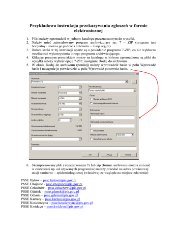 Przykładowa instrukcja przekazywania zgłoszeń w formie elektronicznej 1. Pliki należy zgromadzić w jednym katalogu przeznaczonym do wysyłki. 2. Należy mieć zainstalowany program archiwizujący np. 7 – ZIP (program jest bezpłatny i można go pobrać z Internetu – 7-zip.org.pl) 3. Dalsze kroki w tej instrukcji oparte są o posiadanie programu 7-ZIP, co nie wyklucza możliwości wykorzystania innego programu archiwizującego. 4. Klikając prawym przyciskiem myszy na katalogu w którym zgromadzone są pliki do wysyłki należy wybrać opcje 7-ZIP, następnie Dodaj do archiwum. 5. W oknie Dodaj do archiwum (poniżej) należy wprowadzić hasło w polu Wprowadź hasło i następnie je potwierdzić w polu Wprowadź ponownie hasło. 6. Skompresowany plik z rozszerzeniem 7z lub zip (format archiwum można zmienić w zależności np. od używanych programów) należy przesłać na adres powiatowej stacji sanitarno – epidemiologicznej (właściwej ze względu na miejsce zdarzenia) PSSE Bytów – [email protected] PSSE Chojnice - [email protected] PSSE Człuchów – [email protected] PSSE Gdańsk – [email protected] PSSE Gdynia – [email protected] PSSE Kartuzy – [email protected] PSSE Kościerzyna – [email protected] PSSE Kwidzyn – [email protected] PSSE Lębork – [email protected] PSSE Malbork – [email protected] PSSE Nowy Dwór Gdański – [email protected] PSSE Puck – [email protected] PSSE Pruszcz Gdański – [email protected] PSSE Słupsk – [email protected] PSSE Sopot – [email protected] PSSE Starogard Gdański – [email protected] PSSE Tczew – [email protected] PSSE Wejherowo – [email protected] 7. Hasło należy ustalić z Odbiorcą (przedstawicielem Państwowego Powiatowego Inspektora Sanitarnego telefonicznie bądź osobiście. Hasło powinno być bezpieczne i przynajmniej raz w miesiącu powinno być zmieniane). 8. Wykaz numerów telefonów poszczególnych powiatowych stacji sanitarno – epidemiologicznych znajduje się na stronie www.wsse.gda.pl