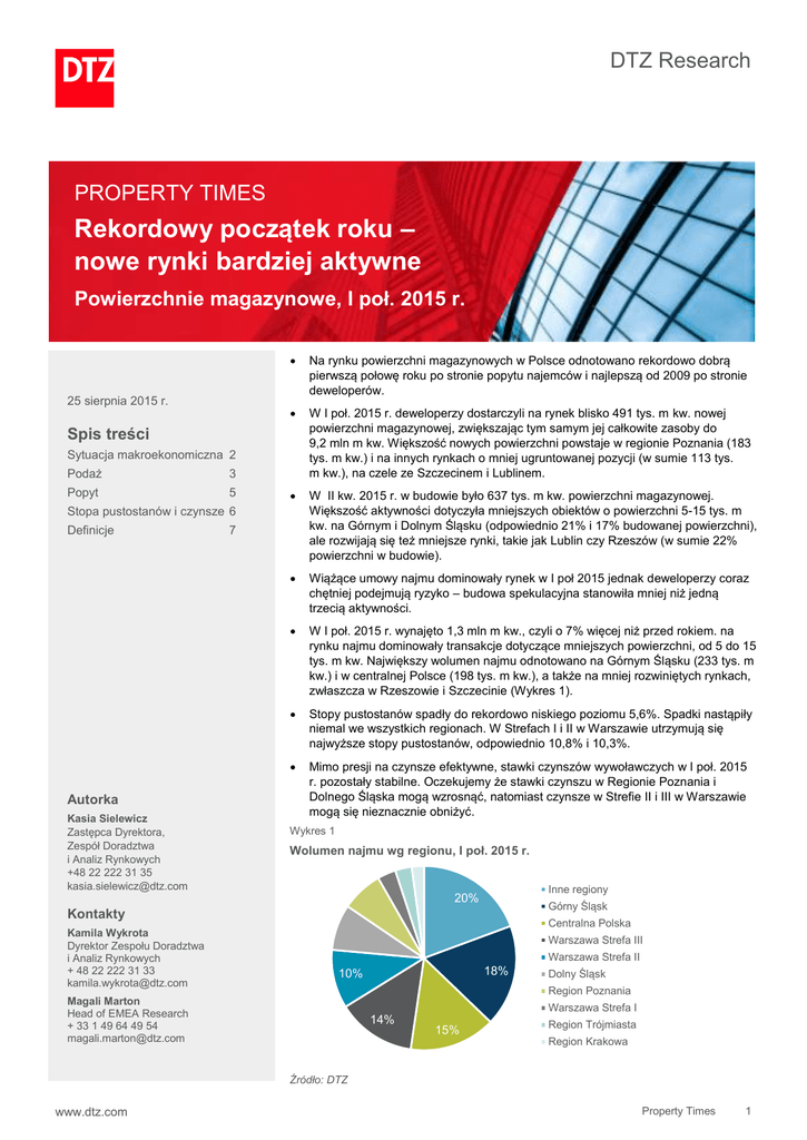 DTZ Research PROPERTY TIMES Rekordowy początek roku – nowe rynki bardziej aktywne Powierzchnie magazynowe, I poł. 2015 r. 25 sierpnia 2015 r. Na rynku powierzchni magazynowych w Polsce odnotowano rekordowo dobrą pierwszą połowę roku po stronie popytu najemców i najlepszą od 2009 po stronie deweloperów. W I poł. 2015 r. deweloperzy dostarczyli na rynek blisko 491 tys. m kw. nowej powierzchni magazynowej, zwiększając tym samym jej całkowite zasoby do 9,2 mln m kw. Większość nowych powierzchni powstaje w regionie Poznania (183 tys. m kw.) i na innych rynkach o mniej ugruntowanej pozycji (w sumie 113 tys. m kw.), na czele ze Szczecinem i Lublinem. W II kw. 2015 r. w budowie było 637 tys. m kw. powierzchni magazynowej. Większość aktywności dotyczyła mniejszych obiektów o powierzchni 5-15 tys. m kw. na Górnym i Dolnym Śląsku (odpowiednio 21% i 17% budowanej powierzchni), ale rozwijają się też mniejsze rynki, takie jak Lublin czy Rzeszów (w sumie 22% powierzchni w budowie). Wiążące umowy najmu dominowały rynek w I poł 2015 jednak deweloperzy coraz chętniej podejmują ryzyko – budowa spekulacyjna stanowiła mniej niż jedną trzecią aktywności. W I poł. 2015 r. wynajęto 1,3 mln m kw., czyli o 7% więcej niż przed rokiem. na rynku najmu dominowały transakcje dotyczące mniejszych powierzchni, od 5 do 15 tys. m kw. Największy wolumen najmu odnotowano na Górnym Śląsku (233 tys. m kw.) i w centralnej Polsce (198 tys. m kw.), a także na mniej rozwiniętych rynkach, zwłaszcza w Rzeszowie i Szczecinie (Wykres 1). Stopy pustostanów spadły do rekordowo niskiego poziomu 5,6%. Spadki nastąpiły niemal we wszystkich regionach. W Strefach I i II w Warszawie utrzymują się najwyższe stopy pustostanów, odpowiednio 10,8% i 10,3%. Mimo presji na czynsze efektywne, stawki czynszów wywoławczych w I poł. 2015 r. pozostały stabilne. Oczekujemy że stawki czynszu w Regionie Poznania i Dolnego Śląska mogą wzrosnąć, natomiast czynsze w Strefie II i III w Warszawie mogą się nieznacznie obniżyć. Spis treści Sytuacja makroekonomiczna 2 Podaż 3 Popyt 5 Stopa pustostanów i czynsze 6 Definicje Autorka Kasia Sielewicz Zastępca Dyrektora, Zespół Doradztwa i Analiz Rynkowych +48 22 222 31 35 [email protected] 7 Wykres 1 Wolumen najmu wg regionu, I poł. 2015 r. 3% Inne regiony 20% Górny Śląsk Kontakty Kamila Wykrota Dyrektor Zespołu Doradztwa i Analiz Rynkowych + 48 22 222 31 33 [email protected] Centralna Polska Warszawa Strefa III Warszawa Strefa II 18% 10% Dolny Śląsk Region Poznania Magali Marton Head of EMEA Research + 33 1 49 64 49 54 [email protected] Warszawa Strefa I 14% 15% Region Trójmiasta Region Krakowa Źródło: DTZ www.dtz.com Property Times 1 Polska, Powierzchnie przemysłowe i logistyczne, I poł. 2015 r. Wykres 2 Sytuacja makroekonomiczna Wzrost PKB i stopa inflacji w Polsce 8% Wzrost gospodarczy i inflacja 7% W pierwszym kwartale 2015 roku polska gospodarka stabilnie rosła, osiągając wzrost PKB rok do roku na poziomie 3,6% (Wykres 2). Głównym motorem napędowym pozostawał dalszy wzrost popytu, wzmocniony przez zwyżkę poziomów konsumpcji oraz dynamiczny wzrost inwestycji przedsiębiorstw. Poprawiająca się sytuacja gospodarcza w krajach UE również przyczyniła się do wzrostu PKB dzięki wzrostowi wartości eksportu o 5,2% rok do roku. Jak na razie rosyjskie embargo nie wywarło znacznego wpływu na gospodarkę Polski, przyczyniając się raczej do zmiany kierunku eksportu na Europę Zachodnią i Chiny. Również inne wskaźniki ekonomiczne sugerują poprawę: indeks ufności konsumentów (CCI), wzrósł w czerwcu o 3,2 pp., co stanowi najlepszy wynik od połowy 2008 roku. 6% 4% 3% 2% 1% 0% Wzrost PKB Wykres 3 Wzrost sprzedaży detalicznej i produkcji przemysłowej 12% Wskaźnik cen towarów i usług spadł w drugim kwartale 2015 roku do -0,8% w związku ze spadkiem cen paliw i żywności. W celu ożywienia gospodarki i walki z deflacją, Rada Polityki Pieniężnej obniżyła stopy procentowe w styczniu 2015 r. do rekordowo niskiego poziomu stopy referencyjnej: 1,5%. W najbliższych miesiącach nie spodziewamy się dalszych obniżek stóp. 10% Kursy walut -4% 8% 6% 4% 2% Sprzedaż detaliczna Źródło: Główny Urząd Statystyczny Wykres 4 W drugim kwartale 2015 roku odnotowano wzrost sprzedaży detalicznej o 3,5% rok do roku w związku z deflacją oraz poprawą nastrojów konsumentów (Wykres 3). Produkcja przemysłowa w drugim kwartale 2015 roku wzrosła średnio o 3,9% rok do roku, w porównaniu do 3,7% w 2014 roku (Wykres 3). Wzrostowi poziomów produkcji przemysłowej towarzyszył wzrost wydajności, średnio o 3,4% rok do roku. Ministerstwo Gospodarki przewiduje, że w 2015 roku produkcja przemysłowa wzrośnie o 3,7%. Przeciętne miesięczne wynagrodzenie (PLN) i stopa bezrobocia w Polsce 4 500 4 000 3 500 3 000 2 500 2 000 1 500 1 000 500 0 Wynagrodzenie 2 kw. 2015 2014 2013 2012 2011 2010 2009 2008 2007 2006 20% 18% 16% 14% 12% 10% 8% 6% 4% 2% 0% 2005 Wzrost popytu na pracę spowodował podwyżkę średniej pensji w sektorze przedsiębiorstw nominalnie o 3% rok do roku, do poziomu 4 066 zł brutto. Stopa bezrobocia nieznacznie spadła, do 10,3% w drugim kwartale 2015 roku i oczekuje się, że utrzyma się na tym poziomie do końca roku (Wykres 4). Względnie wysoka stopa bezrobocia ogranicza tempo wzrostu pensji oraz inflację. 2 kw. 2015 Produkcja sprzedana przemysłu Sprzedaż detaliczna i produkcja przemysłowa Rynek pracy 1 kw. 2015 4 kw. 2014 3 kw. 2014 2 kw. 2014 1 kw. 2014 4 kw. 2013 3 kw. 2013 2 kw. 2013 1 kw. 2013 4 kw. 2012 3 kw. 2012 2 kw. 2012 1 kw. 2012 4 kw. 2011 3 kw. 2011 0% -2% 2 kw. 2011 W pierwszej połowie 2015 roku złoty stracił zarówno w stosunku do euro, jak i do dolara. Osłabienie polskiej waluty wynikło w dużej mierze z czynników zewnętrznych, takich jak decyzja o porzuceniu polityki obrony minimalnego kursu wymiany euro na franka przez SBN, a także program poluzowania pol