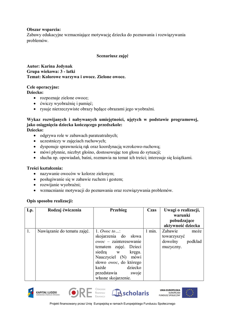 Obszar wsparcia: Zabawy edukacyjne wzmacniające motywację dziecka do poznawania i rozwiązywania problemów. Scenariusz zajęć Autor: Karina Jedynak Grupa wiekowa: 3 - latki Temat: Kolorowe warzywa i owoce. Zielone owoce. Cele operacyjne: Dziecko: rozpoznaje zielone owoce; ćwiczy wyobraźnię i pamięć; rysuje nierzeczywiste obrazy będące obrazami jego wyobraźni. Wykaz rozwijanych i nabywanych umiejętności, ujętych w podstawie programowej, jako osiągnięcia dziecka kończącego przedszkole: Dziecko: odgrywa role w zabawach parateatralnych; uczestniczy w zajęciach ruchowych; dysponuje sprawnością rąk oraz koordynacją wzrokowo-ruchową; mówi płynnie, niezbyt głośno, dostosowując ton głosu do sytuacji; słucha np. opowiadań, baśni, rozmawia na temat ich treści; interesuje się książkami. Treści kształcenia: nazywanie owoców w kolorze zielonym; posługiwanie się w zabawie ruchem i gestem; rozwijanie wyobraźni; wzmacnianie motywacji do poznawania oraz rozwiązywania problemów. Opis sposobu realizacji: Lp. 1. Rodzaj ćwiczenia Nawiązanie do tematu zajęć. Przebieg Czas 1. Owoc to…: 1 min. skojarzenia do słowa owoc – zainteresowanie tematem zajęć. Dzieci siedzą w kręgu. Nauczyciel (N) mówi słowo owoc, do którego każde dziecko przedstawia swoje własne skojarzenie. Uwagi o realizacji, warunki pobudzające aktywność dziecka Zabawie może towarzyszyć dowolny podkład muzyczny. Projekt finansowany przez Unię Europejską w ramach Europejskiego Funduszu Społecznego 2. Ćwiczenia Ćwiczenia usprawniające pamięci. Ćwiczenia dramowe. 3. 4. Ćwiczenia właściwe Ćwiczenia kończące 1. Zielone i smaczne: 2 min. zachęcenie dzieci do uważnego oglądania pokazu zdjęć i zapamiętania wyświetlanych owoców. Następnie wspólne wymienienie nazw zapamiętanych owoców. 2. Arbuz i kiwi: 2 min. Dzieci stoją w kręgu. N mówi, że trzyma w ręku ciężkiego arbuza. Zadaniem dzieci jest podawanie sobie niewidzialnego arbuza z rąk do rąk. Gdy owoc wróci do N, zamienia się go na lekkie, małe kiwi, które również jest przekazywane z rąk do rąk po kręgu. 1. Zielona kraina: 10 min zachęcenie dzieci do uważnego wysłuchania opowiadania. Materiały: pokaz zdjęć (załącznik nr 5). 2. Zielone jabłuszko: dzieci otrzymują szablon, na którym rysują swoją wymarzoną Zielona Krainę. Materiały: (załącznik kredki. 3. Kolorowy arbuz: dzieci otrzymują szablon przedstawiający arbuza. Kolorują go wg własnego pomysłu tak, aby nie był w kolorze zielonym. Materiały: ilustracja (załącznik nr 2), kredki. 4. Kiwi: chętne dzieci mogą ułożyć puzzle. 1. Owoce, do koszyka!: 2 min zabawa ruchowa. N dzieli dzieci na 4 grupy: arbuzy, jabłka, Materiały: puzzle (załącznik nr 3). Zabawie może towarzyszyć dowolny podkład muzyczny. Materiały: nagranie audio opowiadania (załącznik nr 6). szablon nr 1), Materiały: ilustracje (załącznik nr 4), skakanki, tamburyno. Projekt finansowany przez Unię Europejską w ramach Europejskiego Funduszu Społecznego kiwi i limonki. Na środku sali N układa ze skakanek okrąg. Dzieci biegają swobodnie po sali. Gdy usłyszą dźwięk tamburyna, zatrzymują się spoglądając na N, który podnosi do góry kartę symbolizującą jeden z 4 owoców. Te dzieci, których symbol jest w górze wskakują do koszyka, czyli kręgu zrobionego ze skakanek 2. Zagraj z owocami: chętne dzieci mogą zagrać w gry multimedialne. Materiały: gry multimedialne (załączniki nr 7 i 8). Uwagi: Propozycje zawarte w scenariuszu zostały przygotowane w taki sposób, aby nauczyciel mógł dostosować czas realizacji zajęć do możliwości dzieci w grupie oraz z zachowaniem tzw. zasady 1/5, zalecanej w części podstawy programowej dotyczącej zalecanych warunków i sposobu jej realizacji. Zajęcia nie powinny trwać dłużej niż 15 minut. Jeżeli niektóre dzieci pomimo upływu czasu są zainteresowane proponowanymi działaniami nie należy im przerywać tej aktywności. Dzieci, których uwaga się wyczerpała, w naturalny sposób powracają do realizacji „programu własnego”, czyli wybranego przez siebie rodzaju aktywności (np. zabawowej). Metody za M. Kwiatowską (1985): Czynne: ćwiczeń praktycznych. Słowne: objaśnienia i instrukcje. Percepcyjne: obserwacja i pokaz, przykład dorosłych. Formy: praca indywidualna jednolita i zróżnicowana, zbiorowa jednolita. Środki dydaktyczne: tamburyno, skakanki, kredki, dowolny podkład muzyczny, komputer z dostępem do Internetu oraz głośnikami lub tablica multimedialna, środki dydaktyczne zamieszczone na portalu Scholaris (dla nauczyciela do wykorzystania w pracy z dzieckiem): 1. 2. 3. 4. 5. 6. 7. Szablon - Zielone jabłuszko; Kolorowanka - Kolorowy arbuz; Puzzle - Kiwi; Owoce, do koszyka! - symbole czterech owoców; Pokaz zdjęć - Zielone i smaczne; Plik dźwiękowy - Zielona Kraina; Multimedialna gra memory - Zielone owoce; Projekt finansowany przez Unię Europejską w ramach Europejskiego Funduszu Społecznego 8. Kolorowanka multimedialna - Różnokolorowe owoce. Projekt finansowany przez Unię Europejską w ramach Europejskiego Funduszu Społecznego