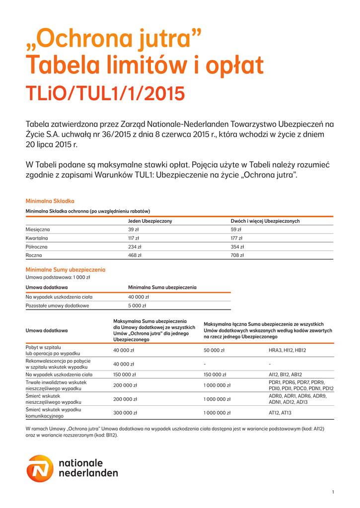 „Ochrona jutra” Tabela limitów i opłat TLiO/TUL1/1/2015 Tabela zatwierdzona przez Zarząd Nationale-Nederlanden Towarzystwo Ubezpieczeń na Życie S.A. uchwałą nr 36/2015 z dnia 8 czerwca 2015 r., która wchodzi w życie z dniem 20 lipca 2015 r. W Tabeli podane są maksymalne stawki opłat. Pojęcia użyte w Tabeli należy rozumieć zgodnie z zapisami Warunków TUL1: Ubezpieczenie na życie „Ochrona jutra”. Minimalna Składka Minimalna Składka ochronna (po uwzględnieniu rabatów) Jeden Ubezpieczony Dwóch i więcej Ubezpieczonych Miesięczna 39 zł 59 zł Kwartalna 117 zł 177 zł Półroczna 234 zł 354 zł Roczna 468 zł 708 zł Minimalne Sumy ubezpieczenia Umowa podstawowa: 1 000 zł Umowa dodatkowa Minimalna Suma ubezpieczenia Na wypadek uszkodzenia ciała 40 000 zł Pozostałe umowy dodatkowe 5 000 zł Umowa dodatkowa Pobyt w szpitalu lub operacja po wypadku Rekonwalescencja po pobycie w szpitalu wskutek wypadku Na wypadek uszkodzenia ciała Trwałe inwalidztwo wskutek nieszczęśliwego wypadku Śmierć wskutek nieszczęśliwego wypadku Śmierć wskutek wypadku komunikacyjnego Maksymalna Suma ubezpieczenia dla Umowy dodatkowej ze wszystkich Umów „Ochrona jutra” dla jednego Ubezpieczonego Maksymalna łączna Suma ubezpieczenia ze wszystkich Umów dodatkowych wskazanych według kodów zawartych na rzecz jednego Ubezpieczonego 40 000 zł 50 000 zł HRA3, HI12, HB12 40 000 zł - - 150 000 zł 150 000 zł 200 000 zł 1 000 000 zł 200 000 zł 1 000 000 zł AI12, BI12, AB12 PDR1, PDR6, PDR7, PDR9, PDI0, PDI1, PDC0, PDN1, PD12 ADR0, ADR1, ADR6, ADR9, ADN1, AD12, AD13 300 000 zł 1 000 000 zł AT12, AT13 W ramach Umowy „Ochrona jutra” Umowa dodatkowa na wypadek uszkodzenia ciała dostępna jest w wariancie podstawowym (kod: AI12) oraz w wariancie rozszerzonym (kod: BI12). 1 Rabaty 1. Rabat za częstotliwość opłacania Składki Kwartalna Półroczna Roczna 1% 2,3% 5% 2. Rabat za metodę płatności 5% za opłacanie Składki ochronnej za pomocą polecenia zapłaty. 3. Rabat za kolejnego ubezpieczonego 10% Składki ochronnej, jeżeli ochroną ubezpieczeniową są objęte co najmniej 2 osoby. 4. Rabat za pakiet Naliczany w przypadku, gdy zakres ubezpieczenia obejmuje poniższe Umowy dodatkowe ze wskazanymi Sumami ubezpieczenia: Wariant I Pakiet Umowy dodatkowe Suma ubezpieczenia Pobyt w szpitalu lub operacja po wypadku 10 000 zł – 19 999,99 zł Rekonwalescencja po pobycie w szpitalu wskutek 10 000 zł – 14 999,99 zł wypadku Rabat za każdą Umowę dodatkową w pakiecie 10% Powrót do zdrowia Wariant I Pakiet Umowy dodatkowe Pobyt w szpitalu lub operacja po wypadku Uszkodzenie ciała: wariant podstawowy Uszkodzenie ciała: wariant rozszerzony Rabat za każdą Umowę dodatkową w pakiecie W razie wypadku Pakiet Umowy dodatkowe Pobyt w szpitalu lub operacja po wypadku Rekonwalescencja po pobycie w szpitalu wskutek wypadku Na wszelki wypadek Uszkodzenie ciała: wariant podstawowy Uszkodzenie ciała: wariant rozszerzony Rabat za każdą Umowę dodatkową w pakiecie Pakiet Umowy dodatkowe Trwałe inwalidztwo wskutek nieszczęśliwego wypadku Na poważny wypadek Śmierć wskutek nieszczęśliwego wypadku Śmierć wskutek wypadku komunikacyjnego Rabat za każdą Umowę dodatkową w pakiecie Wariant II od 20 000 zł od 15 000 zł 15% Wariant II Suma ubezpieczenia 10 000 zł – 19 999,99 zł 40 000 zł – 150 000 zł 10% od 20 000 zł 40 000 zł – 150 000 zł 15% Wariant I Wariant II Suma ubezpieczenia 5 000 zł – 14 999,99 zł od 15 000 zł 5 000 zł – 14 999,99 zł od 15 000 zł 40 000 zł – 150 000 zł 10% 40 000 zł – 150 000 zł 15% Wariant I Wariant II Suma ubezpieczenia 50 000 zł – 99 999,99 zł od 100 000 zł 50 000 zł – 99 999,99 zł 50 000 zł – 149 999,99 zł 10% od 100 000 zł od 150 000 zł 15% 5. Rabat za ostrożność 5% za każdą Umowę dodatkową zawartą w pakiecie zawierającym Umowę dodatkową na wypadek uszkodzenia ciała, jeśli w czasie trwania tego pakietu Ubezpieczony nie uległ wypadkowi skutkującemu wypłatą pieniędzy z tytułu Uszkodzenia ciała. • Rabat za ostrożność przyznawany jest na kolejny 5-letni okres trwania pakietu i zwiększa rabat za pakiet o 5%. • Wypłata z tytułu Umowy dodatkowej na wypadek uszkodzenia ciała oznacza, że rabat za ostrożność nie zostanie naliczony. Wysokość technicznej stopy procentowej Wysokość technicznej stopy procentowej do kalkulacji rezerw techniczno-ubezpieczeniowych dla Umowy wskazana jest na stronie Nationale-Nederlanden pod adresem www.nn.pl/techniczne-stopy-procentowe. 2 TLiO_TUL1_08.06.2015 r.