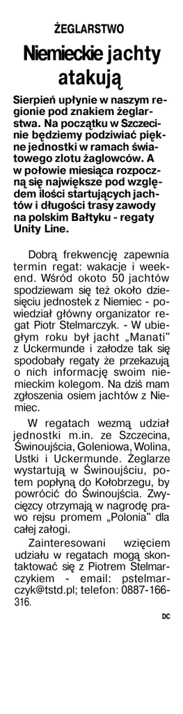 ŻEGLARSTWO Niemieckie jachty atakują Sierpień upłynie w naszym regionie pod znakiem żeglarstwa. Na początku w Szczecinie będziemy podziwiać piękne jednostki w ramach światowego zlotu żaglowców. A w połowie miesiąca rozpoczną się największe pod względem ilości startujących jachtów i długości trasy zawody na polskim Bałtyku - regaty Unity Line. Dobrą frekwencję zapewnia termin regat: wakacje i weekend. Wśród okoto 50 jachtów spodziewam się też około dziesięciu jednostek z Niemiec - powiedział główny organizator regat Piotr Stelmarczyk. - W ubiegłym roku był jacht „Manati" z Uckermunde i załodze tak się spodobały regaty że przekazują o nich informację swoim niemieckim kolegom. Na dziś mam zgłoszenia osiem jachtów z Niemiec. W regatach wezmą udział jednostki m.in. ze Szczecina, Świnoujścia, Goleniowa, Wolina, Ustki i Uckermunde. Żeglarze wystartują w Świnoujściu, potem popłyną do Kołobrzegu, by powrócić do Świnoujścia. Zwycięzcy otrzymają w nagrodę prawo rejsu promem „Polonia" dla całej załogi. Zainteresowani wzięciem udziału w regatach mogą skontaktować się z Piotrem Stelmarczykiem - email: [email protected]; telefon: 0887-166316. DC