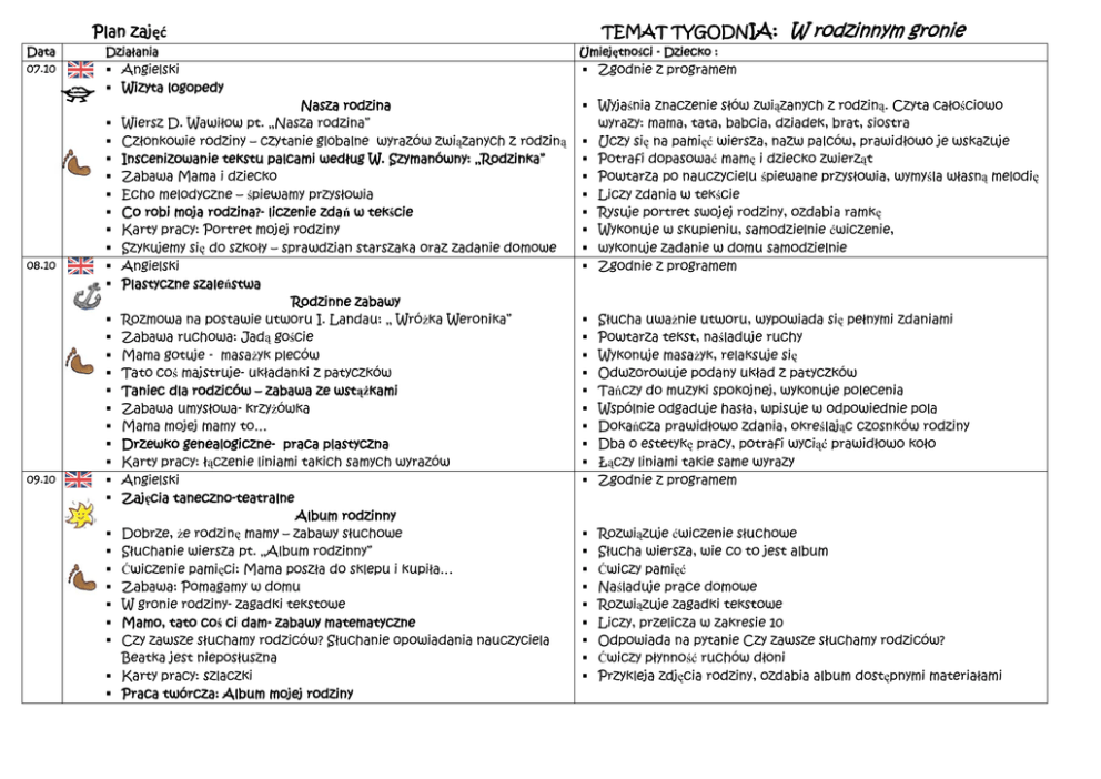 TEMAT TYGODNIA: Plan zajęć Data 07.10 08.10 09.10 Działania Umiejętności - Dziecko : Angielski Wizyta logopedy Zgodnie z programem Nasza rodzina Wiersz D. Wawiłow pt. „Nasza rodzina” Członkowie rodziny – czytanie globalne wyrazów związanych z rodziną Inscenizowanie tekstu palcami według W. Szymanówny: „Rodzinka” Zabawa Mama i dziecko Echo melodyczne – śpiewamy przysłowia Co robi moja rodzina?- liczenie zdań w tekście Karty pracy: Portret mojej rodziny Szykujemy się do szkoły – sprawdzian starszaka oraz zadanie domowe Angielski Plastyczne szaleństwa Rodzinne zabawy Rozmowa na postawie utworu I. Landau: „ Wróżka Weronika” Zabawa ruchowa: Jadą goście Mama gotuje - masażyk pleców Tato coś majstruje- układanki z patyczków Taniec dla rodziców – zabawa ze wstążkami Zabawa umysłowa- krzyżówka Mama mojej mamy to… Drzewko genealogiczne- praca plastyczna Karty pracy: łączenie liniami takich samych wyrazów Angielski Zajęcia taneczno-teatralne Album rodzinny Dobrze, że rodzinę mamy – zabawy słuchowe Słuchanie wiersza pt. „Album rodzinny” Ćwiczenie pamięci: Mama poszła do sklepu i kupiła… Zabawa: Pomagamy w domu W gronie rodziny- zagadki tekstowe Mamo, tato coś ci dam- zabawy matematyczne Czy zawsze słuchamy rodziców? Słuchanie opowiadania nauczyciela Beatka jest nieposłuszna Karty pracy: szlaczki Praca twórcza: Album mojej rodziny W rodzinnym gronie Wyjaśnia znaczenie słów związanych z rodziną. Czyta całościowo wyrazy: mama, tata, babcia, dziadek, brat, siostra Uczy się na pamięć wiersza, nazw palców, prawidłowo je wskazuje Potrafi dopasować mamę i dziecko zwierząt Powtarza po nauczycielu śpiewane przysłowia, wymyśla własną melodię Liczy zdania w tekście Rysuje portret swojej rodziny, ozdabia ramkę Wykonuje w skupieniu, samodzielnie ćwiczenie, wykonuje zadanie w domu samodzielnie Zgodnie z programem Słucha uważnie utworu, wypowiada się pełnymi zdaniami Powtarza tekst, naśladuje ruchy Wykonuje masażyk, relaksuje się Odwzorowuje podany układ z patyczków Tańczy do muzyki spokojnej, wykonuje polecenia Wspólnie odgaduje hasła, wpisuje w odpowiednie pola Dokańcza prawidłowo zdania, określając czosnków rodziny Dba o estetykę pracy, potrafi wyciąć prawidłowo koło Łączy liniami takie same wyrazy Zgodnie z programem Rozwiązuje ćwiczenie słuchowe Słucha wiersza, wie co to jest album Ćwiczy pamięć Naśladuje prace domowe Rozwiązuje zagadki tekstowe Liczy, przelicza w zakresie 10 Odpowiada na pytanie Czy zawsze słuchamy rodziców? Ćwiczy płynność ruchów dłoni Przykleja zdjęcia rodziny, ozdabia album dostępnymi materiałami 10.10 11.10 Angielski Rytmika To moja rodzina Zabawa integracyjna „Mam na imię..., moja mama ma na imię.. Moja rodzina – praca z obrazkiem Zabawa skojarzeniowa Gdy słyszę słowo rodzina, to myślę o... Bajka relaksacyjna: Mama małego wróbelka Gdzie są babci okulary? – zabawa tropiąca Zabawa matematyczna: Poczęstunek dla dziadków Uczynny wnuczek – zabawa ruchowa z woreczkami Lizaki od wujka – ćwiczenie kierunków w przestrzeni Karty pracy: rysowanie po śladach odpowiednimi kolorami Praca techniczna : Prezencik Angielski Basen- zajęcia fakultatywne Moje imię Słuchanie opowiadania: „O dziewczynce, która zgubiła swoje imię” Układamy rymy do swoich imion Moje imię – próby układania swojego imienia z liter, bez wzoru Zabawy z wykorzystaniem tekstu D. Gellner pt. „Małe smoki” Ćwiczenie relaksacyjne wszystkich części ciała Zgodnie z programem Potrafi podać imiona najbliższych, integruje się Wypowiada się na temat, rozwija twórcze myślenie Słucha bajki, uczy się relaksacji, wizualizacji, obniżania niepokoju Rozwiązuje zadania, dąży do osiągnięcia celu, chętnie się bawi Rozwiązuje zadania matematyczne Rozwija sprawność ruchową Określa kierunki nad, pod, pomiędzy, z prawej, lewej strony Rysuje po śladach odpowiednimi kolorami Wykonuje prezent dla biskiej osoby, rozwija sprawność manualną Zgodnie z programem Słucha opowiadania, włącza się w rozmowę Rozwija percepcję wzrokową, słuchową, sprawia radość Podejmuje próby układania swojego imienia z liter, bez wzoru Uczy się wiersza na pamięć, powtarza tekst w rytmie kołysanki oraz w różnym natężeniu Relaksuje się, odprężą, wykonuje poprawnie ćwiczenia