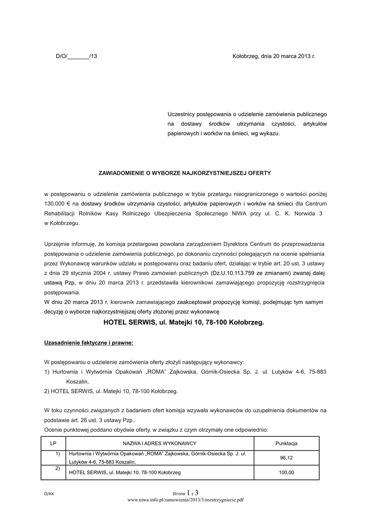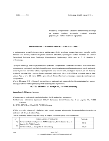 D/O/_______/13 Kołobrzeg, dnia 20 marca 2013 r. Uczestnicy postępowania o udzielenie zamówienia publicznego na dostawy środków utrzymania czystości, artykułów papierowych i worków na śmieci, wg wykazu. ZAWIADOMIENIE O WYBORZE NAJKORZYSTNIEJSZEJ OFERTY w postępowaniu o udzielenie zamówienia publicznego w trybie przetargu nieograniczonego o wartości poniżej 130.000 € na dostawy środków utrzymania czystości, artykułów papierowych i worków na śmieci dla Centrum Rehabilitacji Rolników Kasy Rolniczego Ubezpieczenia Społecznego NIWA przy ul. C. K. Norwida 3 w Kołobrzegu. Uprzejmie informuję, że komisja przetargowa powołana zarządzeniem Dyrektora Centrum do przeprowadzenia postępowania o udzielenie zamówienia publicznego, po dokonaniu czynności polegających na ocenie spełniania przez Wykonawcę warunków udziału w postępowaniu oraz badaniu ofert, działając w trybie art. 20 ust. 3 ustawy z dnia 29 stycznia 2004 r. ustawy Prawo zamówień publicznych (Dz.U.10.113.759 ze zmianami) zwanej dalej ustawą Pzp, w dniu 20 marca 2013 r. przedstawiła kierownikowi zamawiającego propozycję rozstrzygnięcia postępowania. W dniu 20 marca 2013 r. kierownik zamawiającego zaakceptował propozycję komisji, podejmując tym samym decyzję o wyborze najkorzystniejszej oferty złożonej przez wykonawcę HOTEL SERWIS, ul. Matejki 10, 78-100 Kołobrzeg. Uzasadnienie faktyczne i prawne: W postępowaniu o udzielenie zamówienia oferty złożyli następujący wykonawcy: 1) Hurtownia i Wytwórnia Opakowań „ROMA” Zajkowska, Górnik-Osiecka Sp. J. ul. Lutyków 4-6, 75-883 Koszalin, 2) HOTEL SERWIS, ul. Matejki 10, 78-100 Kołobrzeg. W toku czynności związanych z badaniem ofert komisja wzywała wykonawców do uzupełnienia dokumentów na podstawie art. 26 ust. 3 ustawy Pzp.. Ocenie punktowej poddano obydwie oferty, w związku z czym otrzymały one odpowiednio: LP 1) NAZWA I ADRES WYKONAWCY Hurtownia i Wytwórnia Opakowań „ROMA” Zajkowska, Górnik-Osiecka Sp. J. ul. Lutyków 4-6, 75-883 Koszalin, 2) O/KK HOTEL SERWIS, ul. Matejki 10, 78-100 Kołobrzeg Strona Punktacja 96,12 100,00 1z3 www.niwa.info.pl/zamowienia/2013/3/rozstrzygniecie.pdf Zgodnie z art. 94 ust. 1 pkt 2 ustawy Pzp informuję, że umowa w sprawie zamówienia publicznego może być zawarta w czasie nie krótszym niż 5 dni od dnia przesłania zawiadomienia o wyborze najkorzystniejszej oferty. Zapraszam do podpisania umowy dnia 27 marca 2013 r. o godz. 09:30. Jednocześnie przypominam o konieczności wniesienia zabezpieczenia należytego wykonania umowy w wysokości 10% wartości zamówienia brutto, w terminie do dnia podpisania umowy. Do wiadomości: O/KK 1) Hurtownia i Wytwórnia Opakowań „ROMA” Zajkowska, Górnik-Osiecka Sp. J. ul. Lutyków 4-6, 75-883 Koszalin, [email protected] 2) HOTEL SERWIS, ul. Matejki 10, 78-100 Kołobrzeg; [email protected], Strona 2z3 www.niwa.info.pl/zamowienia/2013/3/rozstrzygniecie.pdf 3) O/KK A.a. Strona 3z3 www.niwa.info.pl/zamowienia/2013/3/rozstrzygniecie.pdf