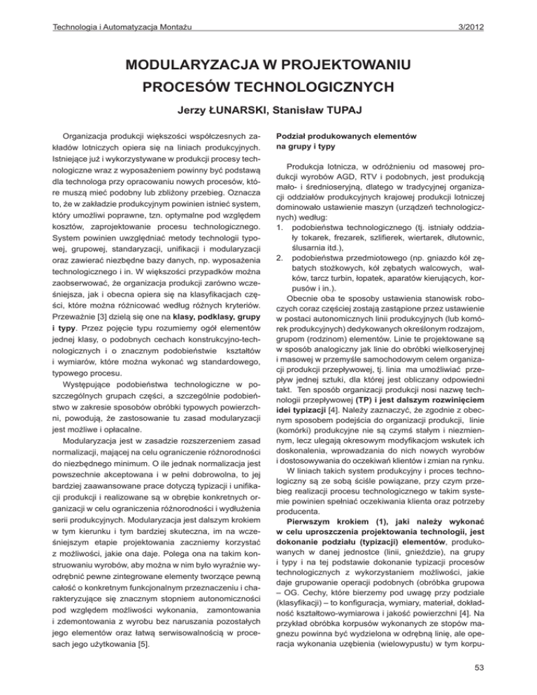 Technologia i Automatyzacja Montażu 3/2012 MODULARYZACJA W PROJEKTOWANIU PROCESÓW TECHNOLOGICZNYCH Jerzy ŁUNARSKI, Stanisław TUPAJ Organizacja produkcji większości współczesnych zakładów lotniczych opiera się na liniach produkcyjnych. Istniejące już i wykorzystywane w produkcji procesy technologiczne wraz z wyposażeniem powinny być podstawą dla technologa przy opracowaniu nowych procesów, które muszą mieć podobny lub zbliżony przebieg. Oznacza to, że w zakładzie produkcyjnym powinien istnieć system, który umożliwi poprawne, tzn. optymalne pod względem kosztów, zaprojektowanie procesu technologicznego. System powinien uwzględniać metody technologii typowej, grupowej, standaryzacji, unifikacji i modularyzacji oraz zawierać niezbędne bazy danych, np. wyposażenia technologicznego i in. W większości przypadków można zaobserwować, że organizacja produkcji zarówno wcześniejsza, jak i obecna opiera się na klasyfikacjach części, które można różnicować według różnych kryteriów. Przeważnie [3] dzielą się one na klasy, podklasy, grupy i typy. Przez pojęcie typu rozumiemy ogół elementów jednej klasy, o podobnych cechach konstrukcyjno-technologicznych i o znacznym podobieństwie kształtów i wymiarów, które można wykonać wg standardowego, typowego procesu. Występujące podobieństwa technologiczne w poszczególnych grupach części, a szczególnie podobieństwo w zakresie sposobów obróbki typowych powierzchni, powodują, że zastosowanie tu zasad modularyzacji jest możliwe i opłacalne. Modularyzacja jest w zasadzie rozszerzeniem zasad normalizacji, mającej na celu ograniczenie różnorodności do niezbędnego minimum. O ile jednak normalizacja jest powszechnie akceptowana i w pełni dobrowolna, to jej bardziej zaawansowane prace dotyczą typizacji i unifikacji produkcji i realizowane są w obrębie konkretnych organizacji w celu ograniczenia różnorodności i wydłużenia serii produkcyjnych. Modularyzacja jest dalszym krokiem w tym kierunku i tym bardziej skuteczna, im na wcześniejszym etapie projektowania zaczniemy korzystać z możliwości, jakie ona daje. Polega ona na takim konstruowaniu wyrobów, aby można w nim było wyraźnie wyodrębnić pewne zintegrowane elementy tworzące pewną całość o konkretnym funkcjonalnym przeznaczeniu i charakteryzujące się znacznym stopniem autonomiczności pod względem możliwości wykonania, zamontowania i zdemontowania z wyrobu bez naruszania pozostałych jego elementów oraz łatwą serwisowalnością w procesach jego użytkowania [5]. Podział produkowanych elementów na grupy i typy Produkcja lotnicza, w odróżnieniu od masowej produkcji wyrobów AGD, RTV i podobnych, jest produkcją mało- i średnioseryjną, dlatego w tradycyjnej organizacji oddziałów produkcyjnych krajowej produkcji lotniczej dominowało ustawienie maszyn (urządzeń technologicznych) według: 1. podobieństwa technologicznego (tj. istniały oddziały tokarek, frezarek, szlifierek, wiertarek, dłutownic, ślusarnia itd.), 2. podobieństwa przedmiotowego (np. gniazdo kół zębatych stożkowych, kół zębatych walcowych, wałków, tarcz turbin, łopatek, aparatów kierujących, korpusów i in.). Obecnie oba te sposoby ustawienia stanowisk roboczych coraz częściej zostają zastąpione przez ustawienie w postaci autonomicznych linii produkcyjnych (lub komórek produkcyjnych) dedykowanych określonym rodzajom, grupom (rodzinom) elementów. Linie te projektowane są w sposób analogiczny jak linie do obróbki wielkoseryjnej i masowej w przemyśle samochodowym celem organizacji produkcji przepływowej, tj. linia ma umożliwiać przepływ jednej sztuki, dla której jest obliczany odpowiedni takt. Ten sposób organizacji produkcji nosi nazwę technologii przepływowej (TP) i jest dalszym rozwinięciem idei typizacji [4]. Należy zaznaczyć, że zgodnie z obecnym sposobem podejścia do organizacji produkcji, linie (komórki) produkcyjne nie są czymś stałym i niezmiennym, lecz ulegają okresowym modyfikacjom wskutek ich doskonalenia, wprowadzania do nich nowych wyrobów i dostosowywania do oczekiwań klientów i zmian na rynku. W liniach takich system produkcyjny i proces technologiczny są ze sobą ściśle powiązane, przy czym przebieg realizacji procesu technologicznego w takim systemie powinien spełniać oczekiwania klienta oraz potrzeby producenta. Pierwszym krokiem (1), jaki należy wykonać w celu uproszczenia projektowania technologii, jest dokonanie podziału (typizacji) elementów, produkowanych w danej jednostce (linii, gnieździe), na grupy i typy i na tej podstawie dokonanie typizacji procesów technologicznych z wykorzystaniem możliwości, jakie daje grupowanie operacji podobnych (obróbka grupowa – OG. Cechy, które bierzemy pod uwagę przy podziale (klasyfikacji) – to konfiguracja, wymiary, materiał, dokładność kształtowo-wymiarowa i jakość powierzchni [4]. Na przykład obróbka korpusów wykonanych ze stopów magnezu powinna być wydzielona w odrębną linię, ale operacja wykonania uzębienia (wielowypustu) w tym korpu53 3/2012 Technologia i Automatyzacja Montażu sie może być kooperowana w linii kół zębatych (operacja grupowa). Korpusy pomp zębatych, ze względu na małe wymiary, będą wykonywane na odrębnej linii, a duże korpusy przekładni głównej na odrębnej linii. Możliwa jest również stypizowana obróbka zgrubna elementów podobnych z uwagi na niską dokładność. Podział na grupy jest czynnością trudną do realizacji w praktyce, ponieważ liczbie grup (rodzin) części, zgodnie z zasadą technologii typowej, musi odpowiadać taka sama liczba linii (komórek) produkcyjnych, może więc zdarzyć się tak, że zabraknie maszyn, ponieważ do dyspozycji mamy ograniczoną ich liczbę. Inny przypadek to taki, że części, które były wykonywane bez problemów, przy dotychczasowym technologicznym ustawieniu maszyn (oddział tokarek, frezarek, szlifierek i in.)