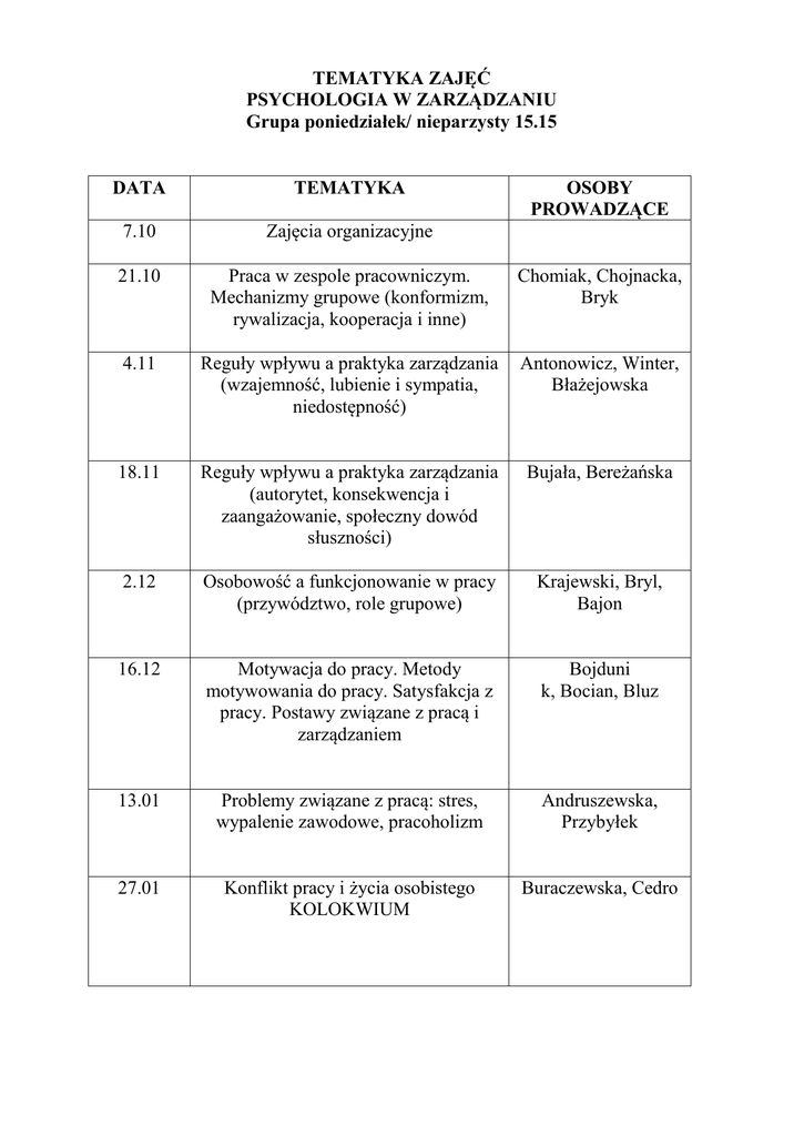 TEMATYKA ZAJĘĆ PSYCHOLOGIA W ZARZĄDZANIU Grupa