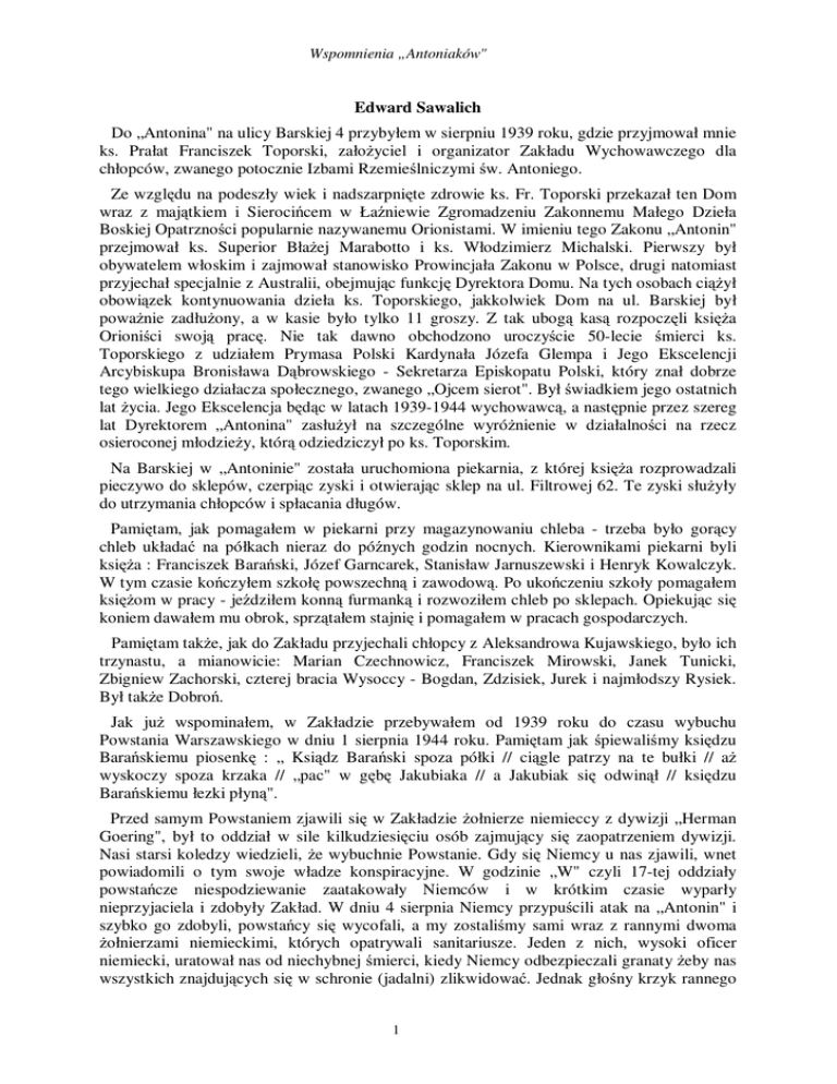 Wspomnienia „Antoniaków" Edward Sawalich Do „Antonina" na ulicy Barskiej 4 przybyłem w sierpniu 1939 roku, gdzie przyjmował mnie ks. Prałat Franciszek Toporski, załoŜyciel i organizator Zakładu Wychowawczego dla chłopców, zwanego potocznie Izbami Rzemieślniczymi św. Antoniego. Ze względu na podeszły wiek i nadszarpnięte zdrowie ks. Fr. Toporski przekazał ten Dom wraz z majątkiem i Sierocińcem w Łaźniewie Zgromadzeniu Zakonnemu Małego Dzieła Boskiej Opatrzności popularnie nazywanemu Orionistami. W imieniu tego Zakonu „Antonin" przejmował ks. Superior BłaŜej Marabotto i ks. Włodzimierz Michalski. Pierwszy był obywatelem włoskim i zajmował stanowisko Prowincjała Zakonu w Polsce, drugi natomiast przyjechał specjalnie z Australii, obejmując funkcję Dyrektora Domu. Na tych osobach ciąŜył obowiązek kontynuowania dzieła ks. Toporskiego, jakkolwiek Dom na ul. Barskiej był powaŜnie zadłuŜony, a w kasie było tylko 11 groszy. Z tak ubogą kasą rozpoczęli księŜa Orioniści swoją pracę. Nie tak dawno obchodzono uroczyście 50-lecie śmierci ks. Toporskiego z udziałem Prymasa Polski Kardynała Józefa Glempa i Jego Ekscelencji Arcybiskupa Bronisława Dąbrowskiego - Sekretarza Episkopatu Polski, który znał dobrze tego wielkiego działacza społecznego, zwanego „Ojcem sierot". Był świadkiem jego ostatnich lat Ŝycia. Jego Ekscelencja będąc w latach 1939-1944 wychowawcą, a następnie przez szereg lat Dyrektorem „Antonina" zasłuŜył na szczególne wyróŜnienie w działalności na rzecz osieroconej młodzieŜy, którą odziedziczył po ks. Toporskim. Na Barskiej w „Antoninie" została uruchomiona piekarnia, z której księŜa rozprowadzali pieczywo do sklepów, czerpiąc zyski i otwierając sklep na ul. Filtrowej 62. Te zyski słuŜyły do utrzymania chłopców i spłacania długów. Pamiętam, jak pomagałem w piekarni przy magazynowaniu chleba - trzeba było gorący chleb układać na półkach nieraz do późnych godzin nocnych. Kierownikami piekarni byli księŜa : Franciszek Barański, Józef Garncarek, Stanisław Jarnuszewski i Henryk Kowalczyk. W tym czasie kończyłem szkołę powszechną i zawodową. Po ukończeniu szkoły pomagałem księŜom w pracy - jeździłem konną furmanką i rozwoziłem chleb po sklepach. Opiekując się koniem dawałem mu obrok, sprzątałem stajnię i pomagałem w pracach gospodarczych. Pamiętam takŜe, jak do Zakładu przyjechali chłopcy z Aleksandrowa Kujawskiego, było ich trzynastu, a mianowicie: Marian Czechnowicz, Franciszek Mirowski, Janek Tunicki, Zbigniew Zachorski, czterej bracia Wysoccy - Bogdan, Zdzisiek, Jurek i najmłodszy Rysiek. Był takŜe Dobroń. Jak juŜ wspominałem, w Zakładzie przebywałem od 1939 roku do czasu wybuchu Powstania Warszawskiego w dniu 1 sierpnia 1944 roku. Pamiętam jak śpiewaliśmy księdzu Barańskiemu piosenkę : „ Ksiądz Barański spoza półki // ciągle patrzy na te bułki // aŜ wyskoczy spoza krzaka // „pac" w gębę Jakubiaka // a Jakubiak się odwinął // księdzu Barańskiemu łezki płyną". Przed samym Powstaniem zjawili się w Zakładzie Ŝołnierze niemieccy z dywizji „Herman Goering", był to oddział w sile kilkudziesięciu osób zajmujący się zaopatrzeniem dywizji. Nasi starsi koledzy wiedzieli, Ŝe wybuchnie Powstanie. Gdy się Niemcy u nas zjawili, wnet powiadomili o tym swoje władze konspiracyjne. W godzinie „W" czyli 17-tej oddziały powstańcze niespodziewanie zaatakowały Niemców i w krótkim czasie wyparły nieprzyjaciela i zdobyły Zakład. W dniu 4 sierpnia Niemcy przypuścili atak na „Antonin" i szybko go zdobyli, powstańcy się wycofali, a my zostaliśmy sami wraz z rannymi dwoma Ŝołnierzami niemieckimi, których opatrywali sanitariusze. Jeden z nich, wysoki oficer niemiecki, uratował nas od niechybnej śmierci, kiedy Niemcy odbezpieczali granaty Ŝeby nas wszystkich znajdujących się w schronie (jadalni) zlikwidować. Jednak głośny krzyk rannego 1 Wspomnienia „Antoniaków" oficera zmusił atakujących Ŝandarmów niemieckich do wstrzymania likwidacji osób znajdujących się w tym schronie, a odbezpieczone granaty rzucili w stronę sali gimnastycznej. Wtedy wyprowadzono nas i zabrano jako zakładników do Domu Akademickiego na Placu Narutowicza i tam trzymano nas do 11 sierpnia 1944 roku. Z naszej grupy zakładników (a było to kilkaset osób sprowadzonych z pobliskich domów na ul. Grójeckiej) za kaŜdego zabitego Niemca rozstrzeliwano na podwórku Akademika 10-ciu Polaków-zakładników. Nas jednak ominęły tego rodzaju represje. Przez cały ten okres w Akademiku byliśmy podtrzymywani jedynie raz dziennie kawą z brudnej wody z miejscowego zbiornika. Z Akademika zaprowadzono nas na „Zieleniak" przy ul. Opaczewskiej i tu widzieliśmy mroŜące krew w Ŝyłach akty gwałtów i morderstw. 2