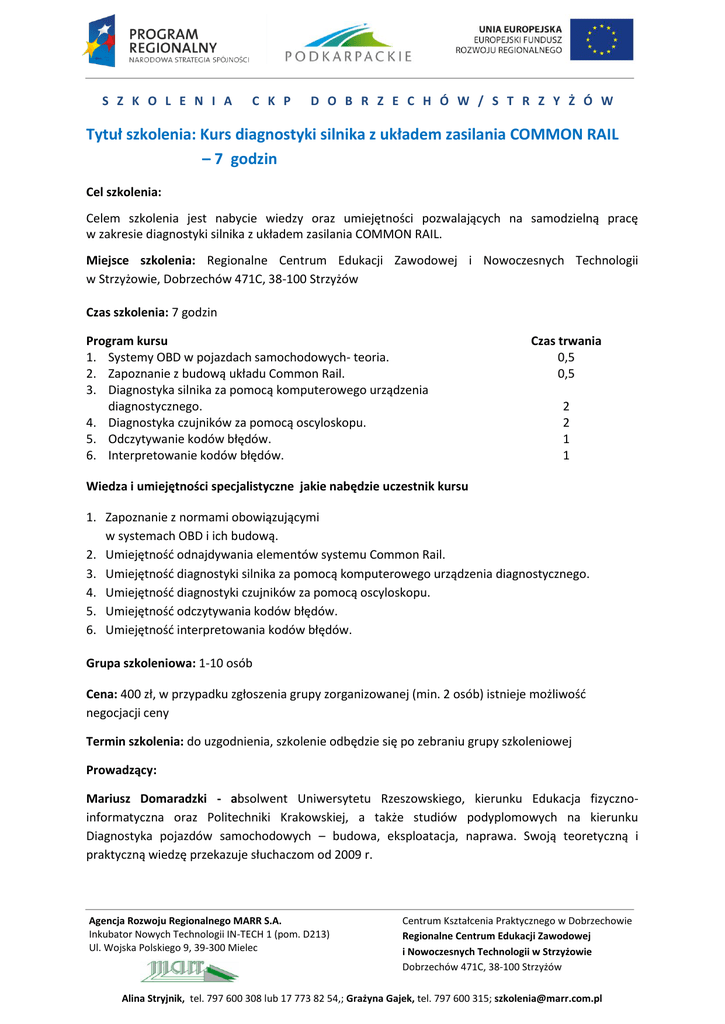 S Z K O L E N I A C K P D O B R Z E C H Ó W / S T R Z Y Ż Ó W Tytuł szkolenia: Kurs diagnostyki silnika z układem zasilania COMMON RAIL – 7 godzin Cel szkolenia: Celem szkolenia jest nabycie wiedzy oraz umiejętności pozwalających na samodzielną pracę w zakresie diagnostyki silnika z układem zasilania COMMON RAIL. Miejsce szkolenia: Regionalne Centrum Edukacji Zawodowej i Nowoczesnych Technologii w Strzyżowie, Dobrzechów 471C, 38-100 Strzyżów Czas szkolenia: 7 godzin Program kursu 1. Systemy OBD w pojazdach samochodowych- teoria. 2. Zapoznanie z budową układu Common Rail. 3. Diagnostyka silnika za pomocą komputerowego urządzenia diagnostycznego. 4. Diagnostyka czujników za pomocą oscyloskopu. 5. Odczytywanie kodów błędów. 6. Interpretowanie kodów błędów. Czas trwania 0,5 0,5 2 2 1 1 Wiedza i umiejętności specjalistyczne jakie nabędzie uczestnik kursu 1. Zapoznanie z normami obowiązującymi w systemach OBD i ich budową. 2. Umiejętność odnajdywania elementów systemu Common Rail. 3. Umiejętność diagnostyki silnika za pomocą komputerowego urządzenia diagnostycznego. 4. Umiejętność diagnostyki czujników za pomocą oscyloskopu. 5. Umiejętność odczytywania kodów błędów. 6. Umiejętność interpretowania kodów błędów. Grupa szkoleniowa: 1-10 osób Cena: 400 zł, w przypadku zgłoszenia grupy zorganizowanej (min. 2 osób) istnieje możliwość negocjacji ceny Termin szkolenia: do uzgodnienia, szkolenie odbędzie się po zebraniu grupy szkoleniowej Prowadzący: Mariusz Domaradzki - absolwent Uniwersytetu Rzeszowskiego, kierunku Edukacja fizycznoinformatyczna oraz Politechniki Krakowskiej, a także studiów podyplomowych na kierunku Diagnostyka pojazdów samochodowych – budowa, eksploatacja, naprawa. Swoją teoretyczną i praktyczną wiedzę przekazuje słuchaczom od 2009 r. Agencja Rozwoju Regionalnego MARR S.A. Inkubator Nowych Technologii IN-TECH 1 (pom. D213) Ul. Wojska Polskiego 9, 39-300 Mielec Centrum Kształcenia Praktycznego w Dobrzechowie Regionalne Centrum Edukacji Zawodowej i Nowoczesnych Technologii w Strzyżowie Dobrzechów 471C, 38-100 Strzyżów Alina Stryjnik, tel. 797 600 308 lub 17 773 82 54,; Grażyna Gajek, tel. 797 600 315; [email protected]
