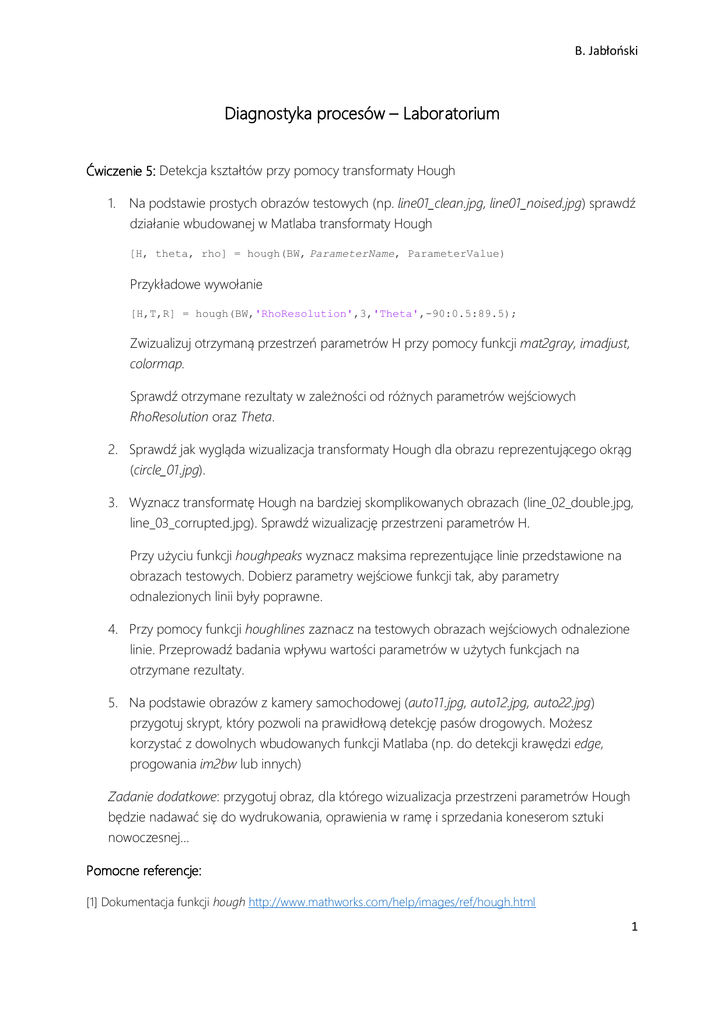 B. Jabłoński Diagnostyka procesów – Laboratorium Ćwiczenie 5: Detekcja kształtów przy pomocy transformaty Hough 1. Na podstawie prostych obrazów testowych (np. line01_clean.jpg, line01_noised.jpg) sprawdź działanie wbudowanej w Matlaba transformaty Hough [H, theta, rho] = hough(BW, ParameterName, ParameterValue) Przykładowe wywołanie [H,T,R] = hough(BW,'RhoResolution',3,'Theta',-90:0.5:89.5); Zwizualizuj otrzymaną przestrzeń parametrów H przy pomocy funkcji mat2gray, imadjust, colormap. Sprawdź otrzymane rezultaty w zależności od różnych parametrów wejściowych RhoResolution oraz Theta. 2. Sprawdź jak wygląda wizualizacja transformaty Hough dla obrazu reprezentującego okrąg (circle_01.jpg). 3. Wyznacz transformatę Hough na bardziej skomplikowanych obrazach (line_02_double.jpg, line_03_corrupted.jpg). Sprawdź wizualizację przestrzeni parametrów H. Przy użyciu funkcji houghpeaks wyznacz maksima reprezentujące linie przedstawione na obrazach testowych. Dobierz parametry wejściowe funkcji tak, aby parametry odnalezionych linii były poprawne. 4. Przy pomocy funkcji houghlines zaznacz na testowych obrazach wejściowych odnalezione linie. Przeprowadź badania wpływu wartości parametrów w użytych funkcjach na otrzymane rezultaty. 5. Na podstawie obrazów z kamery samochodowej (auto11.jpg, auto12.jpg, auto22.jpg) przygotuj skrypt, który pozwoli na prawidłową detekcję pasów drogowych. Możesz korzystać z dowolnych wbudowanych funkcji Matlaba (np. do detekcji krawędzi edge, progowania im2bw lub innych) Zadanie dodatkowe: przygotuj obraz, dla którego wizualizacja przestrzeni parametrów Hough będzie nadawać się do wydrukowania, oprawienia w ramę i sprzedania koneserom sztuki nowoczesnej… Pomocne referencje: [1] Dokumentacja funkcji hough http://www.mathworks.com/help/images/ref/hough.html 1 B. Jabłoński [2] Dokumentacja funkcji imadjust http://www.mathworks.com/help/images/ref/imadjust.html [3] Dokumentacja funkcji mat2gray http://www.mathworks.com/help/images/ref/mat2gray.html [4] Dokumentacja funkcjo colormap http://www.mathworks.com/help/matlab/ref/colormap.html [5] Dokumentacja funkcji houghpeaks http://www.mathworks.com/help/images/ref/houghpeaks.html [6] Dokumentacja funkcji houghlines http://www.mathworks.com/help/images/ref/houghlines.html Oceny: 3.0 – samodzielna realizacja zadania 1, 2 4.0 – samodzielna realizacja i rozumienie działania funkcji w zadaniu 3 5.0 – poprawna realizacja, badania i analiza wyników zadania 4 5.5 – otrzymanie sensownych rezultatów dla zadania 5 2