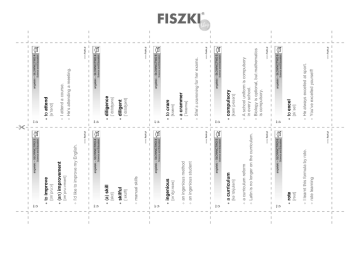 384 402 402 387 393 www.fiszki.pl ° He always excelled at sport. ° You’ve excelled yourself! ° I learnt this formula by rote. ° rote learning [ɪk`sel] • to excel 397 is compulsory. • rote [rəut] www.fiszki.pl www.fiszki.pl www.fiszki.pl ° Biology is optional, but mathematics in every school. ° A school uniform is compulsory [kəm`pʌlsərɪ] ° a curriculum reform ° Latin is no longer on the curriculum. 405 www.fiszki.pl ° She’s cramming for her exams. [`kræmə] • a crammer [kræm] • to cram www.fiszki.pl • compulsory www.fiszki.pl 401 [`dɪlɪʤənt] www.fiszki.pl • a curriculum [kə`rɪkjuləm] ° an ingenious method ° an ingenious student [ɪn`ʤi:nɪəs] • ingenious ° manual skills [`skɪlfl] • diligent [`dɪlɪʤəns] • skilful 394 • diligence www.fiszki.pl www.fiszki.pl ° I attend a course. ° He’s attending a meeting. [ə`tənd] • to attend • (a) skill [skɪl] ° I’d like to improve my English. [ɪm`pru:vmənt] • (an) improvement [ɪm`pru:v] • to improve 372 372 397 405 401 394 (także ironicznie) www.fiszki.pl (często bez zrozumienia) ° nauka pamięciowa na pamięć. ° Nauczyłem się tego wzoru ° On zawsze wyróżniał się w sporcie. ° Przeszedłeś samego siebie! 402 • na pamięć; z pamięci www.fiszki.pl • wyróżniać się; prześcigać matematyka – obowiązkowa. ° Biologia jest fakultatywna, ale nauczania. www.fiszki.pl www.fiszki.pl ° reforma programu nauczania ° Łaciny nie ma już w programie ° Mundurek szkolny jest obowiązkowy w każdej szkole. • program nauczania 402 www.fiszki.pl www.fiszki.pl www.fiszki.pl • obowiązkowy www.fiszki.pl ° pomysłowa metoda ° pomysłowy student • intensywny kurs ° Ona zakuwa do egzaminów. • pomysłowy • kuć; zakuwać (uczyć się dużej ilości materiału w krótkim czasie) 387 ° zdolności manualne • zręczny; umiejętny • pilny; pracowity 393 • zręczność; umiejętność www.fiszki.pl www.fiszki.pl ° Chciałbym poprawić swój angielski. • ulepszenie; poprawa • ulepszać; poprawiać • pilność; pracowitość ° Uczęszczam na kurs. ° On uczestniczy w spotkaniu. • uczęszczać; uczestniczyć 384