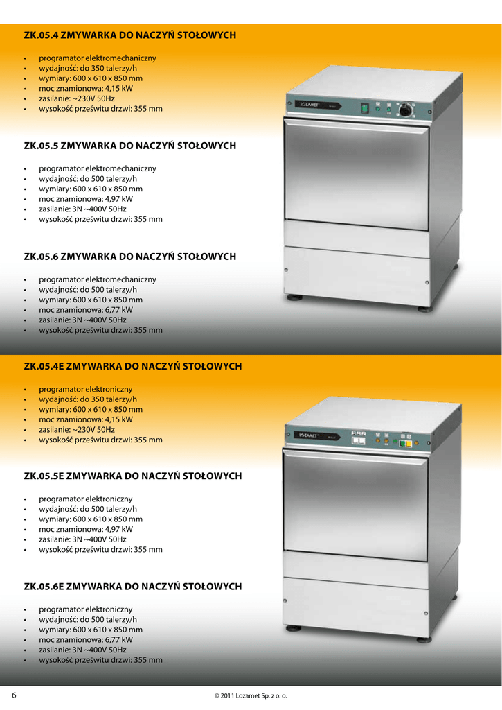 ZK.05.4 Zmywarka do naczyń stołowych • • • • • • programator elektromechaniczny wydajność: do 350 talerzy/h wymiary: 600 x 610 x 850 mm moc znamionowa: 4,15 kW zasilanie: ~230V 50Hz wysokość prześwitu drzwi: 355 mm ZK.05.5 Zmywarka do naczyń stołowych • • • • • • programator elektromechaniczny wydajność: do 500 talerzy/h wymiary: 600 x 610 x 850 mm moc znamionowa: 4,97 kW zasilanie: 3N ~400V 50Hz wysokość prześwitu drzwi: 355 mm ZK.05.6 Zmywarka do naczyń stołowych • • • • • • programator elektromechaniczny wydajność: do 500 talerzy/h wymiary: 600 x 610 x 850 mm moc znamionowa: 6,77 kW zasilanie: 3N ~400V 50Hz wysokość prześwitu drzwi: 355 mm ZK.05.4E Zmywarka do naczyń stołowych • • • • • • programator elektroniczny wydajność: do 350 talerzy/h wymiary: 600 x 610 x 850 mm moc znamionowa: 4,15 kW zasilanie: ~230V 50Hz wysokość prześwitu drzwi: 355 mm ZK.05.5E Zmywarka do naczyń stołowych • • • • • • programator elektroniczny wydajność: do 500 talerzy/h wymiary: 600 x 610 x 850 mm moc znamionowa: 4,97 kW zasilanie: 3N ~400V 50Hz wysokość prześwitu drzwi: 355 mm ZK.05.6e Zmywarka do naczyń stołowych • • • • • • 6 programator elektroniczny wydajność: do 500 talerzy/h wymiary: 600 x 610 x 850 mm moc znamionowa: 6,77 kW zasilanie: 3N ~400V 50Hz wysokość prześwitu drzwi: 355 mm © 2011 Lozamet Sp. z o. o. ZK.07.4e Zmywarka do naczyń stołowych • • • • • • • NOWO ŚĆ programator elektroniczny wydajność: do 350 talerzy/h wymiary: 600 x 600 x 850 mm moc znamionowa: 4,27kW zasilanie: ~230V 50Hz wysokość prześwitu drzwi: 385 mm pompa podnosząca ciśnienie - opcja ZK.07.5e Zmywarka do naczyń stołowych • • • • • • • programator elektroniczny wydajność: do 500 talerzy/h wymiary: 600 x 600 x 850 mm moc znamionowa: 5,09 kW zasilanie: 3N ~400V 50Hz wysokość prześwitu drzwi: 385 mm pompa podnosząca ciśnienie - opcja ZK.07.6e Zmywarka do naczyń stołowych • • • • • • • programator elektroniczny wydajność: do 500 talerzy/h wymiary: 600 x 600 x 850 mm moc znamionowa: 6,89 kW zasilanie: 3N ~400V 50Hz wysokość prześwitu drzwi: 385 mm pompa podnosząca ciśnienie - opcja ZK.07.4Ep Zmywarka do naczyń stołowych • • • • • • • • programator elektroniczny pompa spustowa wody wydajność: do 350 talerzy/h wymiary: 600 x 600 x 850 mm moc znamionowa: 4,27kW zasilanie: ~230V 50Hz wysokość prześwitu drzwi: 385 mm pompa podnosząca ciśnienie - opcja NOWO ŚĆ ZK.07.5Ep Zmywarka do naczyń stołowych • • • • • • • • programator elektroniczny pompa spustowa wody wydajność: do 500 talerzy/h wymiary: 600 x 600 x 850 mm moc znamionowa: 5,09 kW zasilanie: 3N ~400V 50Hz wysokość prześwitu drzwi: 385 mm pompa podnosząca ciśnienie - opcja ZK.07.6ep Zmywarka do naczyń stołowych • • • • • • • • programator elektroniczny pompa spustowa wody wydajność: do 500 talerzy/h wymiary: 600 x 600 x 850 mm moc znamionowa: 6,89 kW zasilanie: 3N ~400V 50Hz wysokość prześwitu drzwi: 385 mm pompa podnosząca ciśnienie - opcja © 2011 Lozamet Sp. z o. o. 7 LO 346 Podstawa do zmywarki zk • przykładowe zestawienie: zmywarka ZK.05.5 na podstawie LO 346 wymiary: 610 x 555 x 500 mm zabudowa ze zlewem zmywarki zk • 8 program produkcji wyposażenia pomocniczego zawarty jest w katalogu „Meble nierdzewne dla gastronomii” – Grupa 300 © 2011 Lozamet Sp. z o. o. ZKs.06.2 Zmywarka do naczyń szklanych • • • • • • • programator elektromechaniczny wydajność: do 600 szklanek/h wymiary: 480 x 540 x 720 mm wymiar kosza: 400 x 400 mm moc znamionowa: 3,5kW zasilanie: ~230V 50Hz wysokość prześwitu drzwi: 275 mm ZKs.06.2u Zmywarka do naczyń szklanych • • • • • • • • uzdatniacz wody zasilającej programator elektromechaniczny wydajność: do 600 szklanek/h wymiary: 480 x 540 x 720 mm wymiar kosza: 400 x 400 mm moc znamionowa: 3,5kW zasilanie: ~230V 50Hz wysokość prześwitu drzwi: 275 mm Zmywarki ZKS przeznaczone są głównie do zmywania naczyń szklanych. Istotną dla użytkownika zaletą jest możliwość schładzania umytych naczyń zimną wodą. Zmywarka ZKS-06.2U wyposażona jest fabryczne w uzdatniacz wody zasilającej LO 345 Podstawa do zmywarki zks • przykładowe zestawienie: zmywarka ZKS-06.2u na podstawie LO 345 495 x 530 x 500 mm © 2011 Lozamet Sp. z o. o. 9