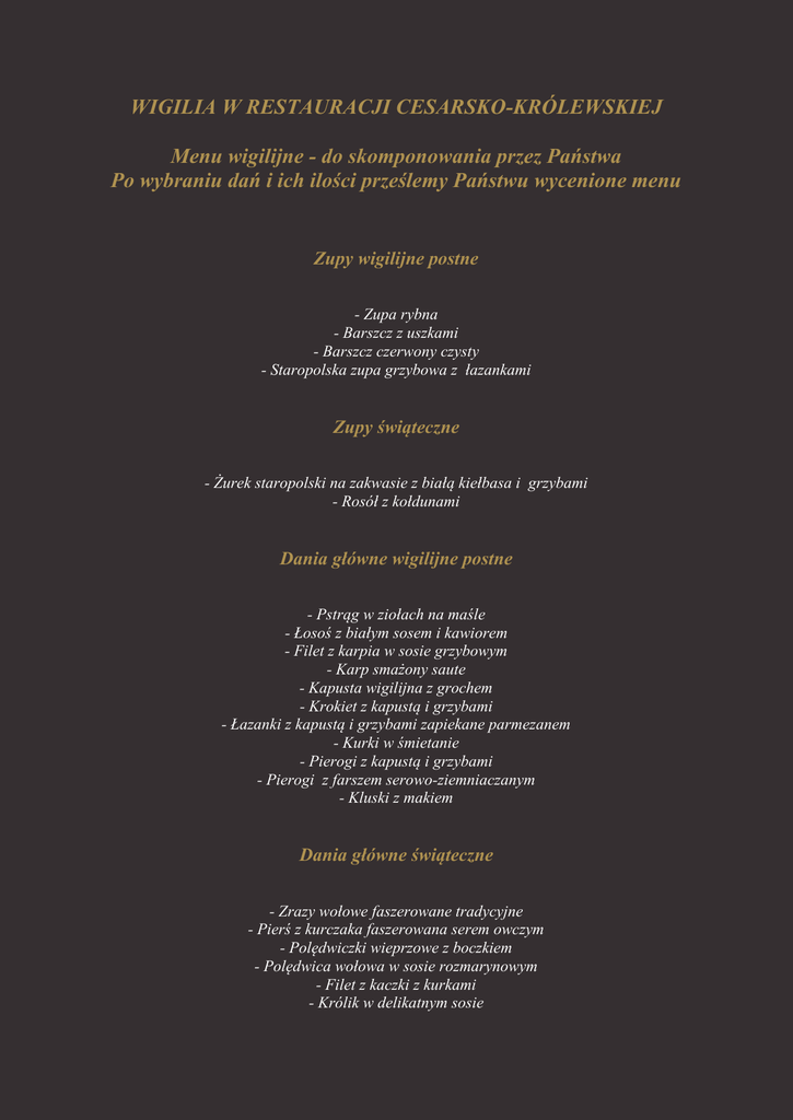WIGILIA W RESTAURACJI CESARSKO-KRÓLEWSKIEJ Menu wigilijne - do skomponowania przez Państwa Po wybraniu dań i ich ilości prześlemy Państwu wycenione menu Zupy wigilijne postne - Zupa rybna - Barszcz z uszkami - Barszcz czerwony czysty - Staropolska zupa grzybowa z łazankami Zupy świąteczne - Żurek staropolski na zakwasie z białą kiełbasa i grzybami - Rosół z kołdunami Dania główne wigilijne postne - Pstrąg w ziołach na maśle - Łosoś z białym sosem i kawiorem - Filet z karpia w sosie grzybowym - Karp smażony saute - Kapusta wigilijna z grochem - Krokiet z kapustą i grzybami - Łazanki z kapustą i grzybami zapiekane parmezanem - Kurki w śmietanie - Pierogi z kapustą i grzybami - Pierogi z farszem serowo-ziemniaczanym - Kluski z makiem Dania główne świąteczne - Zrazy wołowe faszerowane tradycyjne - Pierś z kurczaka faszerowana serem owczym - Polędwiczki wieprzowe z boczkiem - Polędwica wołowa w sosie rozmarynowym - Filet z kaczki z kurkami - Królik w delikatnym sosie Dodatki do dań głównych - Ziemniaki pieczone ziołowe - Ziemniaki puree z masełkiem - Kasza gryczana - Kluski śląskie - Warzywa na parze z masełkiem - Brukselka z masełkiem i bułką tartą - Mix sałat - Kapusta zasmażana biała - Kapusta zasmażana czerwona - Buraczki na ciepło - Sos z leśnych grzybów ze śmietaną Przekąski wigilijne postne - Śledź po tatarsku - Śledź w oleju - Śledź w śmietanie - Tatar z łososia - Tatar ze śledzia - Ryba po grecku - Karp w galarecie Przekąski świąteczne - Indyk w ziołach - Rostbef pieczony - Pasztet świąteczny z żurawiną - Karczek pieczony szpikowany czosnkiem - Rolada z boczku pieczona - Galaretki drobiowe - Schab ze śliwka - Bigos staropolski - Szynka pieczona w miodzie - Plater wędlin wędzonych Dodatki do przekąsek - Pikle ( pieczarki ,ogórki, papryka) - Sosy : czosnkowy, tatarski, chrzanowy - Pieczywo, masło Sałatki świąteczne - Sałatka z jajek przepiórczych - Tradycyjna sałatka jarzynowa - Sałatka po żydowsku - Sałatka z tuńczykiem - Sałatka grecka Ciasta i desery świąteczne - Kutia - Makowiec - Sernik - Keks - Jabłecznik - Tort czekoladowy - Tort węgierski - Kompot z suszu - Kawa, herbata