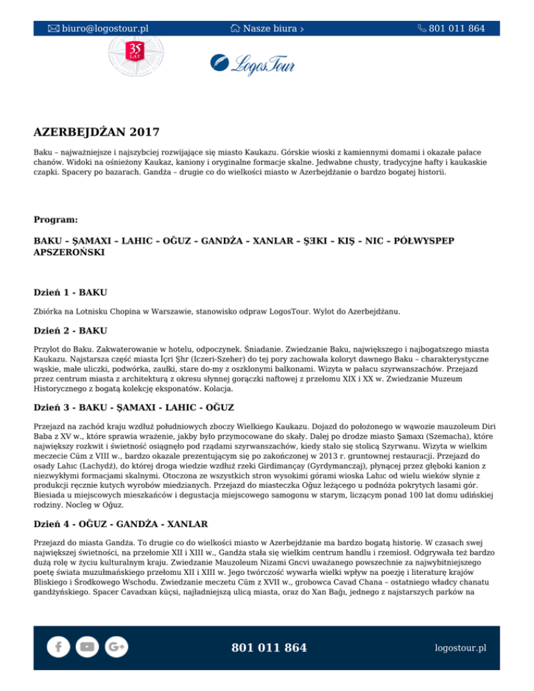 [email protected] Nasze biura 801 011 864 AZERBEJDŻAN 2017 Baku – najważniejsze i najszybciej rozwijające się miasto Kaukazu. Górskie wioski z kamiennymi domami i okazałe pałace chanów. Widoki na ośnieżony Kaukaz, kaniony i oryginalne formacje skalne. Jedwabne chusty, tradycyjne hafty i kaukaskie czapki. Spacery po bazarach. Gandża – drugie co do wielkości miasto w Azerbejdżanie o bardzo bogatej historii. Program: BAKU – ŞAMAXI – LAHIC – OĞUZ – GANDŻA – XANLAR – ŞƎKI – KIŞ – NIC – PÓŁWYSPEP APSZEROŃSKI Dzień 1 - BAKU Zbiórka na Lotnisku Chopina w Warszawie, stanowisko odpraw LogosTour. Wylot do Azerbejdżanu. Dzień 2 - BAKU Przylot do Baku. Zakwaterowanie w hotelu, odpoczynek. Śniadanie. Zwiedzanie Baku, największego i najbogatszego miasta Kaukazu. Najstarsza część miasta İçri Şhr (Iczeri-Szeher) do tej pory zachowała koloryt dawnego Baku – charakterystyczne wąskie, małe uliczki, podwórka, zaułki, stare do-my z oszklonymi balkonami. Wizyta w pałacu szyrwanszachów. Przejazd przez centrum miasta z architekturą z okresu słynnej gorączki naftowej z przełomu XIX i XX w. Zwiedzanie Muzeum Historycznego z bogatą kolekcję eksponatów. Kolacja. Dzień 3 - BAKU - ŞAMAXI - LAHIC - OĞUZ Przejazd na zachód kraju wzdłuż południowych zboczy Wielkiego Kaukazu. Dojazd do położonego w wąwozie mauzoleum Diri Baba z XV w., które sprawia wrażenie, jakby było przymocowane do skały. Dalej po drodze miasto Şamaxı (Szemacha), które największy rozkwit i świetność osiągnęło pod rządami szyrwanszachów, kiedy stało się stolicą Szyrwanu. Wizyta w wielkim meczecie Cüm z VIII w., bardzo okazale prezentującym się po zakończonej w 2013 r. gruntownej restauracji. Przejazd do osady Lahıc (Lachydż), do której droga wiedzie wzdłuż rzeki Girdimançay (Gyrdymanczaj), płynącej przez głęboki kanion z niezwykłymi formacjami skalnymi. Otoczona ze wszystkich stron wysokimi górami wioska Lahıc od wielu wieków słynie z produkcji ręcznie kutych wyrobów miedzianych. Przejazd do miasteczka Oğuz leżącego u podnóża pokrytych lasami gór. Biesiada u miejscowych mieszkańców i degustacja miejscowego samogonu w starym, liczącym ponad 100 lat domu udińskiej rodziny. Nocleg w Oğuz. Dzień 4 - OĞUZ - GANDŻA - XANLAR Przejazd do miasta Gandża. To drugie co do wielkości miasto w Azerbejdżanie ma bardzo bogatą historię. W czasach swej największej świetności, na przełomie XII i XIII w., Gandża stała się wielkim centrum handlu i rzemiosł. Odgrywała też bardzo dużą rolę w życiu kulturalnym kraju. Zwiedzanie Mauzoleum Nizami Gncvi uważanego powszechnie za najwybitniejszego poetę świata muzułmańskiego przełomu XII i XIII w. Jego twórczość wywarła wielki wpływ na poezję i literaturę krajów Bliskiego i Środkowego Wschodu. Zwiedzanie meczetu Cüm z XVII w., grobowca Cavad Chana – ostatniego władcy chanatu gandżyńskiego. Spacer Cavadxan küçsi, najładniejszą ulicą miasta, oraz do Xan Bağı, jednego z najstarszych parków na 801 011 864 logostour.pl [email protected] Nasze biura 801 011 864 Kaukazie, w którego centralnej części posadzono aleję platanów. Przejazd do miejscowości Xanlar – dawnej niemieckiej kolonii Helenendorf, założonej na początku XIX w., która do dziś zachowała starą zabudowę. Znajduje się tam okazały kościół protestancki. Kolacja. Nocleg w Şəmkir. Dzień 5 - ŞƎKI - KIŞ Przejazd do miasta Şəki (Szeki), jednego z najstarszych i najbardziej malowniczo położonych miast Azerbejdżanu. Od lat przyciąga turystów ciekawymi zabytkami, wyrobami rzemiosła, a także lokalną kuchnią. Zwiedzanie Şəki xan sarayı (pałac chanów szekijskich) z XVIII w., gdzie oprócz pięknej fasady uwagę przyciągają dwa imponujące platany posadzone w 1530 r. Atmosferę pałacu tworzą znajdujące się wewnątrz malowidła o intensywnej kolorystyce i barwne okna. Wizyta w centrum tradycyjnych rzemiosł, gdzie można obejrzeć i kupić m.in. piękne jedwabne chusty, hafty, kaukaskie czapki. Zwiedzanie zabytkowego karawanseraju z XVIII w. przekształconego w hotel, a następnie pięknych wnętrz Şkixanovların evi z XVIII w., domu należącego ongiś do rodziny szekijskich chanów. Możliwość zakupów w sklepach ze słodyczami oraz w sklepie firmowym przy kombinacie jedwabniczym w Şəki. Od wieków Şəki słynie z produkcji jedwabiu. Kupcy z różnych krajów przyjeżdżali tu, by kupić miejscowe tkaniny jedwabne. Przejazd do miejscowości Kiş (Kisz), gdzie można zwiedzić najstarszą chrześcijańską świątynię na Kaukazie, malowniczo położoną wśród strzelistych gór. Kolacja. Nocleg w Şəki. Dzień 6 - ŞƎKI - NIC - BAKU Przejazd do Baku. Wizyta w cerkwi Cotari (Dżotari) w miejscowości Nic (Nidż). To jedyna wieś w Azerbejdżanie w większości zamieszkiwana przez Udinów, potomków kaukaskich Albanów. Wizyta w winiarskiej firmie Agro-Azerinvest (dla chętnych za dodatkową opłatą degustacja win i koniaków). Przejazd do malowniczo położonego ośrodka turystycznego będącego bazą sportów zimowych Tufan Dağ. Wjazd kolejką linową na wysokość 1920 m. Postój nieopodal wioski Vndam na przydrożnym bazarze, gdzie sprzedawane są owoce, kompoty, przyprawy, zioła lecznicze oraz słynne w całym regionie konfitury. Po przyjeździe do Baku kolacja. Dzień 7 - PÓŁWYSEP APSZEROŃSKI Zwiedzanie Półwyspu Apszerońskiego (Abşeron), na którym leży Baku. Wizyta w meczecie Əmircan, uznawanym za jeden z piękniejszych meczetów Abşeronu. Zwiedzanie Świątyni Ognia Atşgah w Suraxanı (Surachany). Następnie przejazd do Mrdkan i zwiedzanie pochodzącego z 1187 r. zamku będącego jednym z najbardziej okazałych na półwyspie. Przejazd do Şüvlan (Szuwalan) i wizyta w Mauzoleum Mir Mövsüm Ağa Ziyartgahı, które stało się miejscem kultu i pielgrzymują do niego okoliczni mieszkańcy. Kolejnym punktem na trasie zwiedzania jest Ya