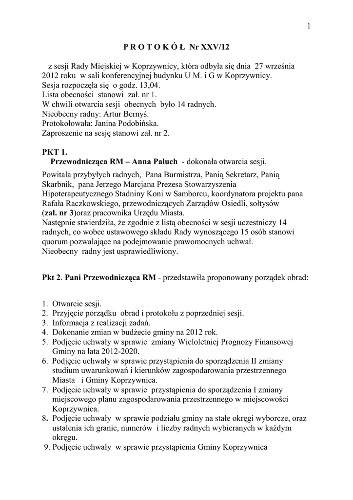 1 P R O T O K Ó Ł Nr XXV/12 z sesji Rady Miejskiej w Koprzywnicy, która odbyła się dnia 27 września 2012 roku w sali konferencyjnej budynku U M. i G w Koprzywnicy. Sesja rozpoczęła się o godz. 13,04. Lista obecności stanowi zał. nr 1. W chwili otwarcia sesji obecnych było 14 radnych. Nieobecny radny: Artur Bernyś. Protokołowała: Janina Podobińska. Zaproszenie na sesję stanowi zał. nr 2. PKT 1. Przewodnicząca RM – Anna Paluch - dokonała otwarcia sesji. Powitała przybyłych radnych, Pana Burmistrza, Panią Sekretarz, Panią Skarbnik, pana Jerzego Marcjana Prezesa Stowarzyszenia Hipoterapeutycznego Stadniny Koni w Samborcu, koordynatora projektu pana Rafała Raczkowskiego, przewodniczących Zarządów Osiedli, sołtysów (zał. nr 3)oraz pracownika Urzędu Miasta. Następnie stwierdziła, Ŝe zgodnie z listą obecności w sesji uczestniczy 14 radnych, co wobec ustawowego składu Rady wynoszącego 15 osób stanowi quorum pozwalające na podejmowanie prawomocnych uchwał. Nieobecny radny jest usprawiedliwiony. Pkt 2. Pani Przewodnicząca RM - przedstawiła proponowany porządek obrad: 1. 2. 3. 4. 5. Otwarcie sesji. Przyjęcie porządku obrad i protokołu z poprzedniej sesji. Informacja z realizacji zadań. Dokonanie zmian w budŜecie gminy na 2012 rok. Podjęcie uchwały w sprawie zmiany Wieloletniej Prognozy Finansowej Gminy na lata 2012-2020. 6. Podjęcie uchwały w sprawie przystąpienia do sporządzenia II zmiany studium uwarunkowań i kierunków zagospodarowania przestrzennego Miasta i Gminy Koprzywnica. 7. Podjęcie uchwały w sprawie przystąpienia do sporządzenia I zmiany miejscowego planu zagospodarowania przestrzennego w miejscowości Koprzywnica. 8. Podjęcie uchwały w sprawie podziału gminy na stałe okręgi wyborcze, oraz ustalenia ich granic, numerów i liczby radnych wybieranych w kaŜdym okręgu. 9. Podjęcie uchwały w sprawie przystąpienia Gminy Koprzywnica 2 Przedszkole „Pod Sosnami” do realizacji projektu pn. „Wesoły Przedszkolak” nr WND –POKL.09.01.01-26-046/12 w ramach Programu Operacyjnego Kapitał Ludzki Priorytetu IX Rozwój wykształcenia i kompetencji w regionach, Działanie 9.1 Wyrównywanie szans edukacyjnych i zapewnienie wysokiej jakości usług edukacyjnych świadczonych w systemie oświaty, Poddziałanie 9.1.1 Zmniejszanie nierówności w stopniu upowszechniania edukacji przedszkolnej. 10. Wolne wnioski i zapytania radnych. 11. Zamknięcie obrad sesji. Pani Przewodnicząca RM - zapytała o uwagi. Pani Sekretarz - Proszę Państwa, dalej poprosiła o poszerzenie dzisiejszego porządku o pkt 10 podjęcie uchwały w sprawie zmiany statutu Ekologicznego Związku Gmin Dorzecza Koprzywianki. Przedstawiona sprawa jest bardzo pilna. Pani Przewodnicząca RM - powiedziała, Ŝe pozwoliła sobie zaprosić Dyrektora Biura EZGD Koprzywianki, pan dyrektor przybędzie troszeczkę później. Nikt więcej nie zgłaszał uwag. Kto z państwa radnych jest za przyjęciem proponowanego porządku dzisiejszej sesji wraz z poprawką? Za wnioskiem głosowało 14 radnych. Pani Przewodnicząca RM - stwierdziła, Ŝe porządek dzisiejszej sesji został przyjęty. Przewodnicząca RM - zapytała o uwagi, co do protokołu z sesji z dnia 7 września 2012r ? Nikt nie zgłosił uwag. Przewodnicząca RM - zapytał, kto z państwa radnych jest za przyjęciem protokołu z sesji, która odbyła się w dniu 7 września 2012 roku? Za przyjęciem głosowało 11 radnych, przy 3 głosach wstrzymujących. 3 Przewodnicząca RM - stwierdziła, Ŝe protokół z sesji z dnia 7 września 2012 roku został przyjęty. Pkt 3. Informacja z realizacji zadań Pan Burmistrz - powiedział, Ŝe w prawdzie niewiele czasu upłynęło od ostatniej sesji, ale przedstawił kilka waŜnych spraw. Zakończono realizację zadania pod nazwą drogi dojazdowe do pól w ramach funduszu sołeckiego, w zasadzie w kaŜdej miejscowości. Pozostaje jeszcze realizacja zadań z poszczególnych osiedli po przyjęciu dzisiejszych zmian do budŜetu. Zakończono realizację zadania, droga gminna w Postronnej oraz zostały zakończone wąwozy w Niedźwicach pod względem technicznym oraz w Sośniczanach. Dzisiaj rozstrzygnięto przetarg, który był ogłaszany kolejny trzeci raz na remont Środowiskowego Domu Samopomocy w Krzcinie. Dom rozpoczyna swoją działalność od 1 października, a na czas remontu podopieczni będą się spotykać w Domu Kultury w Koprzywnicy. Kolejna sprawa, odebrano i oddano do uŜytku ścieŜkę rowerową przy zalewie w Koprzywnicy. Jest to zadanie w całości realizowane ze środków budŜetu zaplanowanych na 2012 rok. Zdaniem referującego warto pochylić się ponownie nad tym tematem, poniewaŜ jest taka potrzeba społeczna. Przy uchwalaniu budŜetu na 2013 rok naleŜy pracować nad kolejnymi sprawami. Wprowadzono wykonawcę na obiekt w Zbigniewicach, gdzie zostanie przeprowadzony remont świetlicy, równieŜ została podpisana umowa na remont zbiornika w Zbigniewicach. Dzisiaj jest bardzo ciekawy program sesji, bo uruchamia kolejne waŜne dziedziny m.in. oświatowe, wychowanie przedszkolne. Pani Przewodnicząca RM - powitała panią Dyrektor Przedszkola „Pod Sosnami” Martę Marczewską. Radna Sokołowska – Panie Burmistrzu, dalej powiedziała, Ŝe przetarg jest rozstrzygnięty, tylko na jaką kwotę? Pan Burmistrz - odpowiedział, Ŝe na wartość 82 tys. zł, a zakupy inwestycyjne prawie na 50 tys. zł. i na wyposaŜenie 50 tys. zł. Ten budynek ma swój wymiar i naleŜy się z tego cieszyć. Wydano juŜ 20 decyzji dla podopiecznych. OPS zarządza tą działalnością, bo to jest zadanie zlecone. Podpisane są porozumienia z Samborcem, Łoniowem i Klimontowem. Koordynatorzy nad tym pracują. 4 Wiceprzewodniczący RM – Kubicki - Szanowni Państwo, korzystając z okazji podziękował radnym, Ŝe udało się wyremontować kawałek drogi w wąwozie w Niedźwicach. Następnie podziękował sołtysowi i radzie sołeckiej z Niedźwic za zaangaŜowanie się, panu Burmistr