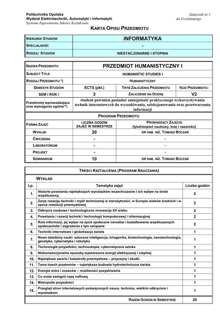 Politechnika Opolska Wydział Elektrotechniki, Automatyki i Informatyki Systemu Zapewnienia Jakości Kształcenia Załącznik nr 1 do Uczelnianego KARTA OPISU PRZEDMIOTU INFORMATYKA KIERUNEK STUDIÓW - SPECJALNOŚĆ RODZAJ STUDIÓW NIESTACJONARNE I STOPNIA PRZEDMIOT HUMANISTYCZNY I NAZWA PRZEDMIOTU SUBJECT TITLE HUMANISTIC STUDIES I RODZAJ PRZEDMIOTU *) HUMANISTYCZNY SEMESTR STUDIÓW ECTS (pkt.) TRYB ZALICZENIA PRZEDMIOTU KOD PRZEDMIOTU: SEM I ROK I 3 ZALICZENIE NA OCENĘ V2 Przedmioty wprowadzające oraz wymagania ogólne**) student powinien posiadać umiejętność praktycznego wykorzystywania technik internetowych do wyszukiwania, selekcjonowania oraz przetwarzania informacji PROGRAM PRZEDMIOTU FORMA ZAJĘĆ LICZBA GODZIN ZAJĘĆ W SEMESTRZE WYKŁAD 20 ĆWICZENIA 10 LABORATORIUM PROJEKT SEMINARIUM PROWADZĄCY ZAJĘCIA (tytuł/stopień naukowy, imię i nazwisko) DR HAB. INś. TOMASZ BOCZAR - DR HAB. INś. TOMASZ BOCZAR TREŚCI KSZTAŁCENIA (PROGRAM NAUCZANIA) WYKŁAD Lp. Tematyka zajęć Liczba godzin 1. Historie powstania największych wynalazków wszechczasów i ich wpływ na świat współczesny, 2 2. Zarys rozwoju techniki i myśli technicznej w staroŜytności, w Europie wieków średnich i w epoce rewolucji przemysłowej 2 3. Odkrycia naukowe i technologiczne innowacje XX wieku 2 4. Powstanie i rozwój techniki i technologii komputerowej i informacyjnej 2 5. Rola informacji, jej wpływ na Ŝycie społeczne narodów i kształtowanie współczesnych społeczeństw i zagroŜenia z tym związane 2 6. Techniki internetowe i globalizacja świata 1 7. Nowe dziedziny nauki: sztuczna inteligencja, kriogenika, biotechnologia, nanotechnologia, genetyka, cybernetyka i robotyka 1 8. Technologie przyszłości, technoutopie, cybernetyczna sztuka 1 9. Niekonwencjonalne sposoby wytwarzania energii elektrycznej i cieplnej 1 10. Największe awarie i katastrofy przemysłowe – przyczyny i skutki 1 11. Tama trzech przełomów – największa budowla hydrotechniczna świata 1 12. Energia mórz i oceanów – moŜliwości pozyskiwania 1 13. Co moŜe zastąpić ropę naftową 1 14. Metropolie przyszłości 1 15. Przegląd stron internetowych poświęconych nauce, technice, wielkim odkryciom i wynalazkom. RAZEM GODZIN W SEMESTRZE 1 20 PRZEDMIOT HUMANISTYCZNY I SEMINARIUM Lp. Liczba godzin Tematyka zajęć 1. MoŜliwości podboju kosmosu – kolonizacja planet 2. Statek kosmiczny, promy kosmiczne, stacje kosmiczne 3. Sztuczne Ŝycie 4. Nanotechnologie 5. Kriogenika 6. InŜynieria materiałowa, materiały przyszłości 7. Nowe produkty spoŜywcze, biotechnologie, produkcja Ŝywności, przechowywanie Ŝywności 8. Komputery przyszłości 9. Łączność satelitarna, nowe sposoby komunikowania się 10. Roboty 11. Kolej, pociągi przyszłości 12. Cybernetyczna sztuka 13. Walka z przestępczością – nowe metody śledcze, systemy penitencjarne 14. Wojna przyszłości, nowe rodzaje broni, technologie militarne 15. Samochody przyszłości, systemy samochodowe, przyszłość motoryzacji 16. Alternatywne techniki lotu, samoloty przyszłości 17. Ekologiczne domy 18. Miasta i budowle przyszłości 19. Chirurgia nieinwazyjna 20. Eksperymenty genetyczne, badanie genomu, terapia genowa 21. Sposoby przedłuŜenia Ŝycia człowieka 22. Klimat na ziemi, problem globalnego ocieplenia 23. Nowe gałęzie przemysłu 24. Nowe sposoby badania kosmosu 25. Wynalazki dla domu 26. Urządzenia ratujące Ŝycie 27. Wynalazki wykorzystywane w medycynie 28. Nowe sposoby komunikowania się z komputerem 29. Sposoby oszczędzania energii elektrycznej i cieplnej – domy zero emisyjne 30. Problem śmieci, składowanie odpadów, recycling 31. Radio i telewizja 32. Wynalazki wykorzystywane w medycynie RAZEM GODZIN W SEMESTRZE 10 ZAŁOśENIA I CELE PRZEDMIOTU: Zapoznanie z największymi wynalazkami w historii cywilizacji, przedstawienie nowych dziedzin nauki i technologii przyszłości METODY DYDAKTYCZNE: Wykład multimedialny wspomagany materiałami filmowymi FORMA I WARUNKI ZALICZENIA PRZEDMIOTU: Wykład zaliczany na zasadzie egzaminu pisemnego w formie testu wyboru lub zaliczane na podstawie rozwiązania konkretnego zadania o charakterze problemowym w formie pisemnej lub prezentacji multimedialnej LITERATURA PODSTAWOWA: Literatura: [1] Praca zbiorowa, Wielkie odkrycia. Odkrywanie świata, Wydawnictwo Inwestycje, 2005. 2 PRZEDMIOT HUMANISTYCZNY I [2] Tom Philbin, 100 najwaŜniejszych wynalazków w historii, Wydawnictwo: Amber 2005. LITERATURA UZUPEŁNIAJĄCA: [1 ] Charles Panati, Niezwykłe dzieje zwykłych rzeczy, data wyd.: 2004 , Wydawca: KsiąŜka i Wiedza, 2004. [2] Chris Oxlade, Wielkie wynalazki, Wydawca: Firma Księgarska Jacek Olesiejuk, 2005. [3] John Rockman, Nowy Renesans. Granice nauki, Wydawnictwo: Cis 2005. [4] Praca zbiorowa, Zdumiewający postęp. Od przeszłości do przyszłości, Wydawca: PANTEON, 2006. [5] George B. Dyson , Darwin wśród maszyn, Wydawnictwo: PRÓSZYŃSKI I S-KA, 2005. [6] A.K. Dewdney , Granice rozumu, Wydawnictwo: AMBER 2005. [7] Laura Smokowicz , Kłopotliwe odkrycia dziwne wynalazki, Wydawca: KREATOR,2004. [8] Luca Fraioli, HISTORIA TECHNIKI , Wydawca: Bellona, 2003. [9] Dobiesław Nazimek, Człowiek i jego technologie, Wydawca: UMCS, 2003. [10] Giovanni Di Pasquale, Historia nauki i techniki. Od prahistorii do renesansu, Wydawca: Bellona, 2002. [11] Marta Stefani, Historia nauki i techniki. Rewolucja naukowa. Wydawca: Bellona, 2002. [12] Luca Fraioli, Historia techniki. Człowiek tworzy swój świat, Wydawca: Bellona, 2003. *) niewłaściwe przekreślić – zgodnie z arkuszem planu studiów, **) podać wybrane nazwy przedmiotów stanowiących wprowadzenie/uzupełnienie do przedmiotu opisywanego, oraz zakres wiadomości/umiejętności/kompetencji jakie powinien posiadać student przed rozpoczęciem nauki tego przedmiotu; ............................................................................. ................................................. (Kierownik jednostki organizacyjnej/bezpośredni