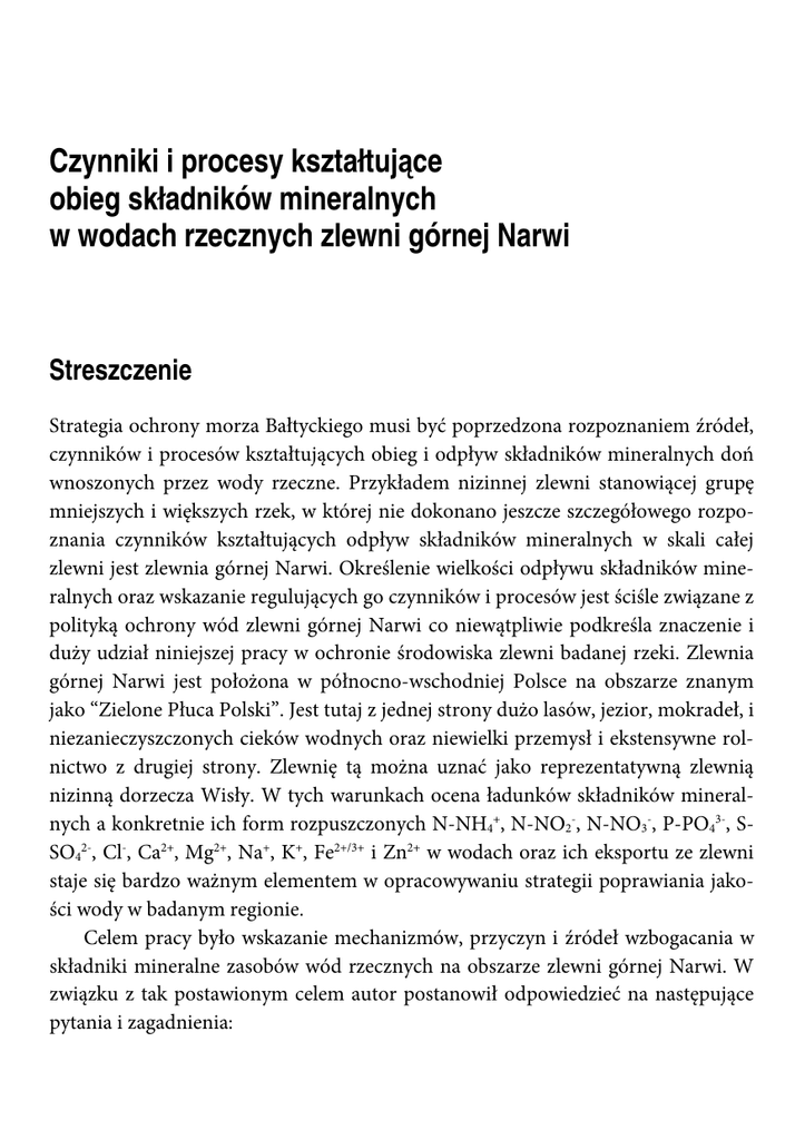 Czynniki i procesy kształtujące obieg składników mineralnych w wodach rzecznych zlewni górnej Narwi Streszczenie Strategia ochrony morza Bałtyckiego musi być poprzedzona rozpoznaniem źródeł, czynników i procesów kształtujących obieg i odpływ składników mineralnych doń wnoszonych przez wody rzeczne. Przykładem nizinnej zlewni stanowiącej grupę mniejszych i większych rzek, w której nie dokonano jeszcze szczegółowego rozpoznania czynników kształtujących odpływ składników mineralnych w skali całej zlewni jest zlewnia górnej Narwi. Określenie wielkości odpływu składników mineralnych oraz wskazanie regulujących go czynników i procesów jest ściśle związane z polityką ochrony wód zlewni górnej Narwi co niewątpliwie podkreśla znaczenie i duży udział niniejszej pracy w ochronie środowiska zlewni badanej rzeki. Zlewnia górnej Narwi jest położona w północno-wschodniej Polsce na obszarze znanym jako “Zielone Płuca Polski”. Jest tutaj z jednej strony dużo lasów, jezior, mokradeł, i niezanieczyszczonych cieków wodnych oraz niewielki przemysł i ekstensywne rolnictwo z drugiej strony. Zlewnię tą można uznać jako reprezentatywną zlewnią nizinną dorzecza Wisły. W tych warunkach ocena ładunków składników mineralnych a konkretnie ich form rozpuszczonych N-NH4+, N-NO2-, N-NO3-, P-PO43-, SSO42-, Cl-, Ca2+, Mg2+, Na+, K+, Fe2+/3+ i Zn2+ w wodach oraz ich eksportu ze zlewni staje się bardzo ważnym elementem w opracowywaniu strategii poprawiania jakości wody w badanym regionie. Celem pracy było wskazanie mechanizmów, przyczyn i źródeł wzbogacania w składniki mineralne zasobów wód rzecznych na obszarze zlewni górnej Narwi. W związku z tak postawionym celem autor postanowił odpowiedzieć na następujące pytania i zagadnienia: 144 Czynniki i procesy kształtujące odpływ składników mineralnych w wodach rzecznych w zlewni górnej Narwi Jakie ładunki jednostkowe składników mineralnych dostają się z powierzchni zlewni górnej Narwi do wód powierzchniowych i jaka rolę pełnią przy tym wody opadowe? Jakie czynniki i procesy rządzą tą dostawą oraz jakie są jej źródła? Jakie ładunki składników mineralnych wynoszone są przez wody powierzchniowe z badanej zlewni oraz jakie są ich źródła? Jaki wpływ na skład chemiczny wody rzek wywierają źródła powierzchniowe i punktowe składników mineralnych i procesy zachodzące w środowisku wodnym badanej zlewni? Jakie czynniki wpływają na stężenie i ładunek składników mineralnych w wodzie powierzchniowej zlewni górnej Narwi? Jakie są główne przyczyny tego wpływu? Które ładunki składników mineralnych decydują o ogólnym ładunku wynoszonym ze zlewni przez wody rzeki Narew? Czy jest możliwe i w jakim zakresie przewidywanie stężenia oraz ładunków składników mineralnych w wodach zlewni górnej Narwi na podstawie wielkości hydrologicznych, geomorfologicznych i sezonowych na tym terenie? Zaprezentowane w pracy wyniki pochodzą z badań wód opadowych, rzecznych, z rowów melioracyjnych oraz ścieków oczyszczonych odprowadzanych do badanych rzek. Badania były przeprowadzone w latach 2001-2005 na obszarze zlewni górnej Narwi. W próbkach oznaczano stężenie N-NH4+, N-NO2-, N-NO3-, PPO43-, S-SO42-, Cl-, Ca2+, Mg2+, Na+, K+, Fe2+/3+, Zn2+ oraz przewodność elektryczną i pH. Analizy chemiczne przeprowadzono za pomocą spektrofotometrów (VIS) HACH DR-2000 i DR-4000 a także za pomocą spektrometru absorpcyjnej spektrometrii atomowej (ASA) Varian typu SpectrAA-100A. Do analiz statystycznych wyników badań zastosowano szereg wielowymiarowych metod statystycznych: wielowymiarową analizę czynnikową (FA), analizę składowych głównych (PCA), analizę skupień w wersji Warda (CA) oraz sztuczne sieci neuronowe (AAN). W pracy obliczano ładunki składników mineralnych w wodach opadowych, rzecznych, melioracyjnych i ściekach oczyszczonych. W opracowaniu poszukiwano przyczyn i źródeł wzbogacania w składniki mineralne zasobów wód rzecznych na obszarze zlewni górnej Narwi. Określono w niej ładunki jednostkowe składników mineralnych dostające się z powierzchni zlewni górnej Narwi do wód powierzchniowych oraz ładunki składników mineralnych transportowane przez wody powierzchniowe w badanej zlewni i ich źródła. Określono rolę wód opadowych w kształtowaniu ogólnego ładunku składników mineralnych w wodach powierzchniowych. Porównano ładunki składników mineral- Streszczenie 145 nych wnoszone przez te wody z ładunkami wynoszonymi przez wody z systemów melioracyjnych i rzecznych. Okazało się, że procesy toczące się w zlewni działają retencyjnie w przypadku niektórych składników mineralnych. Wskazano szereg źródeł składników mineralnych w zlewni ze szczególnym uwzględnieniem źródeł antropogenicznych o charakterze punktowym i powierzchniowym. Wykazano wpływ powierzchniowych i punktowych źródeł składników mineralnych na skład chemiczny wód rzecznych i procesy zachodzące w badanych środowiskach wodnych. W pracy określono czynniki wpływające na stężenie i ładunek składników mineralnych w wodach powierzchniowych zlewni górnej Narwi. Określono ogólny ładunek składników mineralnych wynoszony ze zlewni górnej Narwi oraz tworzące go ładunki składowe. Wykonano i przetestowano modele sieci neuronowych do prognozowania stężenia i ładunków składników mineralnych na podstawie wielkości hydrologicznych, geomorfologicznych i sezonowych na tym terenie. Przeprowadzone badania wykazały a testy statystyczne potwierdziły że największy ładunek składników mineralnych spośród wszystkich dużych dopływów Narwi odpływa ze zlewni Orlanki. Zlewnia tej rzeki jest użytkowana rolniczo. Skutkuje to zwiększonym dopływem składników mineralnych z jej obszaru. Do głównych przyczyn i źródeł wzbogacania składnikami mineralnymi wód Orlanki zaliczono punktowe źródło – miasto B