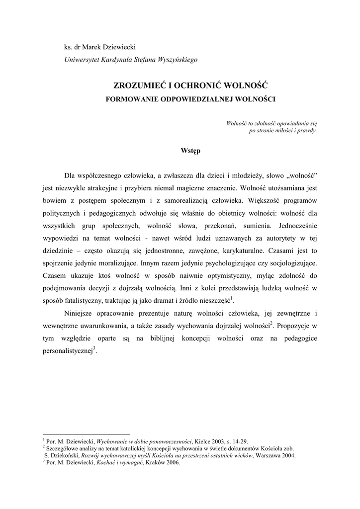 ks. dr Marek Dziewiecki Uniwersytet Kardynała Stefana Wyszyńskiego ZROZUMIEĆ I OCHRONIĆ WOLNOŚĆ FORMOWANIE ODPOWIEDZIALNEJ WOLNOŚCI Wolność to zdolność opowiadania się po stronie miłości i prawdy. Wstęp Dla współczesnego człowieka, a zwłaszcza dla dzieci i młodzieŜy, słowo „wolność” jest niezwykle atrakcyjne i przybiera niemal magiczne znaczenie. Wolność utoŜsamiana jest bowiem z postępem społecznym i z samorealizacją człowieka. Większość programów politycznych i pedagogicznych odwołuje się właśnie do obietnicy wolności: wolność dla wszystkich grup społecznych, wolność słowa, przekonań, sumienia. Jednocześnie wypowiedzi na temat wolności - nawet wśród ludzi uznawanych za autorytety w tej dziedzinie – często okazują się jednostronne, zawęŜone, karykaturalne. Czasami jest to spojrzenie jedynie moralizujące. Innym razem jedynie psychologizujące czy socjologizujące. Czasem ukazuje ktoś wolność w sposób naiwnie optymistyczny, myląc zdolność do podejmowania decyzji z dojrzałą wolnością. Inni z kolei przedstawiają ludzką wolność w sposób fatalistyczny, traktując ją jako dramat i źródło nieszczęść1. Niniejsze opracowanie prezentuje naturę wolności człowieka, jej zewnętrzne i wewnętrzne uwarunkowania, a takŜe zasady wychowania dojrzałej wolności2. Propozycje w tym względzie oparte są na biblijnej koncepcji wolności oraz na pedagogice personalistycznej3. 1 Por. M. Dziewiecki, Wychowanie w dobie ponowoczesności, Kielce 2003, s. 14-29. Szczegółowe analizy na temat katolickiej koncepcji wychowania w świetle dokumentów Kościoła zob. S. Dziekoński, Rozwój wychowawczej myśli Kościoła na przestrzeni ostatnich wieków, Warszawa 2004. 3 Por. M. Dziewiecki, Kochać i wymagać, Kraków 2006. 2 1. Wychowanek w obliczu własnej wolności Niektórzy ludzie uŜywają swojej wolności w taki sposób, Ŝe ją tracą. Człowiek jest świadomy, Ŝe posiada zdolność dokonywania wyborów. Ma wolną wolę, czyli wrodzoną zdolność autonomicznego działania. Nie znaczy to jednak, Ŝe kaŜdy z nas Ŝyje w wolności, gdyŜ rozwój i realizacja tej wrodzonej zdolności nie następuje w sposób automatyczny. Wymaga trudu wychowania i samowychowania oraz spełnienia określonych warunków. W przeciwnym przypadku poszczególni ludzie, a nawet całe społeczeństwa, mogą Ŝyć w róŜnych formach zniewolenia zewnętrznego lub wewnętrznego. Wolność jest ograniczana wszelkimi formami ignorancji, alienacji i zniewolenia. Zaprzeczeniem wolności jest podporządkowanie się określonym osobom, instytucjom czy systemom władzy. Ale zaprzeczeniem wolności jest takŜe sytuacja, w której człowiek okazuje się zniewolony wewnętrznie: własną cielesnością, emocjonalnością, niewiedzą czy brakiem odpowiedzialności, własnymi iluzjami, słabościami, lękami czy uzaleŜnieniami4. Od strony pozytywnej wolność to zdolność podejmowania decyzji w oparciu o świadomość tego, co się czyni oraz o świadomość motywów, dla których się to czyni, a takŜe w oparciu o rozeznanie skutków własnego postępowania. Wolność ludzka nie oznacza dowolności działania, gdyŜ realizuje się w ramach konkretnych moŜliwości materialnych, fizycznych, intelektualnych, psychicznych, moralnych, duchowych i społecznych. Ponadto wolność jest bezpośrednio związana ze statusem osoby, która nie Ŝyje jedynie w świecie przyrodniczych praw czy innych uwarunkowań, gdzie nie ma miejsca na podejmowanie decyzji, lecz takŜe w świecie znaczeń, wartości i więzi. W tak przeŜywanym świecie jest miejsce na dokonywanie świadomych i odpowiedzialnych wyborów. W wymiarze osobistym wolność oznacza działanie w sposób nie tylko autonomiczny, lecz takŜe świadomy i odpowiedzialny. W wymiarze społecznym wolność oznacza zespół konkretnych okoliczności i warunków, które umoŜliwiają poszczególnym osobom dokonywanie indywidualnych wyborów i podejmowanie osobistych decyzji w sposób respektujący ich autonomię, ich osobiste przekonania, normy i wartości. Dane społeczeństwo czy państwo promuje wolność wtedy, gdy nie tylko gwarantuje wszystkim podstawowe prawa i swobody obywatelskie, ale wtedy, gdy jednocześnie zapewnia im realne warunki do 4 Por. M. Dziewiecki, Nowoczesna profilaktyka uzaleŜnień, Kielce 2000, s. 119-140. korzystania z wolności, np. środki materialne, wiedzę, wykształcenie, pracę, skuteczną ochronę prawną, itd. W tej sytuacji wolność stanowi dla kaŜdego człowieka jednocześnie dar i zadanie. Nie moŜna jej sobie zagwarantować w pełni i raz na zawsze. Samo subiektywne przekonanie danego człowieka o własnej wolności, nie jest jeszcze kryterium i gwarancją rzeczywistej wolności czy faktycznej autonomii. Wolność nie zaleŜy bowiem od subiektywnych przekonań czy emocjonalnych odczuć. KaŜdemu człowiekowi trudno jest uświadomić sobie wszystkie motywy, które nim kierują, a takŜe wszelkie formy alienacji, niewiedzy czy uległości, które zmniejszają jego niezaleŜność. Nikt z nas nie jest w pełni wolny. Nikt teŜ nie jest w sposób całkowity zniewolony. KaŜdy człowiek posiada specyficzny i sobie tylko właściwy stopień wolności. 2. Zewnętrzne zagroŜenia ludzkiej wolności W ponowoczesności ideałem jest człowiek, który panuje nad światem, ale nie panuje nad samym sobą. Wolność jako wolna wola, jako moŜliwość autonomicznego podejmowania decyzji, jest istotnym elementem ludzkiej natury. Jest teŜ wielką aspiracją człowieka. Okazuje się jednak, Ŝe wrodzone moŜliwości oraz aspiracje, by być wolnym, to jeszcze zbyt mało, aby rzeczywiście Ŝyć w wolności. Zdecydowana większość wychowanków aspiruje obecnie do Ŝycia w wolności, a jednocześnie okazuje się, Ŝe wielu z nich to ludzie zniewoleni uzaleŜnieniami i słabościami na nieznaną dotąd skalę. śycie w wolności jest bowiem moŜliwe dopiero wtedy, gdy spełnione zostaną konkretne 
