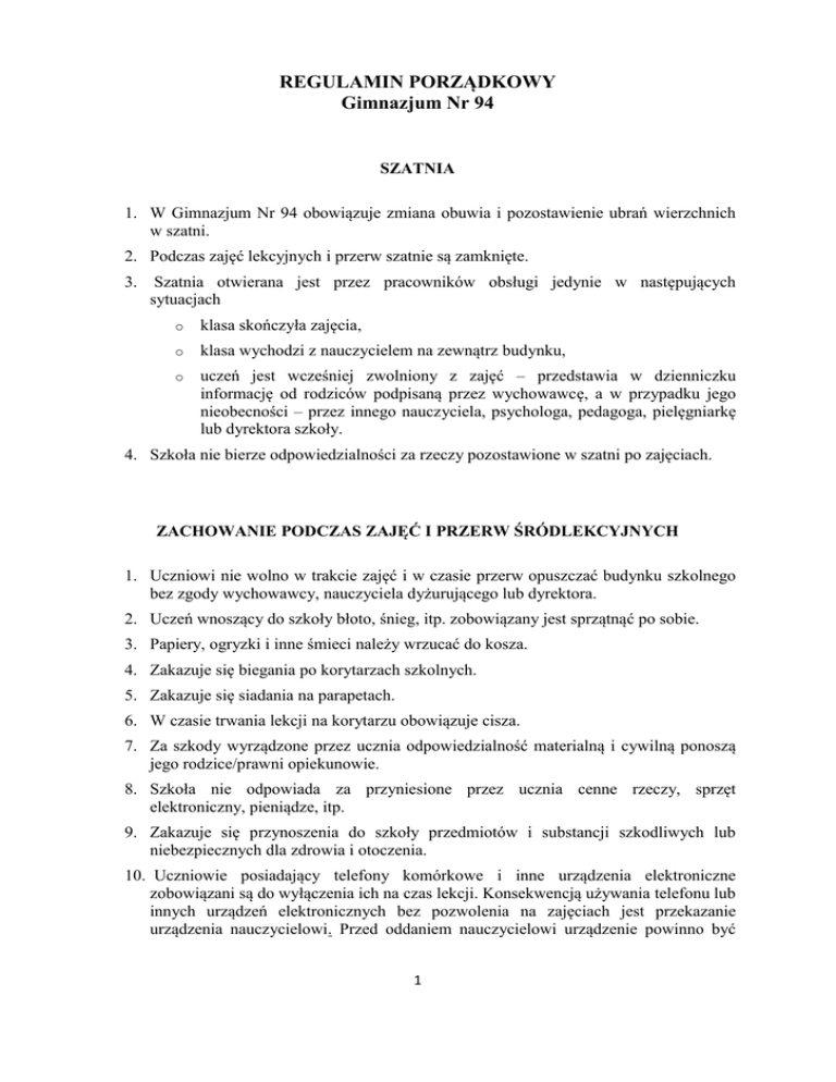 REGULAMIN PORZĄDKOWY Gimnazjum Nr 94 SZATNIA 1. W Gimnazjum Nr 94 obowiązuje zmiana obuwia i pozostawienie ubrań wierzchnich w szatni. 2. Podczas zajęć lekcyjnych i przerw szatnie są zamknięte. 3. Szatnia otwierana jest przez pracowników obsługi jedynie w następujących sytuacjach o klasa skończyła zajęcia, o klasa wychodzi z nauczycielem na zewnątrz budynku, o uczeń jest wcześniej zwolniony z zajęć – przedstawia w dzienniczku informację od rodziców podpisaną przez wychowawcę, a w przypadku jego nieobecności – przez innego nauczyciela, psychologa, pedagoga, pielęgniarkę lub dyrektora szkoły. 4. Szkoła nie bierze odpowiedzialności za rzeczy pozostawione w szatni po zajęciach. ZACHOWANIE PODCZAS ZAJĘĆ I PRZERW ŚRÓDLEKCYJNYCH 1. Uczniowi nie wolno w trakcie zajęć i w czasie przerw opuszczać budynku szkolnego bez zgody wychowawcy, nauczyciela dyżurującego lub dyrektora. 2. Uczeń wnoszący do szkoły błoto, śnieg, itp. zobowiązany jest sprzątnąć po sobie. 3. Papiery, ogryzki i inne śmieci należy wrzucać do kosza. 4. Zakazuje się biegania po korytarzach szkolnych. 5. Zakazuje się siadania na parapetach. 6. W czasie trwania lekcji na korytarzu obowiązuje cisza. 7. Za szkody wyrządzone przez ucznia odpowiedzialność materialną i cywilną ponoszą jego rodzice/prawni opiekunowie. 8. Szkoła nie odpowiada za przyniesione przez ucznia cenne rzeczy, sprzęt elektroniczny, pieniądze, itp. 9. Zakazuje się przynoszenia do szkoły przedmiotów i substancji szkodliwych lub niebezpiecznych dla zdrowia i otoczenia. 10. Uczniowie posiadający telefony komórkowe i inne urządzenia elektroniczne zobowiązani są do wyłączenia ich na czas lekcji. Konsekwencją używania telefonu lub innych urządzeń elektronicznych bez pozwolenia na zajęciach jest przekazanie urządzenia nauczycielowi. Przed oddaniem nauczycielowi urządzenie powinno być 1 wyłączone przez ucznia. Tylko rodzice/prawni opiekunowie mogą je odebrać od nauczyciela. 11. Dopuszcza się wykonywanie przez uczniów pracy społecznej na rzecz szkoły zleconej przez nauczyciela, pedagoga lub dyrektora szkoły. Praca powinna mieć charakter wychowawczy i dostosowany do możliwości psychofizycznych ucznia. PROCEDURY LEKCYJNE 1. Po dzwonku na lekcję uczniowie ustawiają się przed klasą i czekają na nauczyciela. W sytuacji, gdy nauczyciel nie przychodzi członek samorządu klasowego lub dyżurny ma obowiązek zgłosić ten fakt dyrektorowi. 2. Uczniowi nie wolno zakłócać przebiegu lekcji. 3. Wymaga się od ucznia zachowania kultury osobistej podczas lekcji. 4. Na ławce ucznia powinny znajdować się wyłącznie rzeczy niezbędne do prowadzonej aktualnie lekcji. 5. Uczniowie zobowiązani są wstać, gdy do klasy podczas lekcji wchodzi osoba dorosła. 6. Lekcja kończy się na wyraźny sygnał nauczyciela. 7. Uczniowie zobowiązani są do pozostawienia po sobie porządku w sali lekcyjnej. Za porządek w sali odpowiedzialni są dyżurni. 8. W pracowniach przedmiotowych należy dodatkowo stosować się do przepisów zawartych w odrębnych regulaminach. 9. Podczas zastępstwa decyzję, o tym jakie zajęcia edukacyjne będą realizowane, podejmuje nauczyciel wyznaczony przez dyrektora. STRÓJ SZKOLNY 1. Uczniowie przychodzą do szkoły w schludnym stroju o stonowanych kolorach. W dni ogłoszone przez dyrektora, uczniowie przychodzą w stroju galowym. Obowiązuje biała bluzka lub koszula, ciemna spódnica lub spodnie. 2. Zakazuje się noszenia w szkole ekstrawaganckich fryzur, farbowanych włosów, malowanych paznokci, kolczyków w nosie, brwiach, języku oraz dekoltów i wyeksponowanej biżuterii. Bluzki na ramiączkach oraz szorty nie są uznawane za stój odpowiedni do szkoły. 3. W szkole obowiązuje zmiana obuwia na obuwie tekstylne. Nie zezwala się noszenia butów na wysokiej podeszwie lub wysokim obcasie. W przypadku braku obuwia na zmianę, uczeń zobowiązany jest do zakupu na koszt własny ochraniaczy. 4. W sali gimnastycznej obowiązuje bezwzględny zakaz używania innego obuwia niż zmienione obuwie sportowe na jasnej podeszwie. 2 NIEOBECNOŚCI 1. Uczeń jest zobowiązany do codziennego noszenia dzienniczka. 2. Wszelka korespondencja (usprawiedliwienia) pomiędzy rodzicami a szkołą prowadzona jest w dzienniczku papierowym lub elektronicznym. Uczeń ma obowiązek przedstawić wychowawcy usprawiedliwienie najpóźniej w ciągu 7 dni od powrotu do szkoły, możliwe jest także usprawiedliwienie za pośrednictwem dziennika elektronicznego. Rodzic może usprawiedliwić ucznia na najbliższym zaplanowanym zebraniu klasowym, dniu otwartym. Po tym terminie nieobecności nie będą usprawiedliwiane. 3. Uczeń może być zwolniony z lekcji przez wychowawcę klasy lub nauczyciela, który prowadził ostatnią lekcję przed wyjściem ucznia, lub nauczyciela, z którego lekcji uczeń chce się zwolnić. Zwolnienie ucznia następuje na podstawie pisemnej informacji w dzienniczku od rodziców lub dzienniku elektronicznym. 4. Uczniowie, którzy nie uczęszczają na lekcje religii, przebywają w tym czasie w bibliotece szkolnej lub innej klasie pod opieką nauczyciela bibliotekarza lub innego nauczyciela. Jeśli religia jest pierwszą lub ostatnią lekcją w planie, na podstawie pisemnej zgody rodziców (prawnych opiekunów) uczeń może być zwalniany do domu. 5. Uczniowie zwolnieni z uczestniczenia w zajęciach z wychowania fizycznego przebywają pod opieką nauczyciela prowadzącego zajęcia w sali gimnastycznej lub innym wyznaczonym przez niego miejscu. 6. Zwolnienie ucznia z ostatniej w jego planie godziny wychowania fizycznego musi zawierać wyraźny zapis o zwolnieniu „do domu”, w innym przypadku traktuje się je jako zwolnienie z ćwiczeń, uczeń pozostaje w sali. 7. O każdym przypadku wagarów wychowawcy niezwłocznie informują rodziców ucznia. SAVOIR-VIVRE Uczeń: zachowuje się kulturalnie i zgodnie z ogólnie przyjętymi obyczajami/normami, pozdrawia wszystkich pracownik