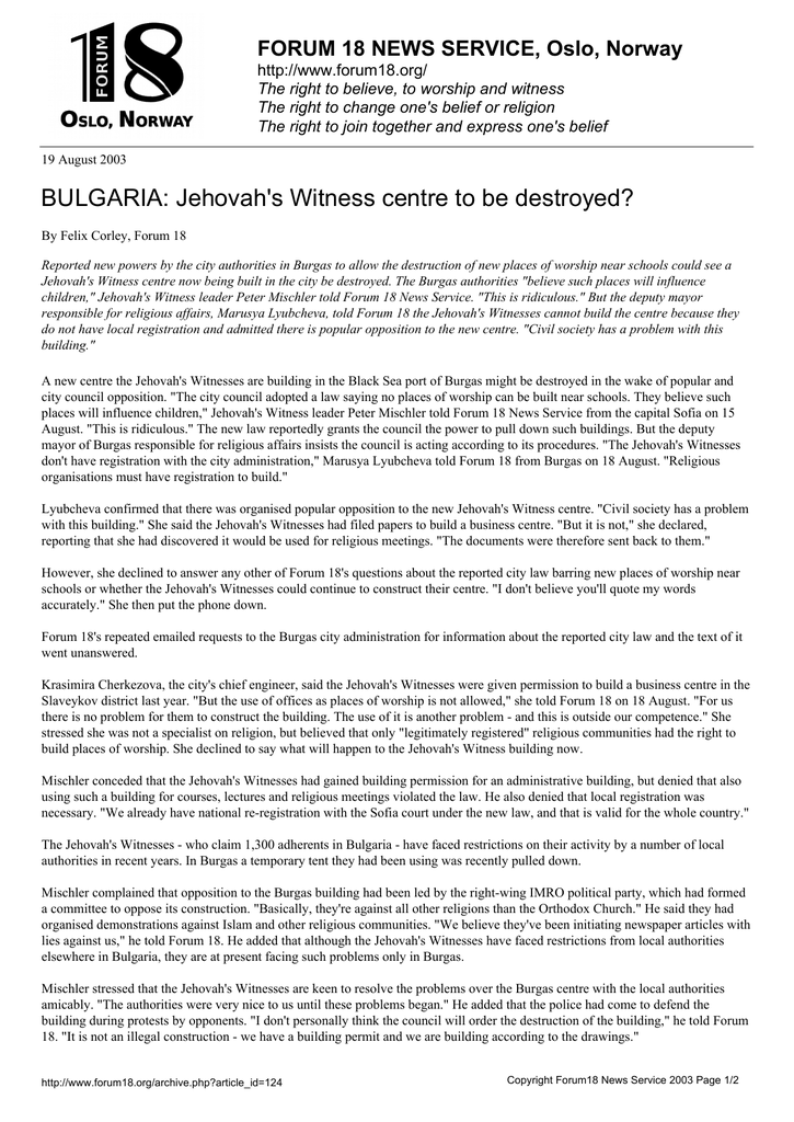 BULGARIA: Jehovah`s Witness centre to be destroyed?