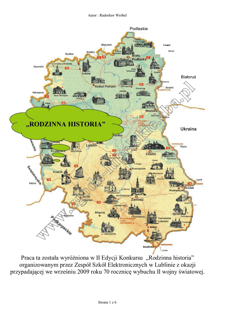 Autor : Radosław Wróbel Podlaskie Bi-:■.■■:■fi Mińsk w w w .zg od a- lu be lsk ie .cb a. pl Białoruś Lwów Praca ta została wyróżniona w II Edycji Konkursu „Rodzinna historia” organizowanym przez Zespół Szkół Elektronicznych w Lublinie z okazji przypadającej we wrześniu 2009 roku 70 rocznicę wybuchu II wojny światowej. Strona 1 z 6 Autor : Radosław Wróbel „Rodzinna historia. Opowieść o zdarzeniu z lat wojny i okupacji (1 września 1939 r. - maj 1945 r.)” Zgoda, to niewielka miejscowość województwa lubelskiego, położona w gminie Łaziska, otoczona pięknymi lasami Wrzelowieckiego Parku Krajobrazowego. Przebiega przez nią trasa Szlaku Nadwiślańskiego - jedna z najpiękniejszych pod względem krajobrazowym tras pieszych województwa lubelskiego . W tej niezwykłej miejscowości w czasie okupacji mieszkały dwie młode dziewczyny: Zosia i Rozalia. Ich wspomnienia pozwolą przybliżyć losy ówczesnych jej mieszkańców. pl Zosia w w w .zg od a- lu be lsk ie .cb a. ,,Gdy zaczęła się wojna miałam 15 lat. Pamiętam, jak spałam z siostrami na strychu były to pierwsze dni wojny. Mężczyźni ze Zgody i Kopaniny Kaliszańskiej mieli iść na wojnę i chcąc wykorzystać ostatnią noc - żegnali się ze swymi ukochanymi. Ze strychu słyszałyśmy piosenkę, którą śpiewał jeden z nich - Olek. Jej początek brzmiał: ,,Musiałem Cię zostawić, choć serce z bólu płacze, już Cię więcej nie zobaczę, już nigdy nie…” Śpiewał ją tak pięknie, że nam się łza w oku kręciła. Następnego dnia już poszedł na wojnę, a razem z nim wielu innych mężczyzn, m.in. mój brat. Musiałam przerwać naukę, ponieważ do szkoły miałam daleko, a musiałam chodzić sama.” „W 1939 roku w miejscowości Kamień zbudowano most na Wiśle. Miał być poświęcony dnia 29 czerwca następnego roku, jednak gdy Polacy dowiedzieli się, że Niemcy zmierzają w tę stronę, spalili most. Niemcy mimo trudności przedostali się przez rzekę i dotarli do tych okolic.” [Według źródeł 9 września 1939r. Niemcy zajęli most w Puławach ]. „Kilka dni po rozpoczęciu wojny, Niemcy zaczęli bombardować miejscowości położone nad Wisłą, zmuszając ludność z wsi Piotrawin i Kamień do opuszczenia domów. Niektórzy z nich przyszli na Zgodę. Wśród nich był ksiądz i organista dysponujący lornetką, za pomocą której starał się ocenić sytuacją walk z Niemcami. Msze Święte były odprawiane w jednym z domów, mieszkańcy Zgody mieli również możliwość spowiedzi. Od czasów ucieczki ludności z nadwiślańskich miejscowości Niemcy zaczęli zrzucać pociski na Zgodę i okolice. Schowaliśmy się do piwnicy, jak wiele innych osób” - mówi babcia. „Jeden z mieszkańców, walczących za Ojczyznę, skorzystał z okazji, że jest blisko swej miejscowości i przyszedł do domu odwiedzić rodzinę. Gdy był już prawie w domu rozpoczęły się bombardowania. Ukrył się więc w pobliskiej murowanej suszarni tytoniu. Po pewnym czasie jeden z pocisków uderzył w nią, raniąc tego człowieka w brzuch. Stanął naprzeciwko naszego okna i zakrwawiony przewrócił się - wspomina babcia. Dwoje ludzi podniosło go i podprowadziło obok muru. Jego kuzyn chciał zawieźć go do szpitala na wozie, lecz w trakcie podróży mężczyzna zmarł. Został pochowany na pobliskim cmentarzu wojskowym w Opolu Lubelskim. W tym dniu z powodu bombardowania, znów schowaliśmy się do piwnicy. Było ciasno, ponieważ wszyscy chcieli się schować; kobiety, dzieci, ludzie starsi … Powiedziano nam, że żaden pocisk nie wpadnie, bo nad piwnicą była słoma, ale w pośpiechu nikt o tym się pomyślał i to wszystko mogło się spalić”- żartuje babcia. ,,Z piwnicy wyszliśmy późno w nocy, gdy wszystko ucichło. Zjedliśmy cokolwiek i chcieliśmy schować rzeczy, które mogłyby ulec zniszczeniu, a były dla nas cenne: pościel, ubrania i maszynę do szycia - główne źródło utrzymania. Po ponownym ukryciu się przed pociskami, spędziliśmy w tym pomieszczeniu całą noc. Rankiem Tatuś zaproponował abyśmy wyszli, gdyż Niemcy, 1 Por. E. Cieszko, Zintegrowana sieć szlaków turystycznych „Krainy lessowych wąwozów”, s.53, [w:] www.naleczow.org.pl. 2 Zob.: R. Jurkowska, Historia szkoły w Kępie Piotrawińskiej, www.spkepapiotr.eu. Strona 2 z 6 Autor : Radosław Wróbel w w w .zg od a- lu be lsk ie .cb a. pl którzy byli w okolicy, mogliby nas uznać za ukrywających się szpiegów. Poszliśmy do domu i przez okno obserwowaliśmy ostatnich hitlerowców, którzy maszerowali drogą. Niektórzy z nich zatrzymali się w okolicy i urządzili sobie kuchnię polową niedaleko domów. Kilku Niemców poszło do moich sąsiadów po świnię, nie wiem czy im zapłacili za nią czy nie. Sąsiad miał prosiaka, który był inny niż wszystkie w całej wsi: chodził z nami w pole, był przy nas gdy nabijaliśmy na druty tytoń, był dla nas towarzyszem przy większości prac polowych” - z uśmiechem wspomina babcia. ,,Sąsiad sprzedał im tego prosiaka, a Niemcy przyszli do nas. Nie znaliśmy niemieckiego więc próbowaliśmy się porozumieć na inne sposoby. Mieliśmy szczęście, gdyż drogą szedł kuzyn znający ten język. Okazało się, że chcą aby im zagotować wody. Za pomocą jednego czajnika wody, oczyścili całego prosiaka. Mięso jedli na surowo z przyprawami i chcieli nas poczęstować. Baliśmy się. Moja mama powiedziała, że my lubimy, mięso smażone i Niemcy pozwolili nam je przyrządzić na swój sposób. Najedliśmy się. Nieproszeni goście zrobili sobie kawę, a potem śpiewali. Dobrze się zachowywali, nie tak jak radzieccy żołnierze, którzy często pili dużo alkoholu i zaczepiali młode dziewczęta.” ,,Innego razu, gdy już Niemcy opuścili Zgodę, przyszedł oddział partyzancki, było ich 300. Rozgościli się w stodołach mieszkańców. Przyszli i do nas, chcą sobie wywołać zdjęcia. Gdy byli w trakcie, ktoś wpadł do 