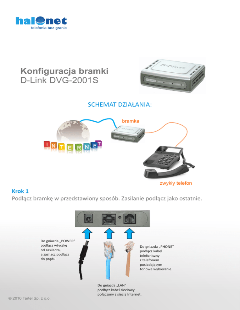 Konfiguracja bramki D-Link DVG-2001S SCHEMAT DZIAŁANIA: bramka zwykły telefon Krok 1 Podłącz bramkę w przedstawiony sposób. Zasilanie podłącz jako ostatnie. Do gniazda „POWER” podłącz wtyczkę od zasilacza, a zasilacz podłącz do prądu. Do gniazda „PHONE” podłącz kabel telefoniczny z telefonem posiadającym tonowe wybieranie. Do gniazda „LAN” podłącz kabel sieciowy połączony z siecią Internet. © 2010 Tartel Sp. z o.o. Krok 2 W swoim komputerze wybierz: Panel sterowania đ Połączenia sieciowe đ Połączenie, którego aktualnie używasz đ Właściwości a następnie zaznacz Protokół internetowy (TCP/IP) i naciśnij na Właściwości: oraz wpisz wartości zgodne z poniższymi i naciśnij OK: Uwaga! Po zakończeniu czynności należy przywrócić pierwotne ustawienia Protokółu internetowego (TCP/IP) Krok 3 Otwórz przeglądarkę sieciową i w pasku adresu wpisz: http://10.1.1.1 i naciśnij Enter. Następnie w pole User name wpisz admin, a w pole Password wpisz też admin, zaakceptuj naciskając OK. © 2010 Tartel Sp. z o.o. Krok 4 Wpisz i wybierz odpowiednie opcje zgodnie z poniższymi zrzutami ekranowymi. © 2010 Tartel Sp. z o.o. © 2010 Tartel Sp. z o.o. © 2010 Tartel Sp. z o.o. © 2010 Tartel Sp. z o.o. © 2010 Tartel Sp. z o.o. Krok 5 Aby bramka mogła uzyskać połączenie z Internetem należy prawidłowo skonfigurować protokół IP. Najczęściej należy zaznaczyć opcję "Dynamic IP Address", aby konfiguracja IP została pobrana z serwera DHCP. Jeśli jednak nie jesteś pewien czy taki serwer znajduje się w twojej sieci - skontaktuj się z administratorem w celu uzyskania szczegółowych informacji związanych z konfiguracją protokołu IP. © 2010 Tartel Sp. z o.o.